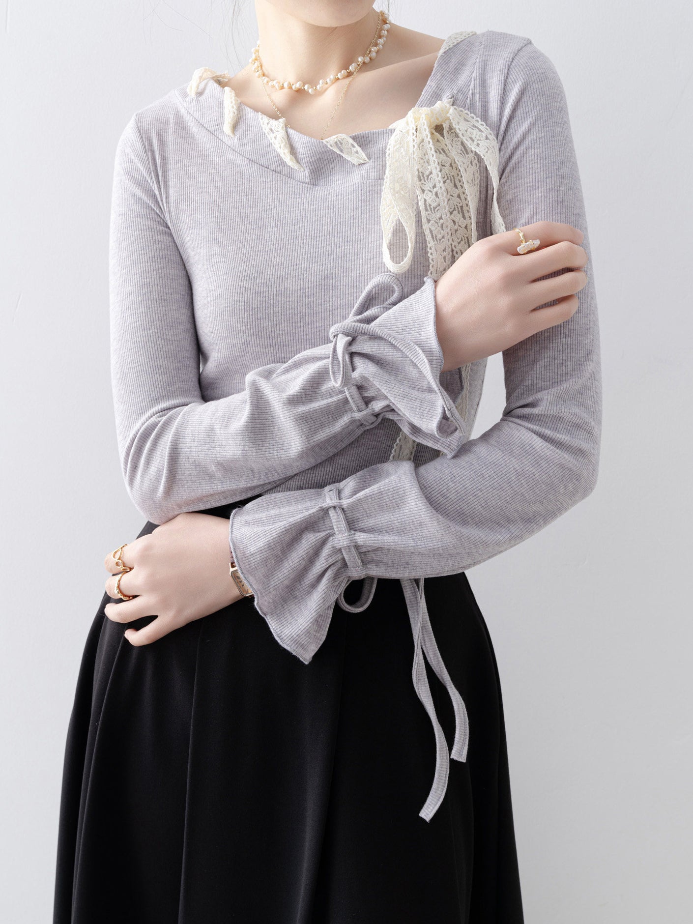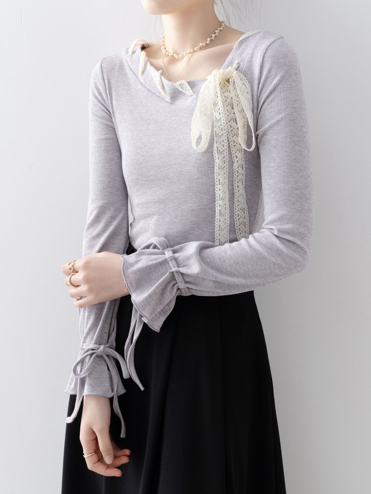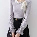 レースアップボウタイリブニット