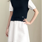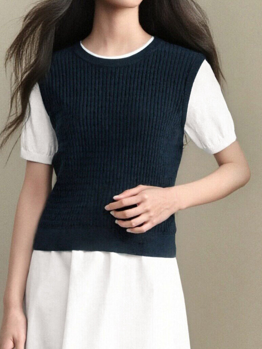 異なる色合いのパフ袖と畦編みの身頃部分を組み合わせ、スタイルを引き締めてクラシカルな印象に仕上げます。