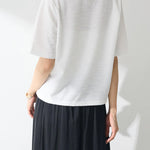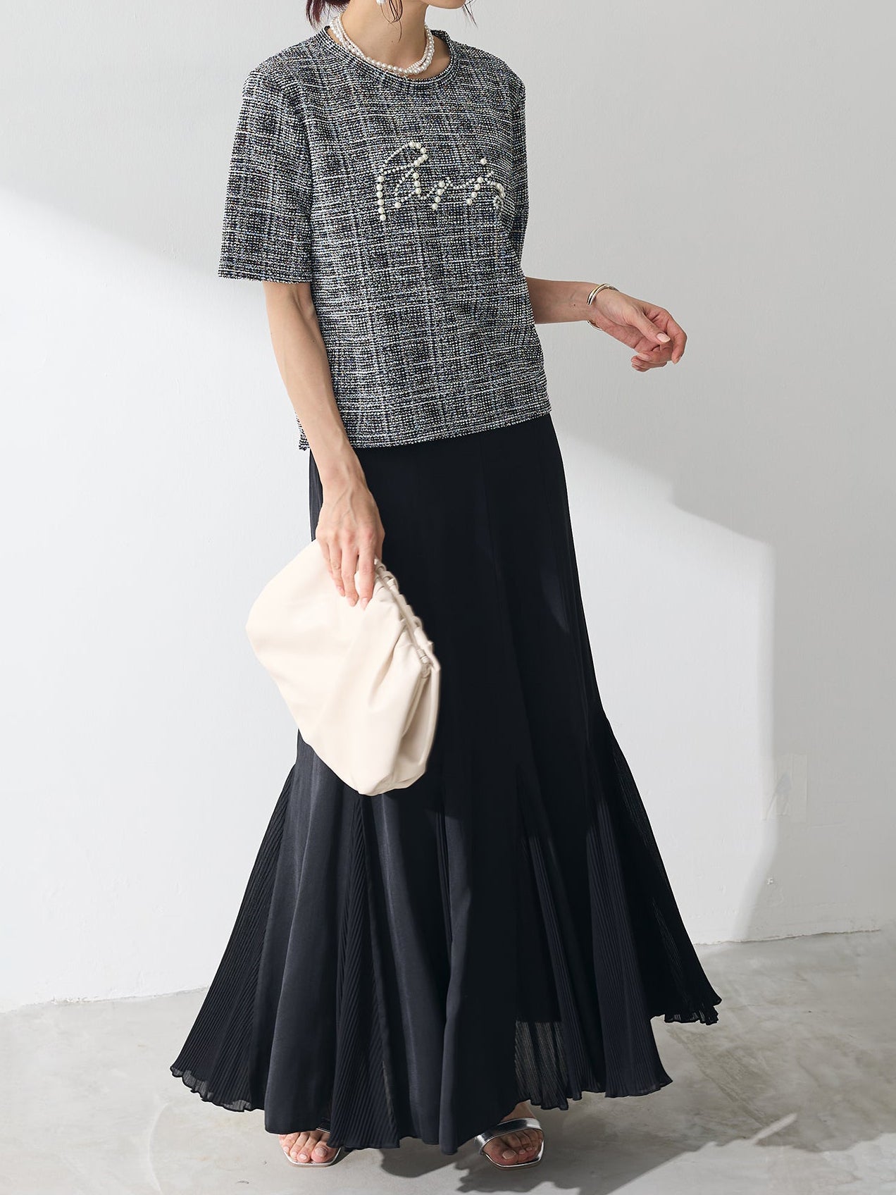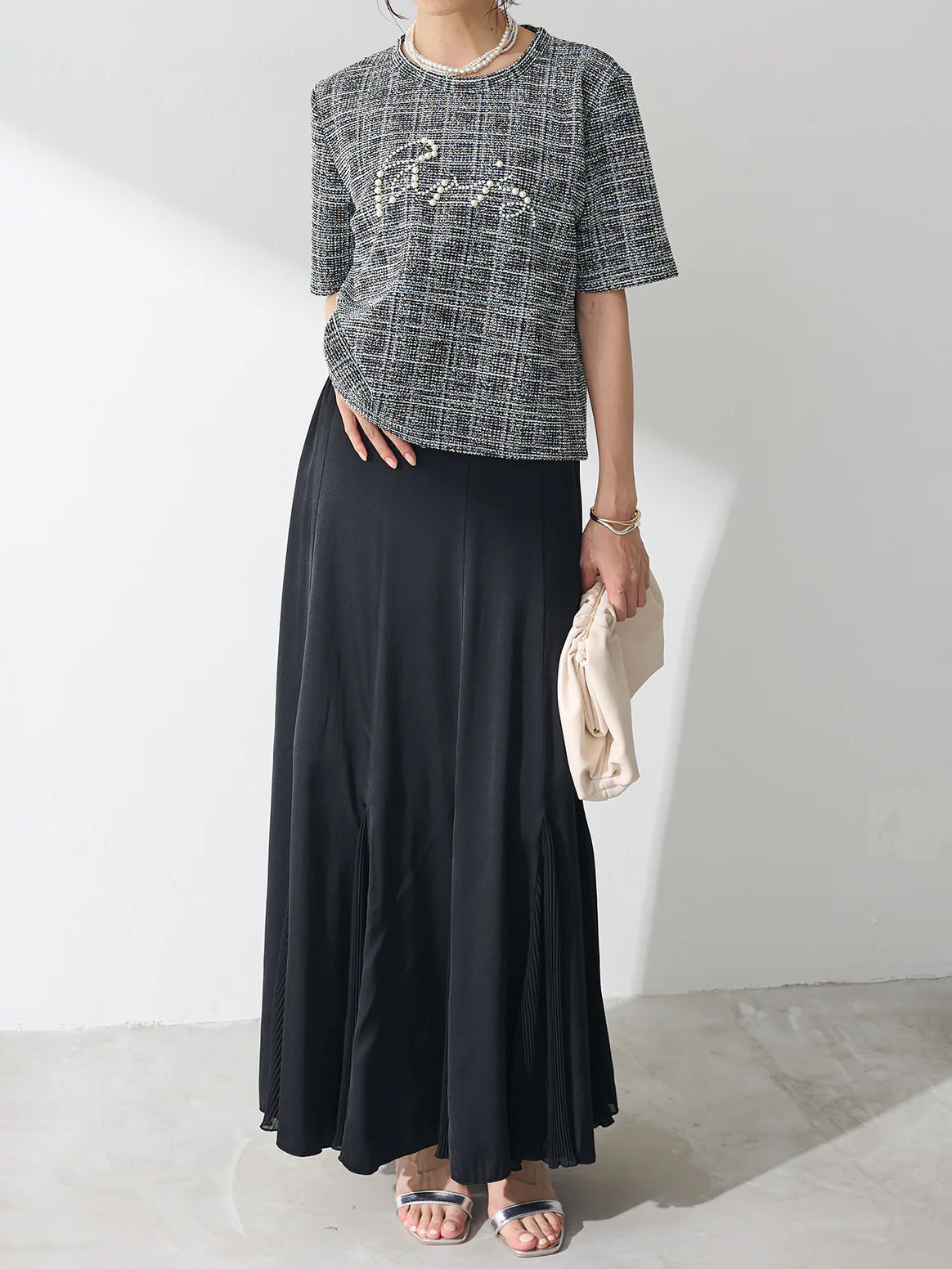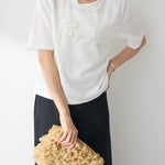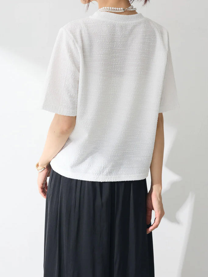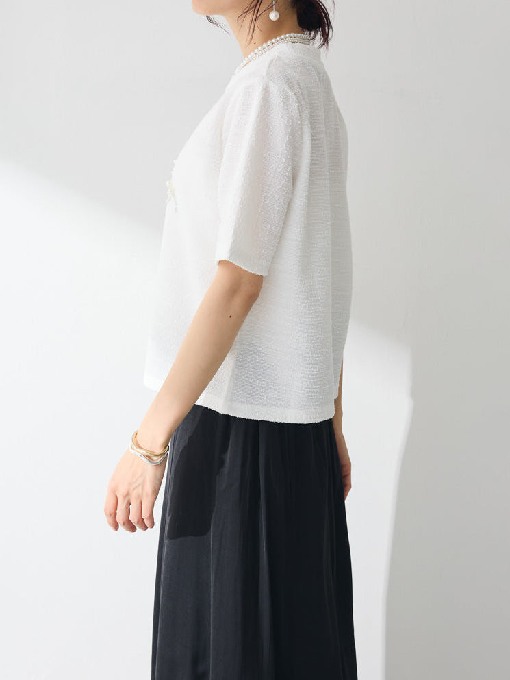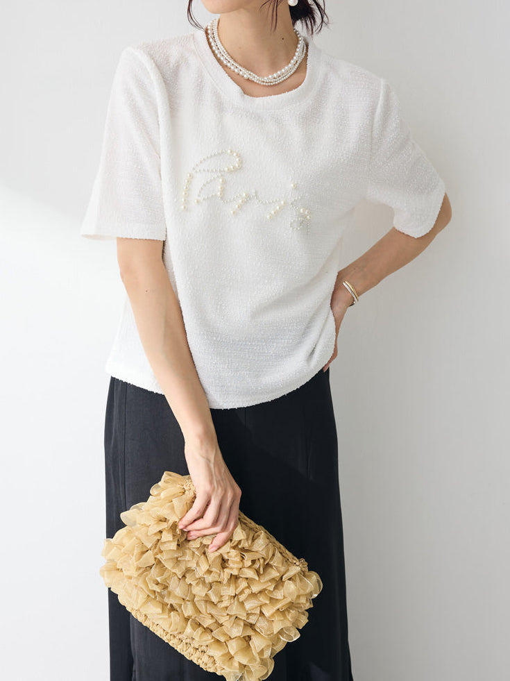 上品なツイード素材に、パールであしらったロゴが目を引くTシャツ。