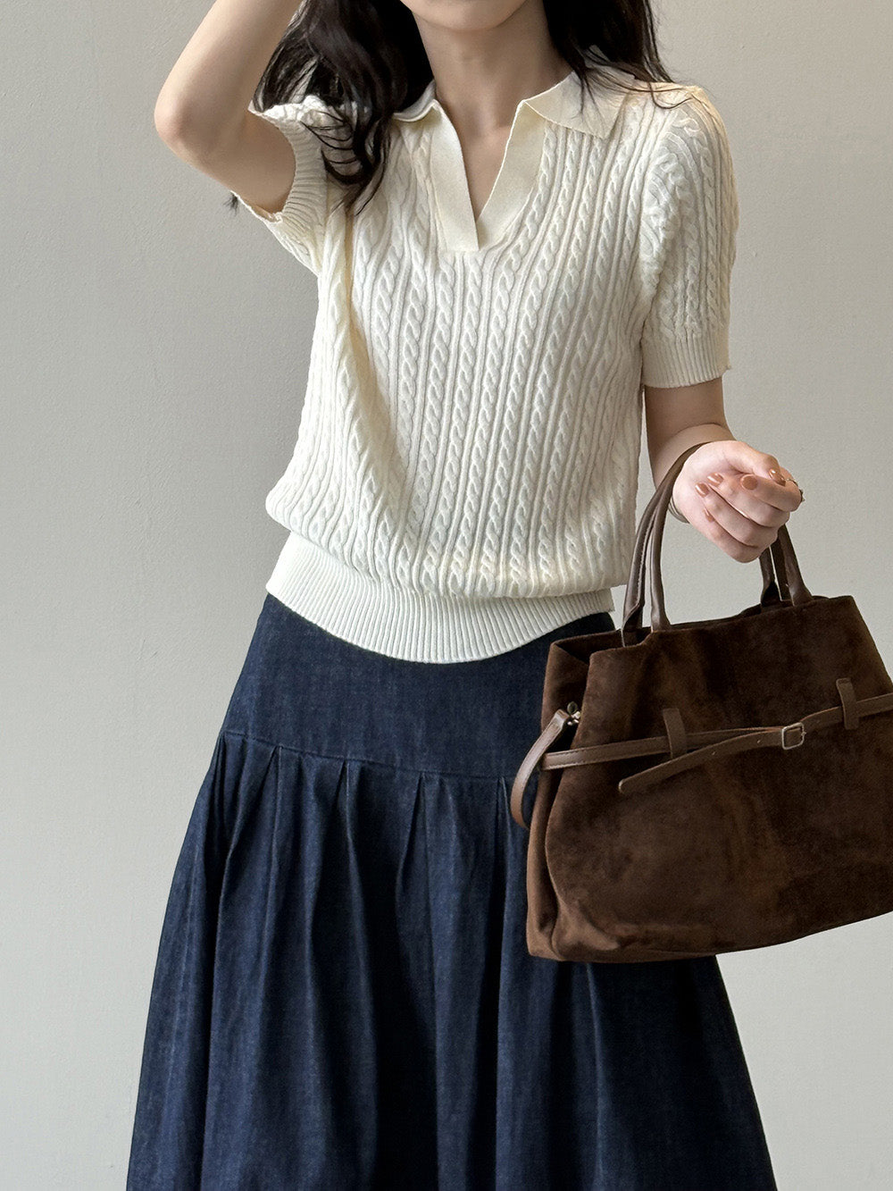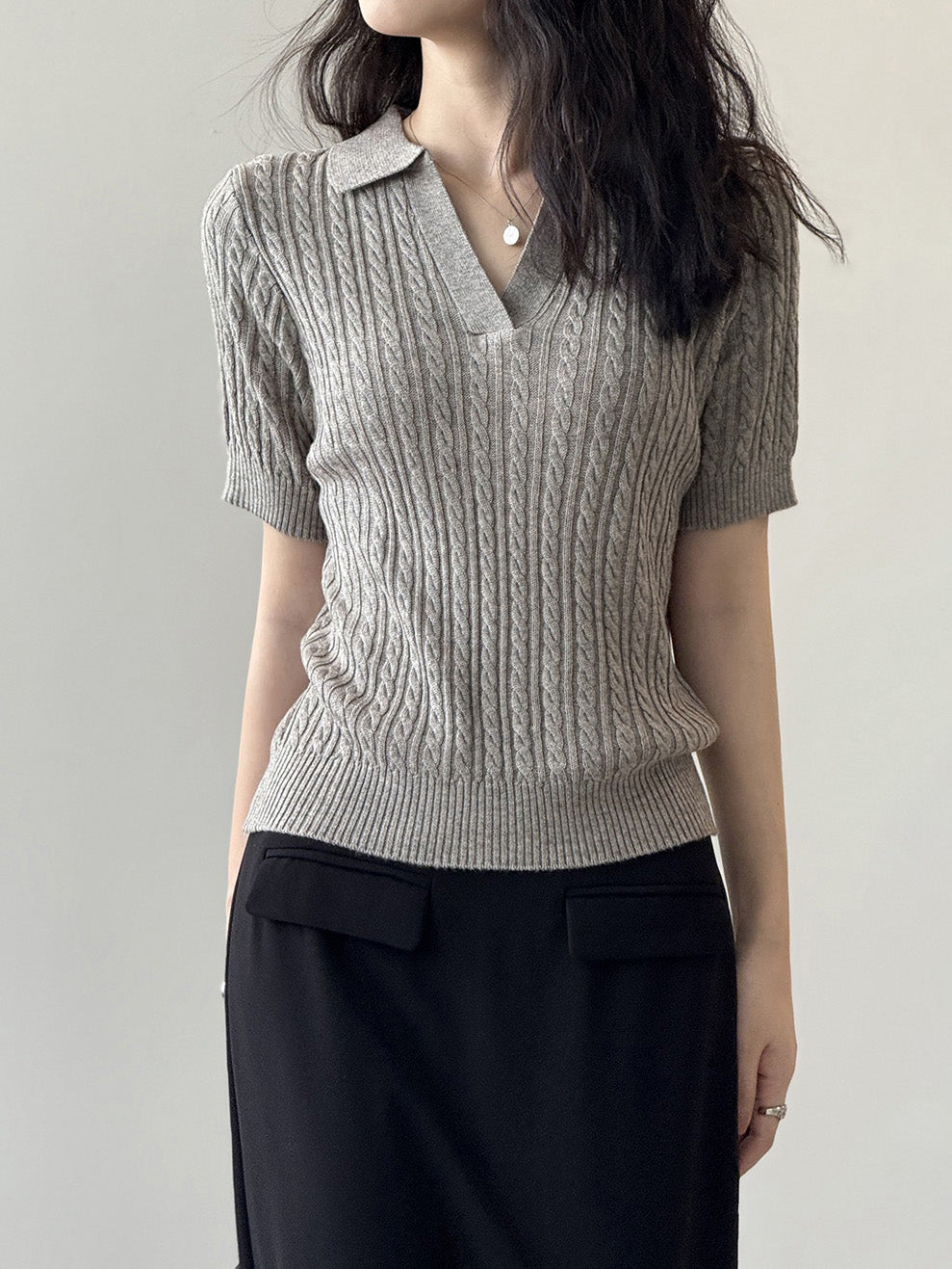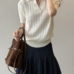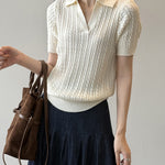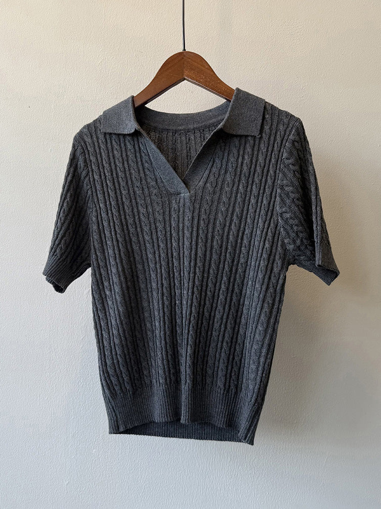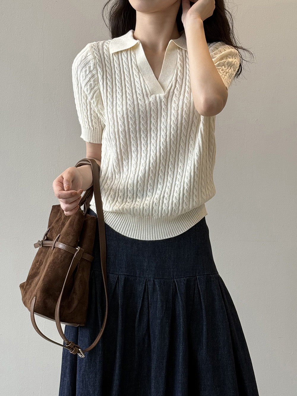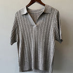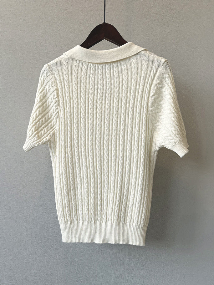 洗練された大人の休日スタイルを演出する、アラン模様のスキッパーカラーニット。