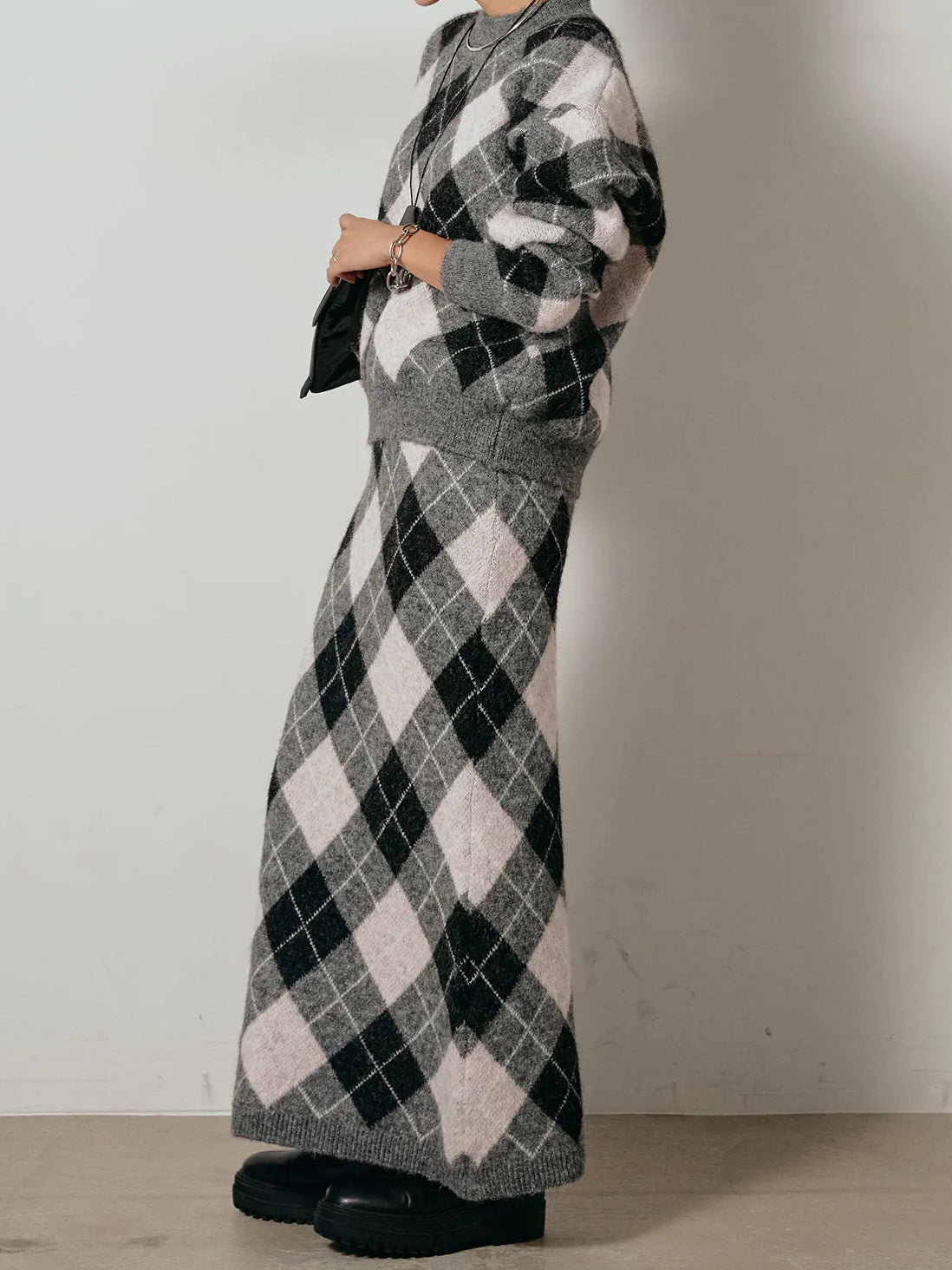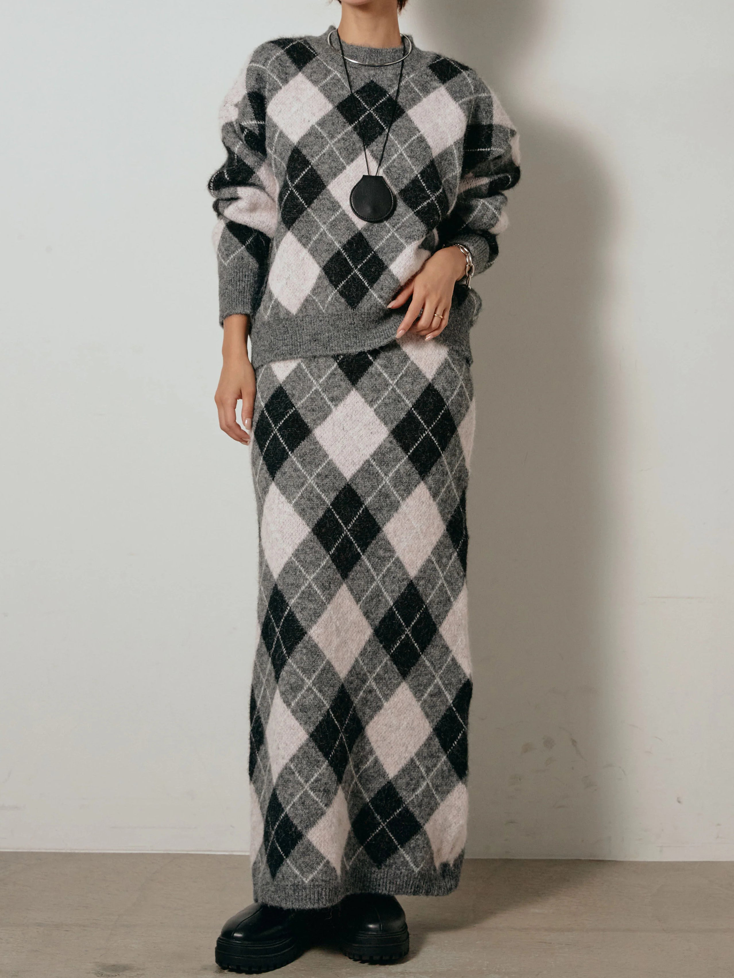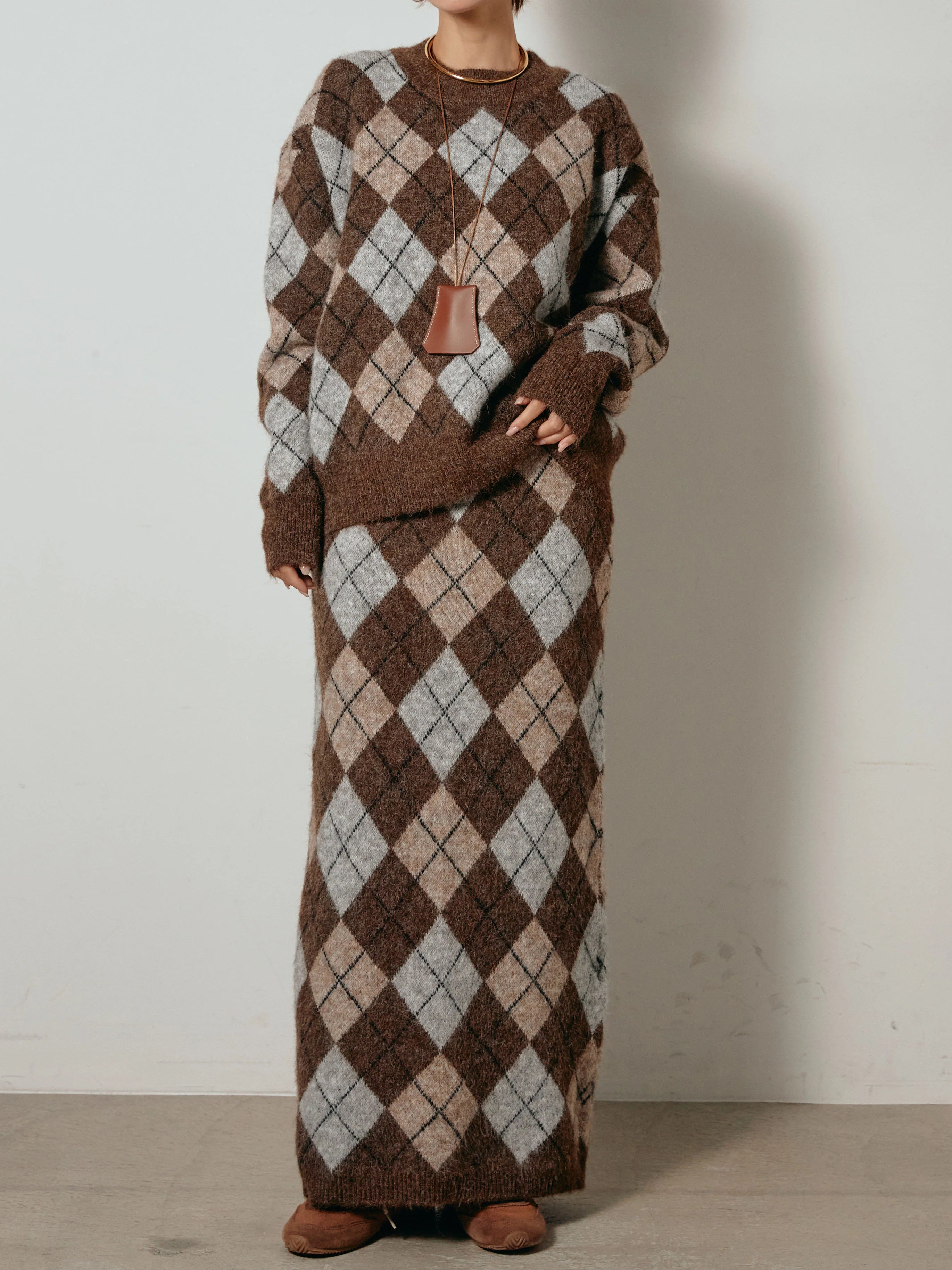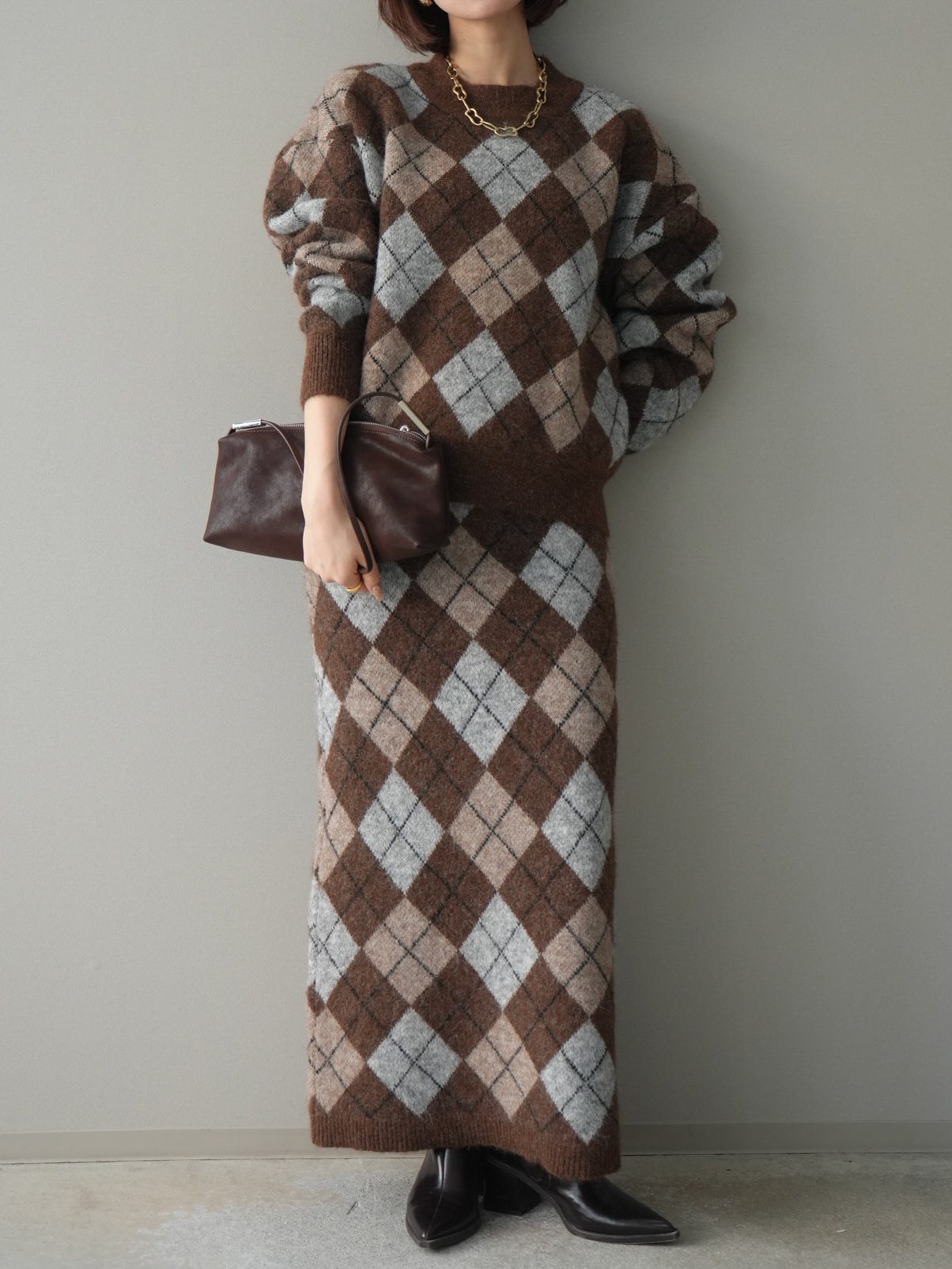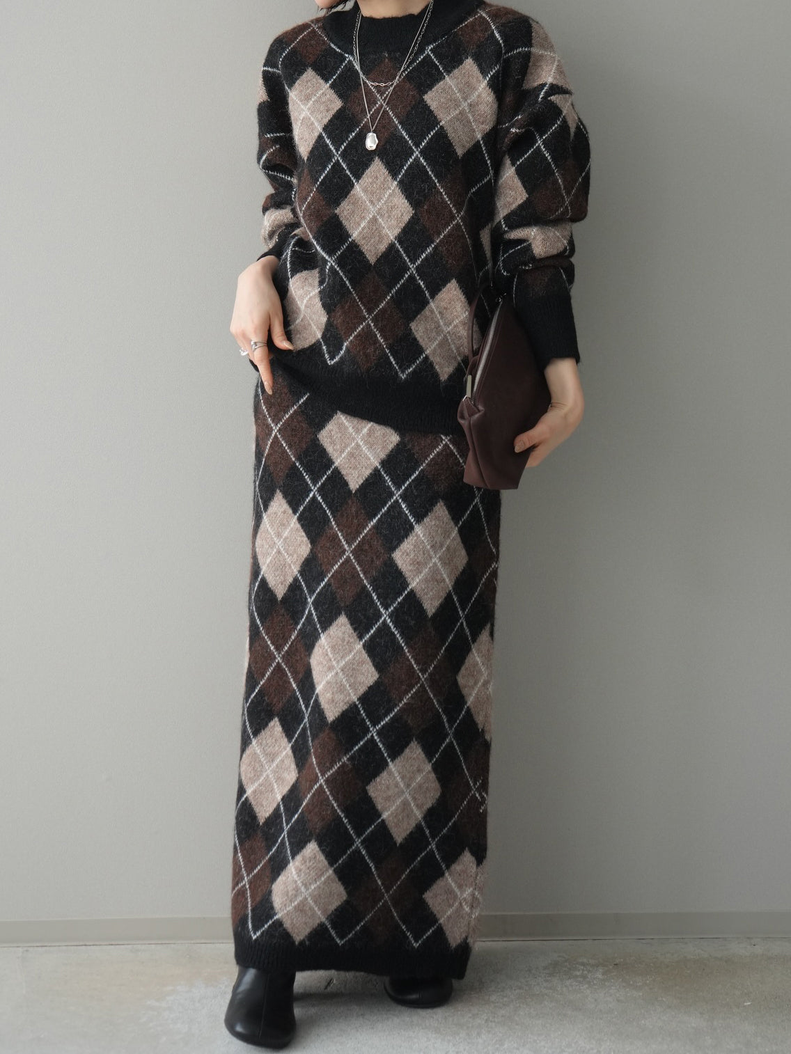 アーガイルニットプルオーバー+ロングスカートSET 3色入