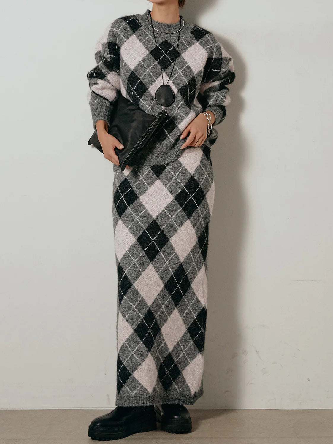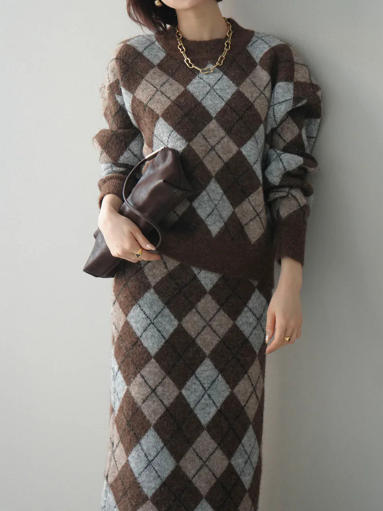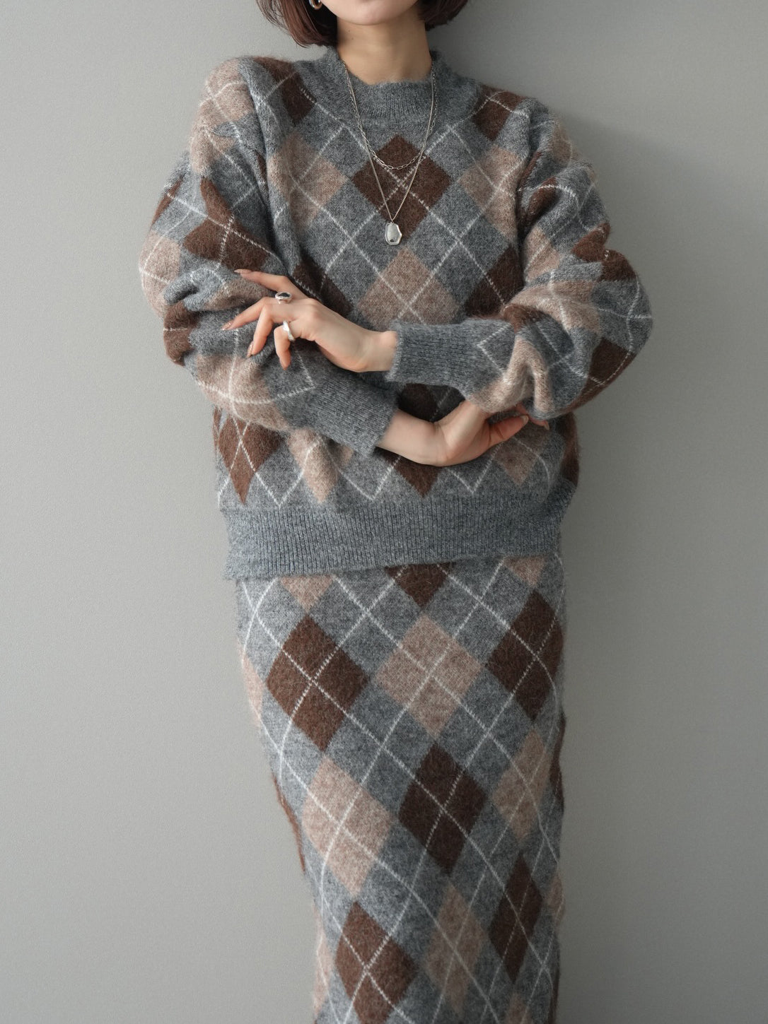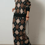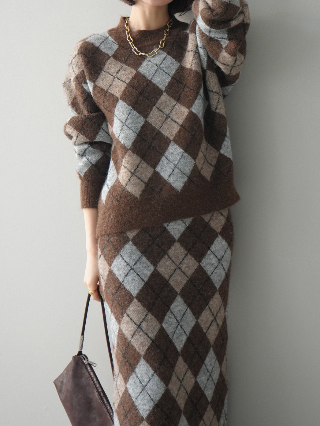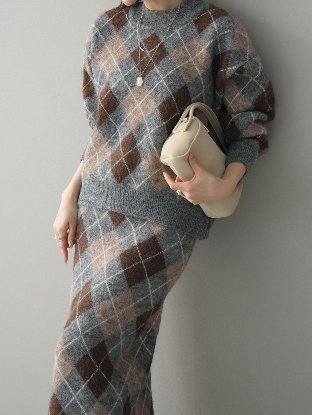 アーガイルニットプルオーバー+ロングスカートSET 3色入