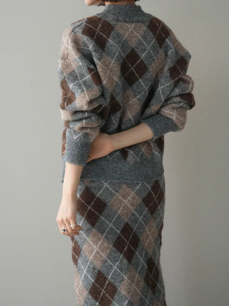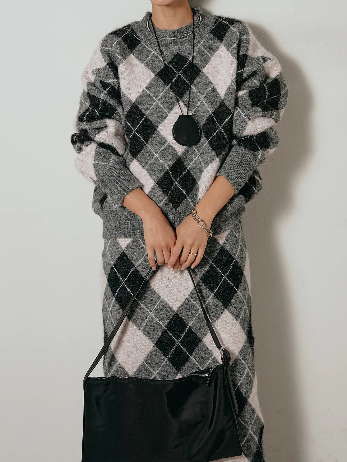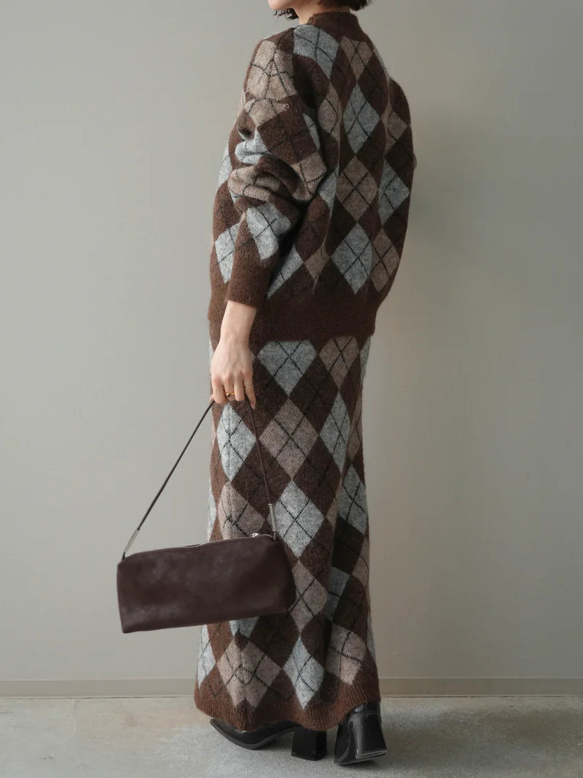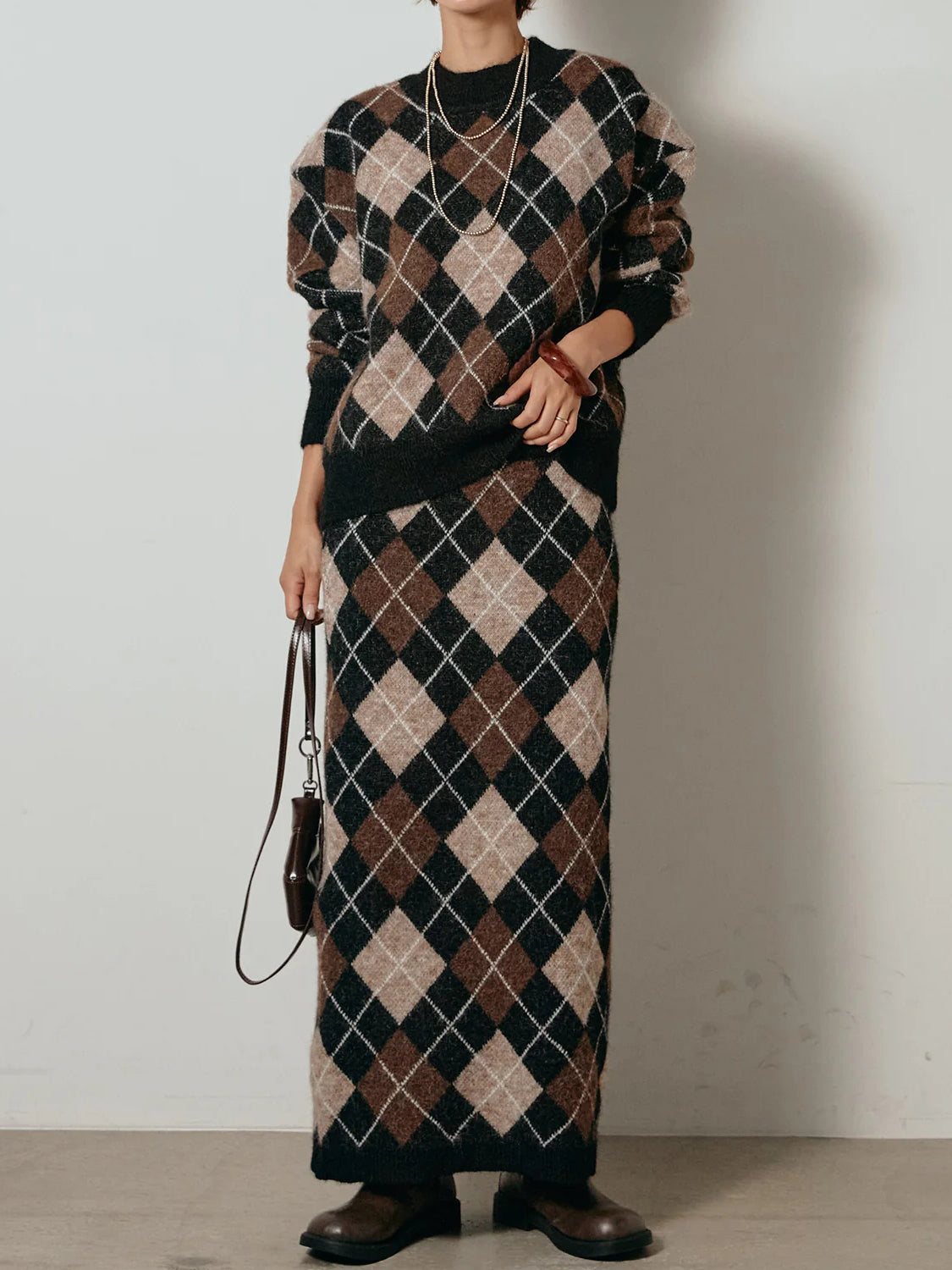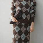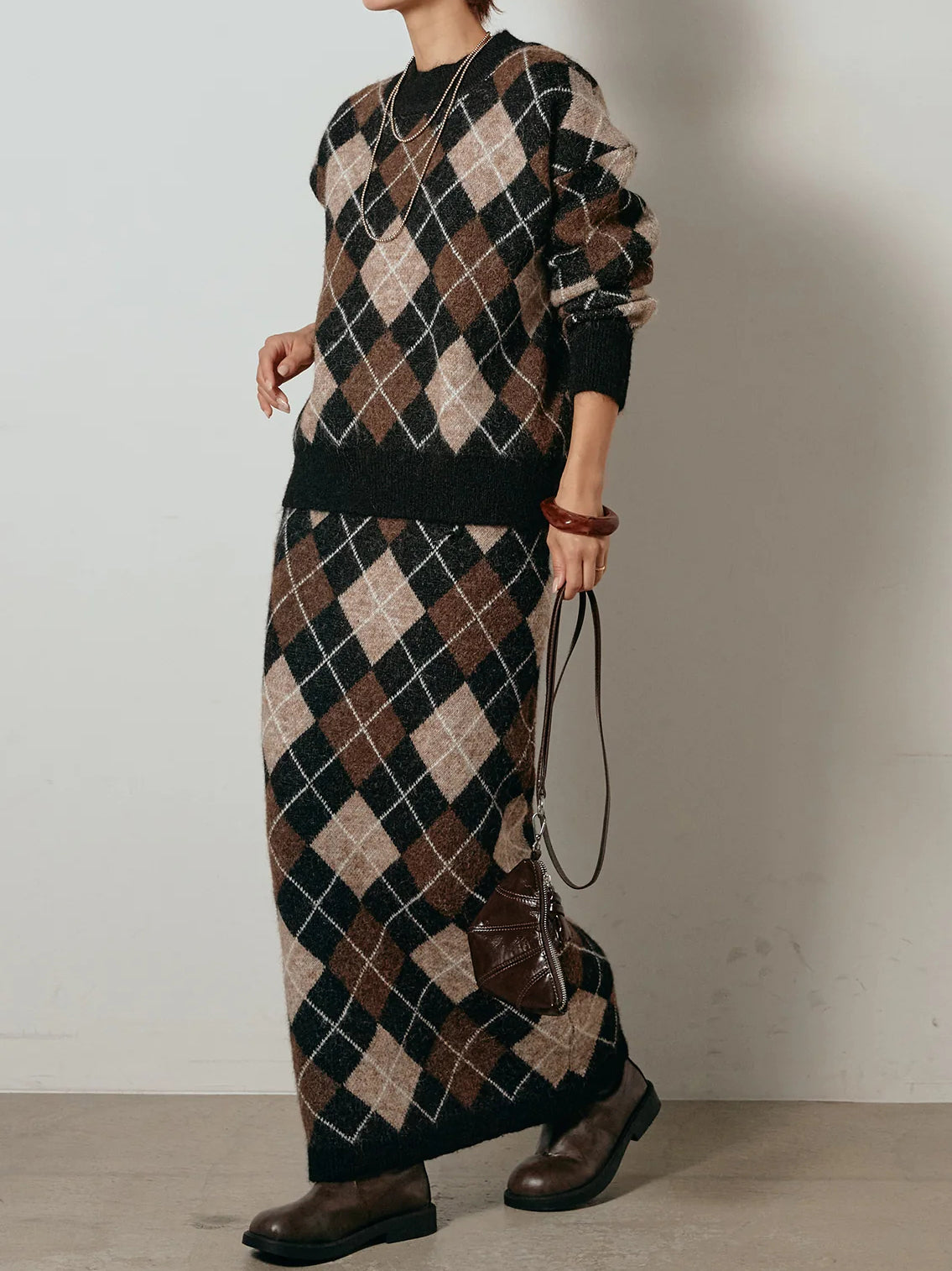アーガイルニットプルオーバー+ロングスカートSET 3色入
