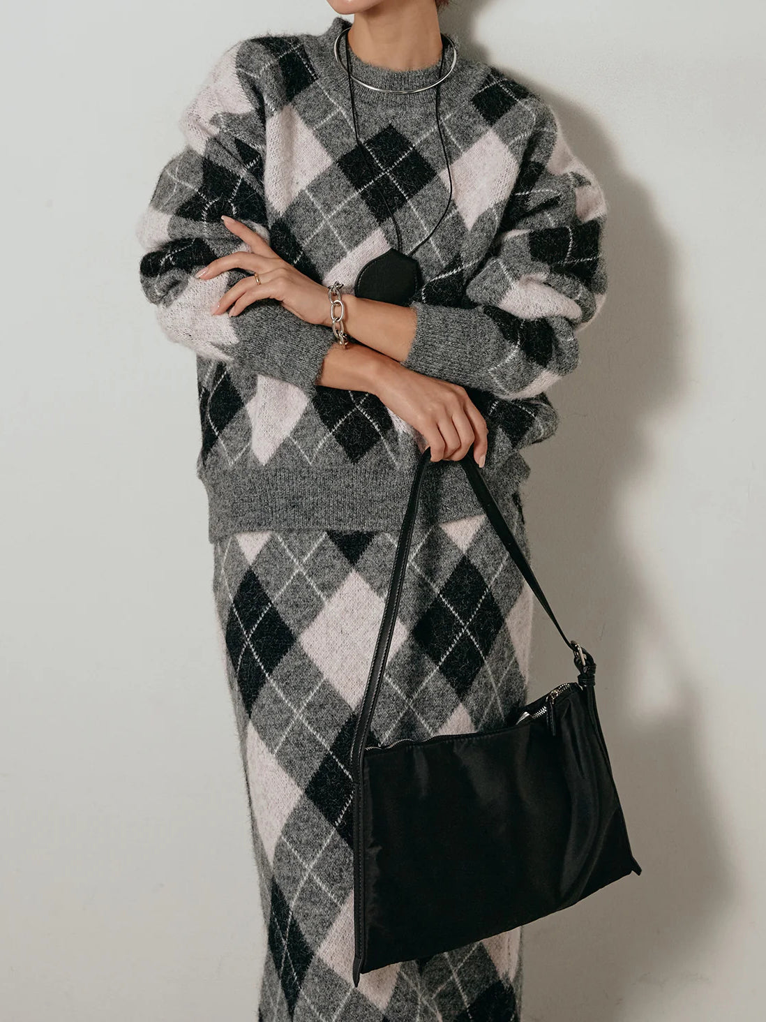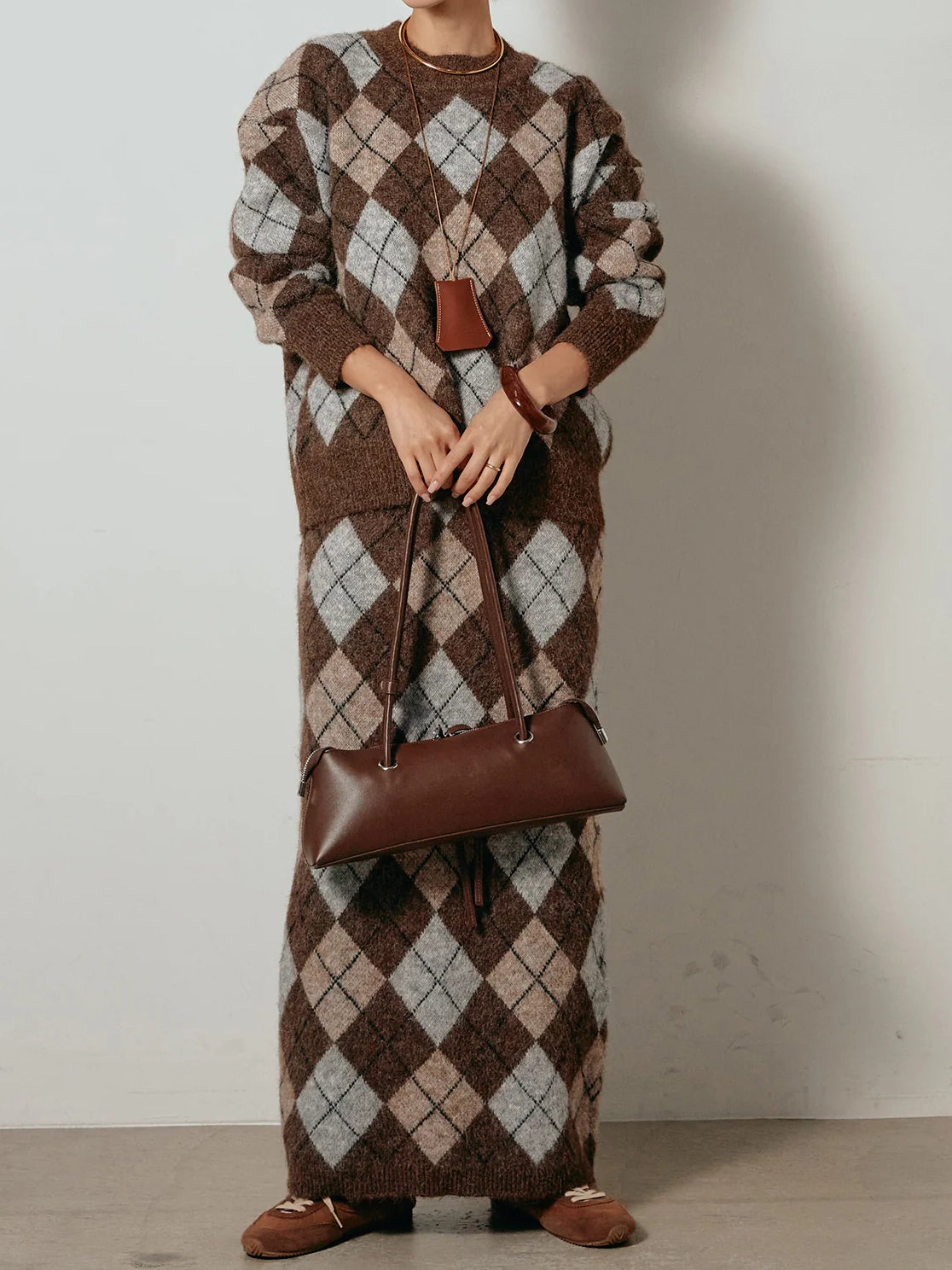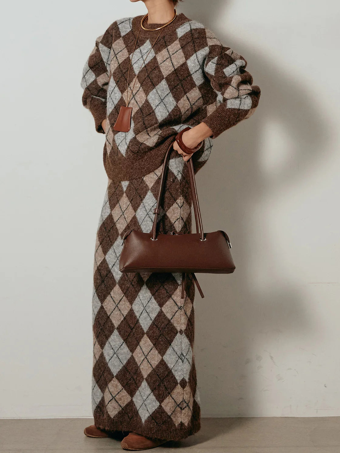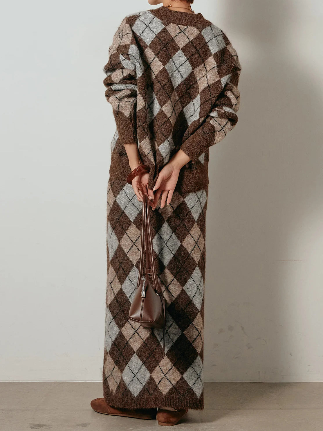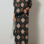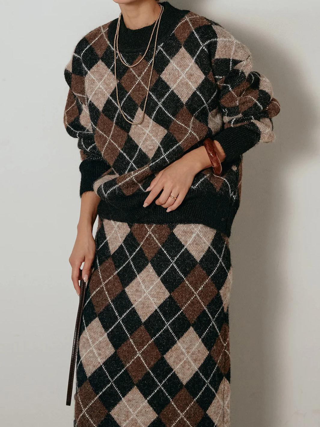 アーガイルニットプルオーバー+ロングスカートSET 3色入