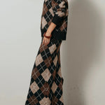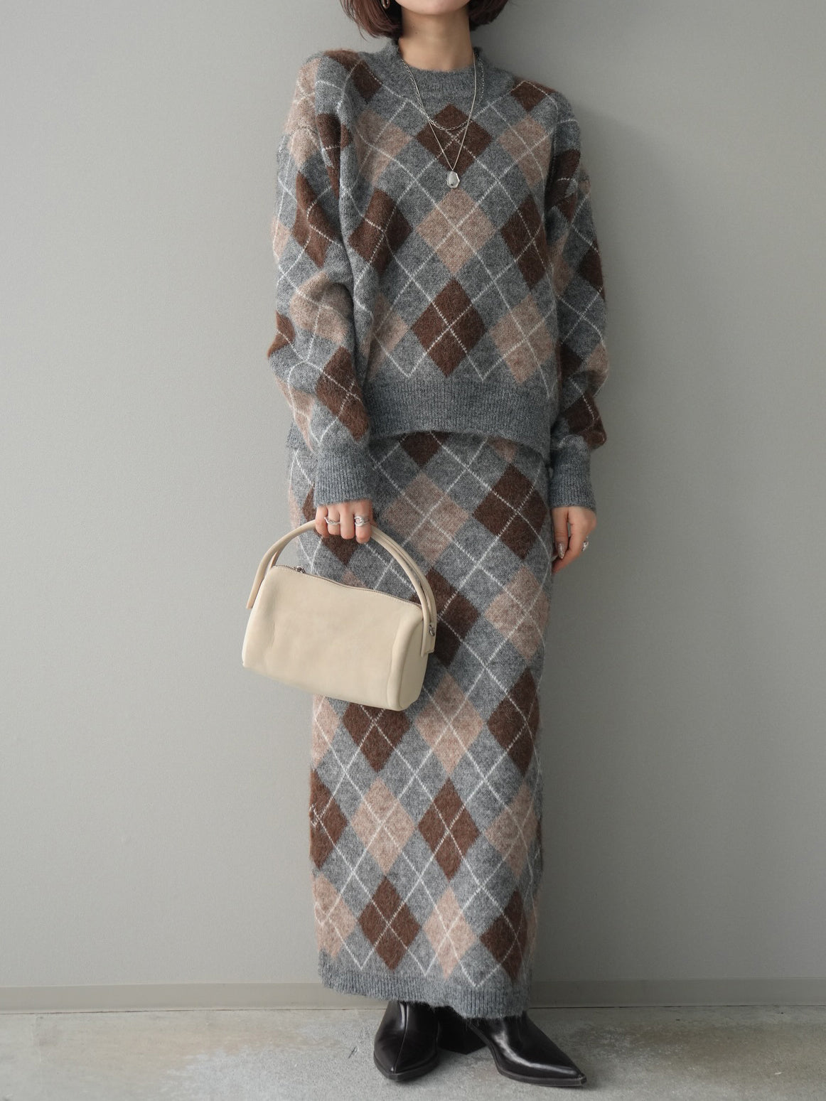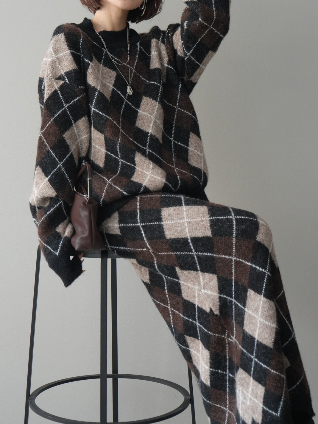 存在感のあるアーガイル柄が目を引くニットセットアップ。