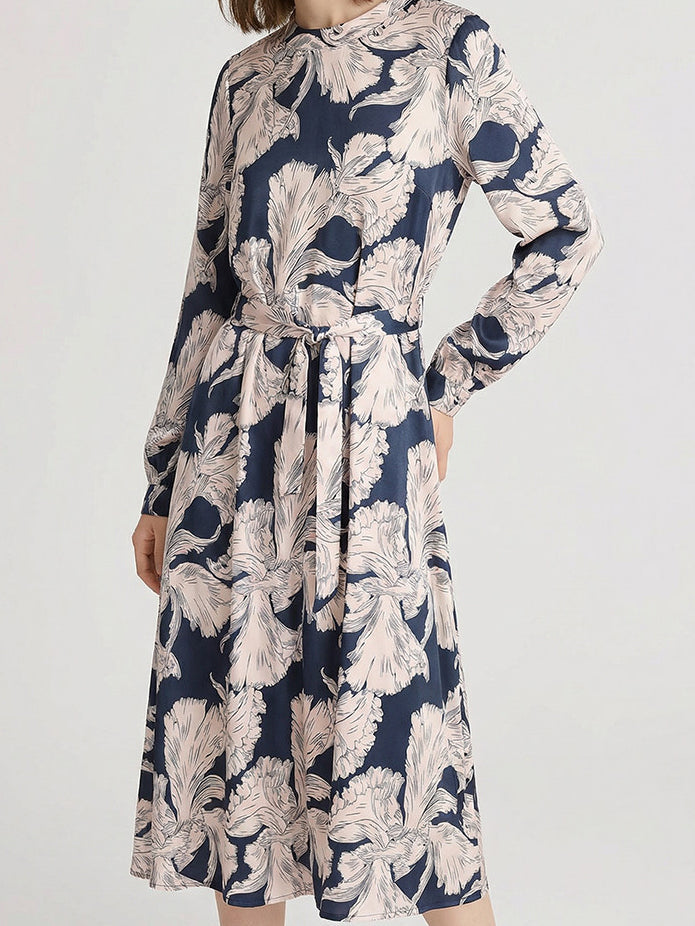 スタンドカラープリントベルテッドワンピース