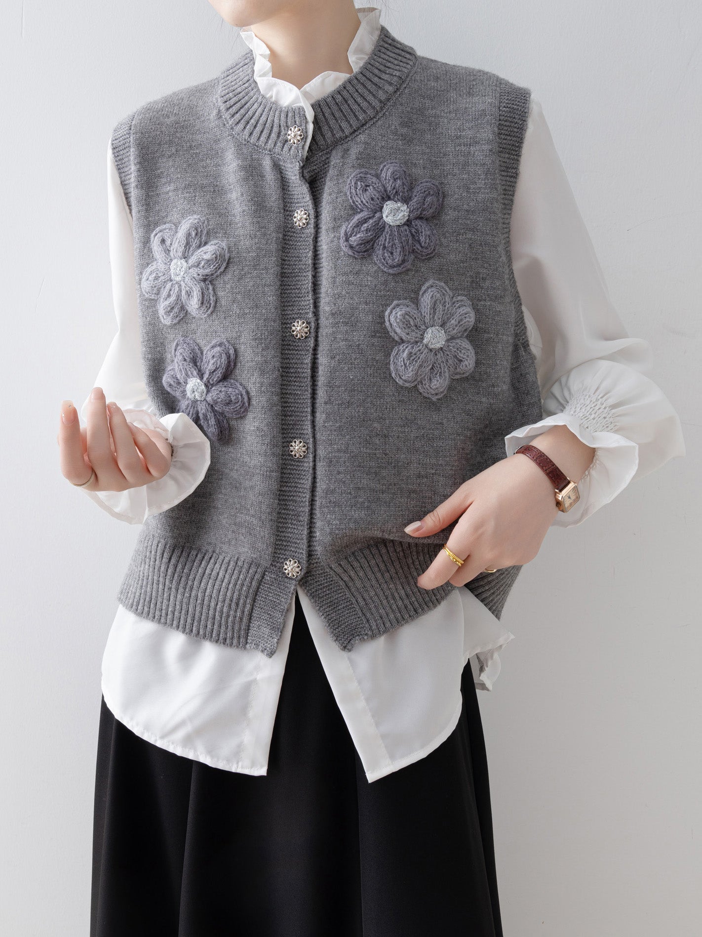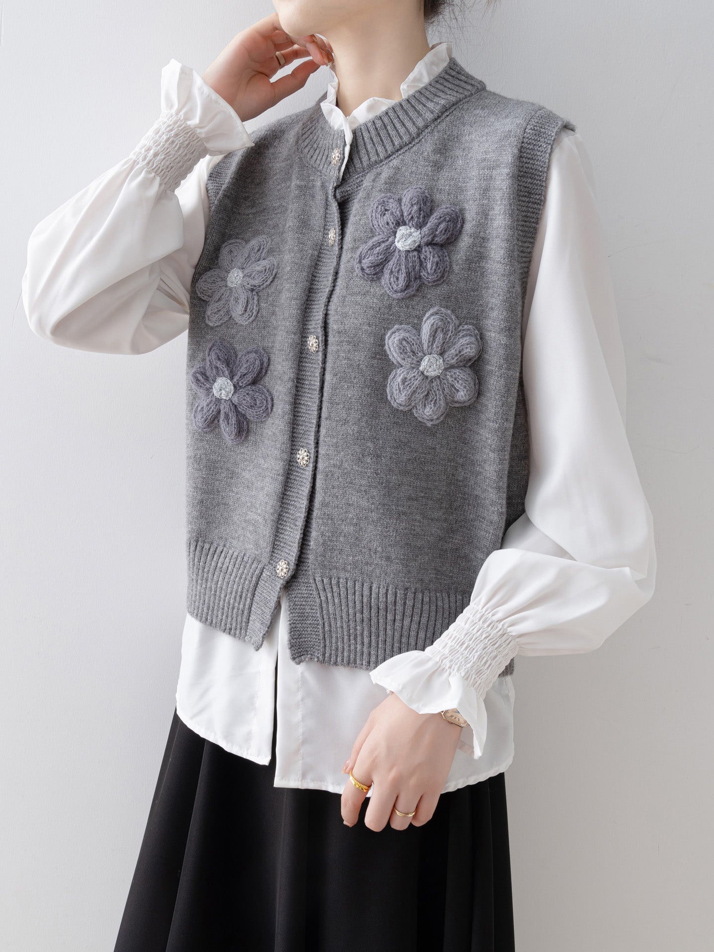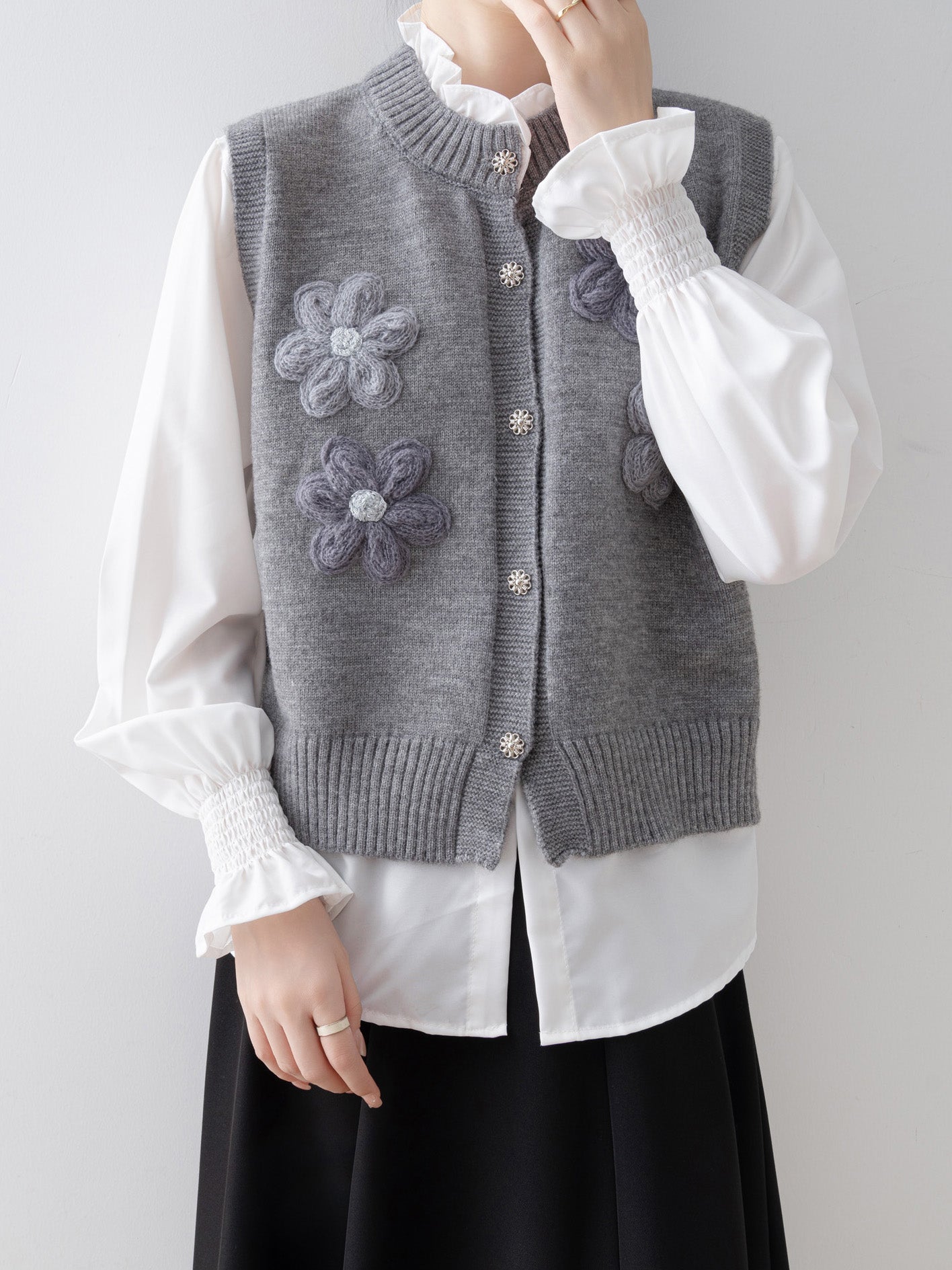 立体フラワーのモチーフを散りばめ、フリルをあしらったニット。