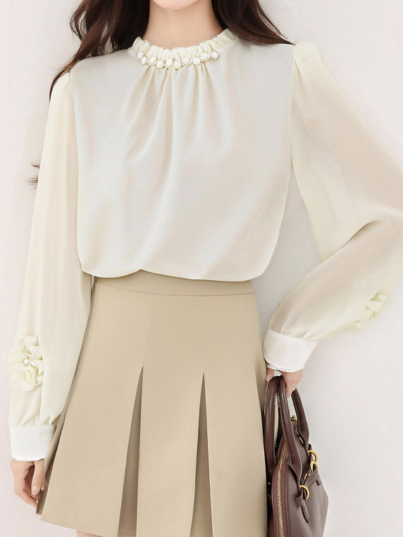 異素材フラワーデザイン袖パールネックブラウス 2色入
