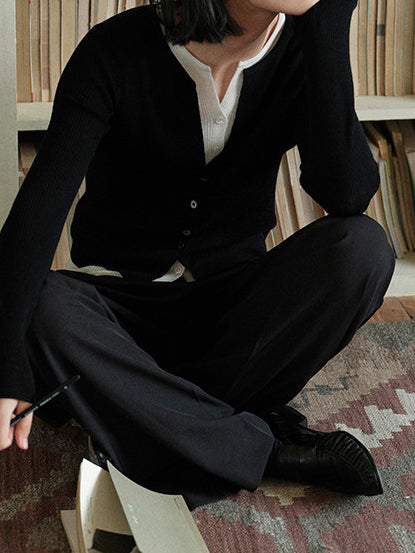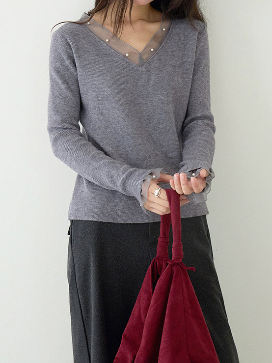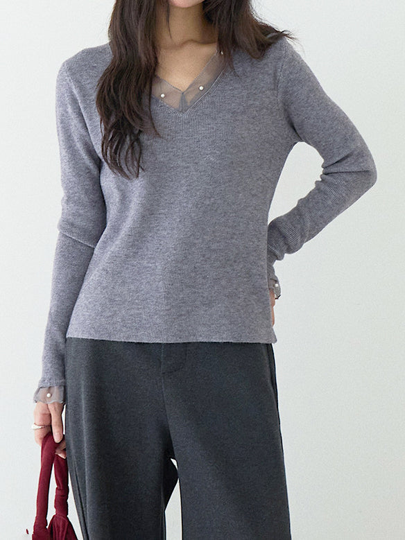 パールチュールドッキングVネックリブニットカットソー 2色入