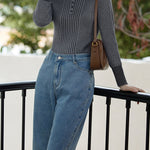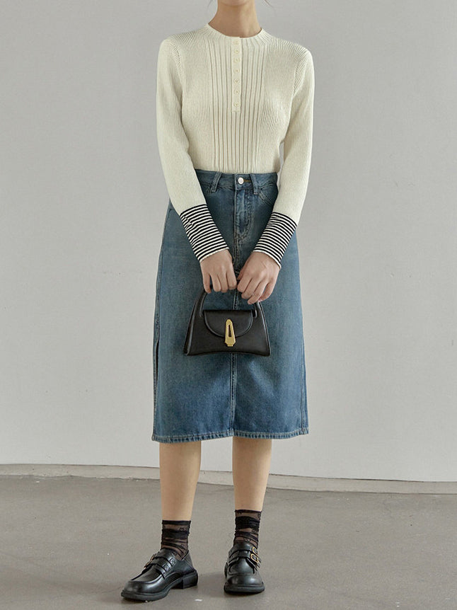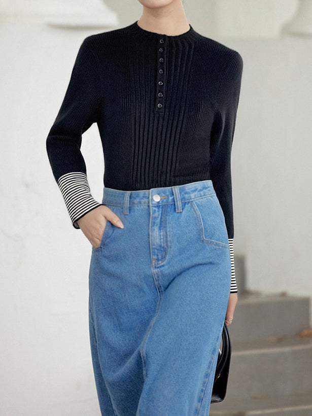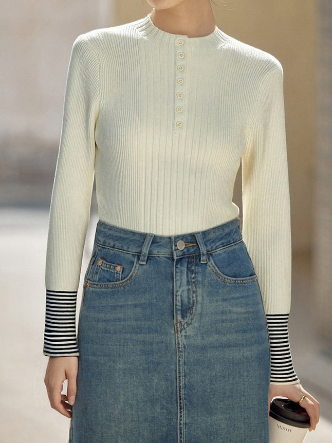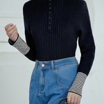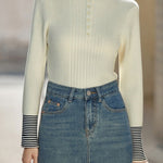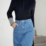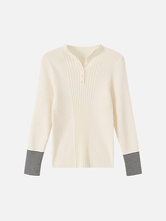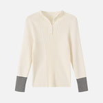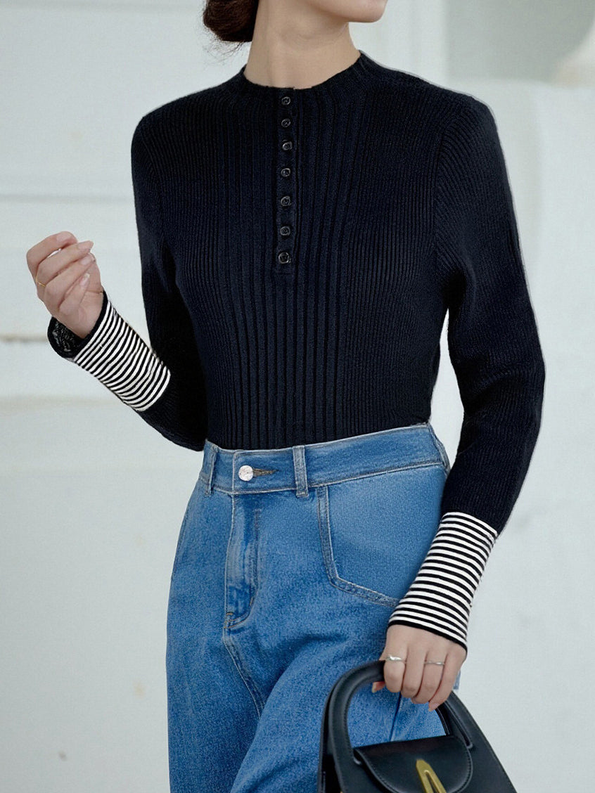 ☆ヘンリーネックのデザインが程よくカジュアルさを出しつつ、ボタンデザインで顔まわりに華やかさをプラスします。
