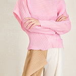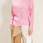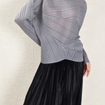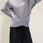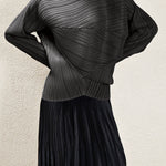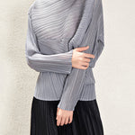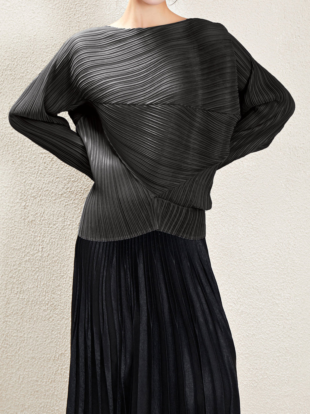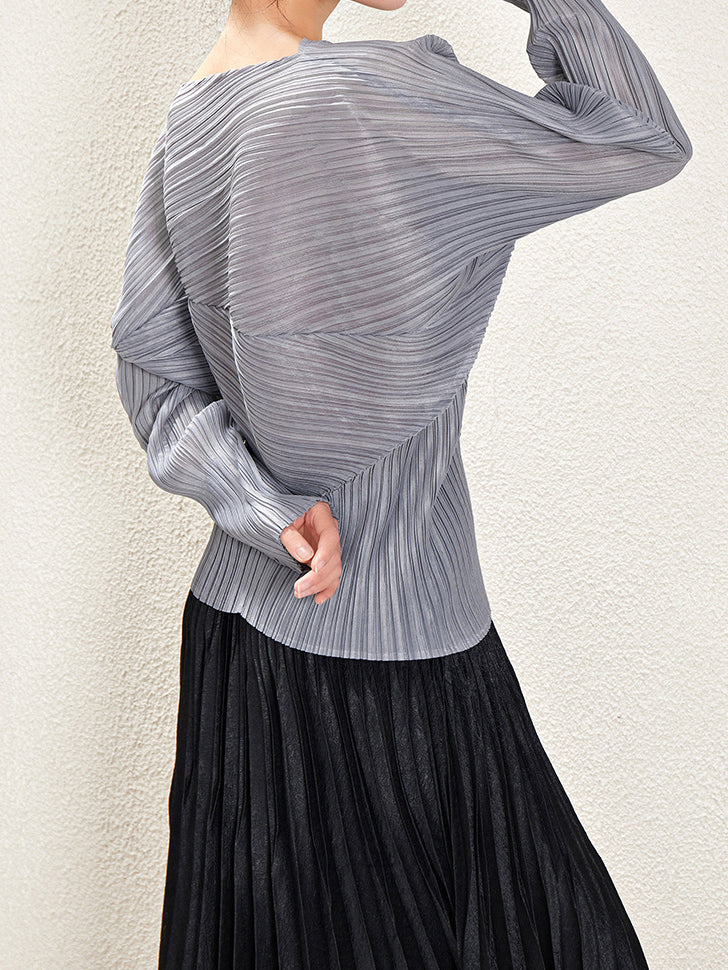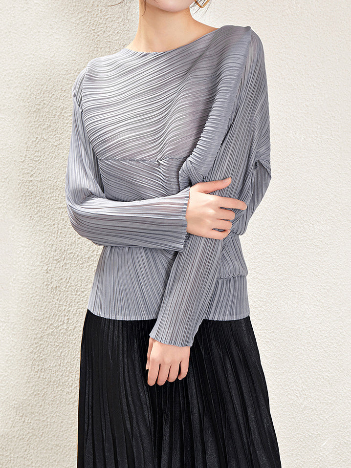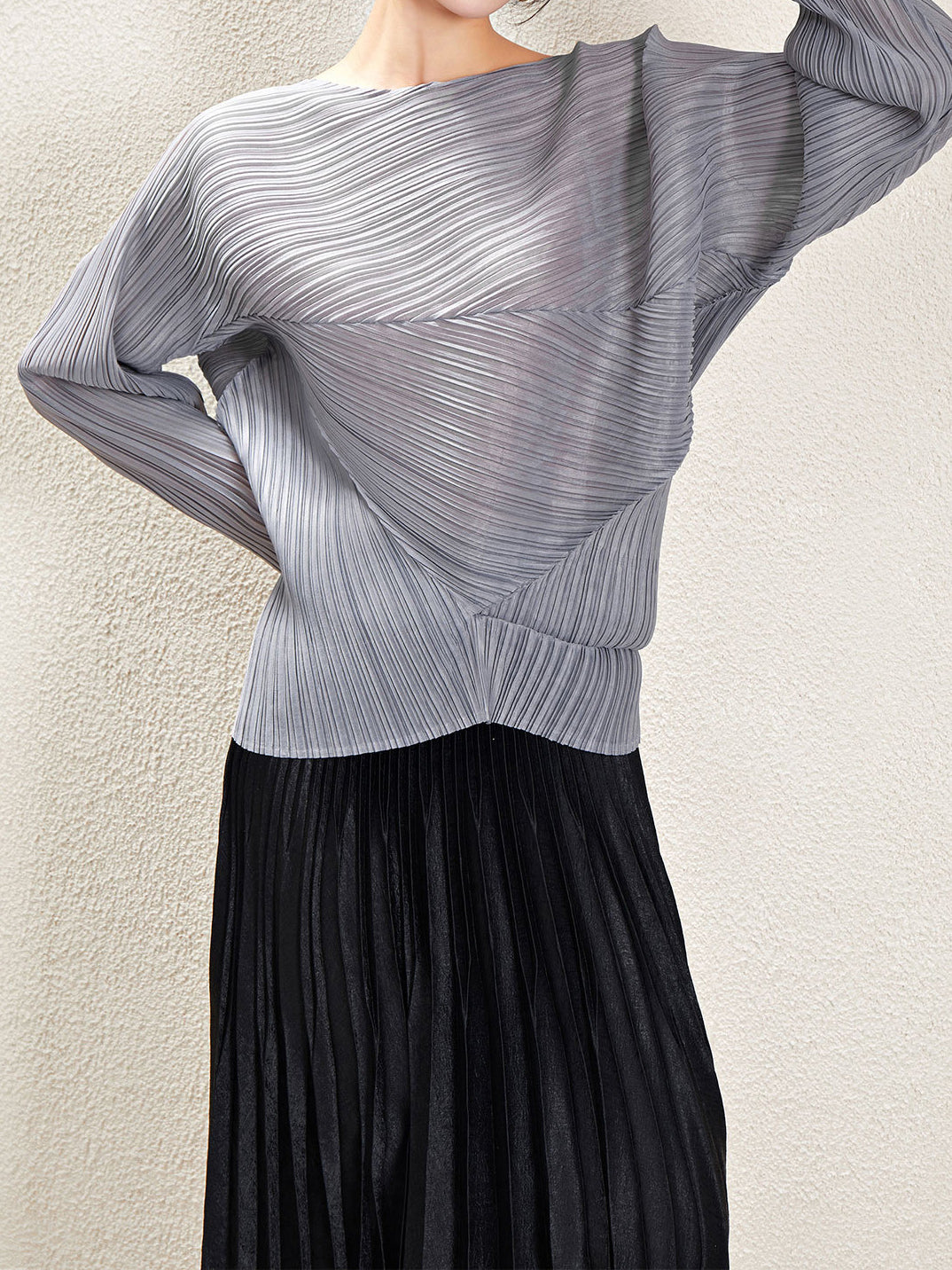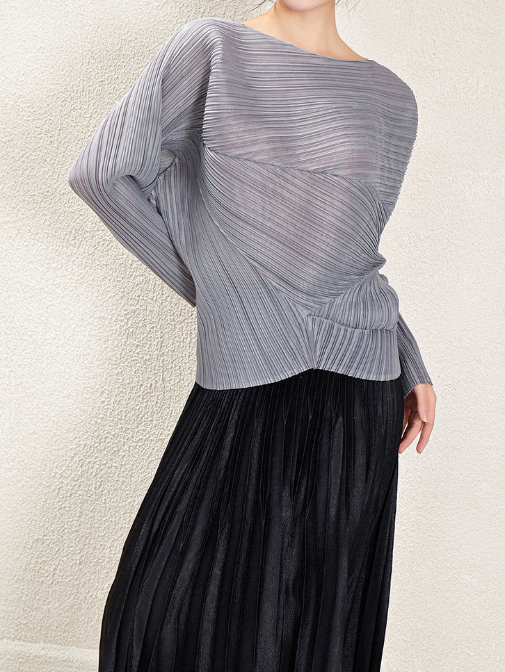 アシンメトリーカットでプリーツをあしらい、イレギュラーのトップス。