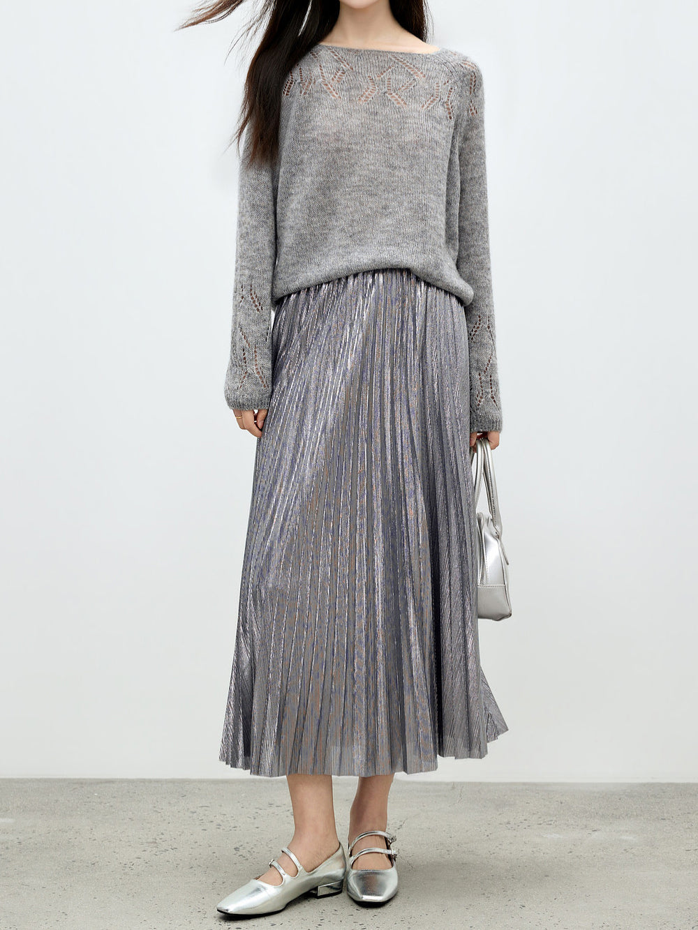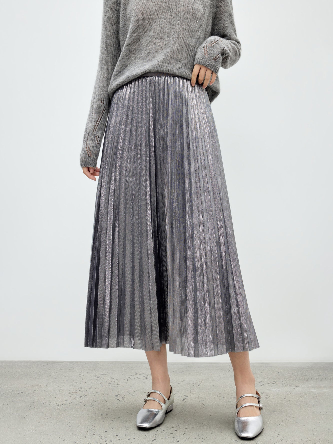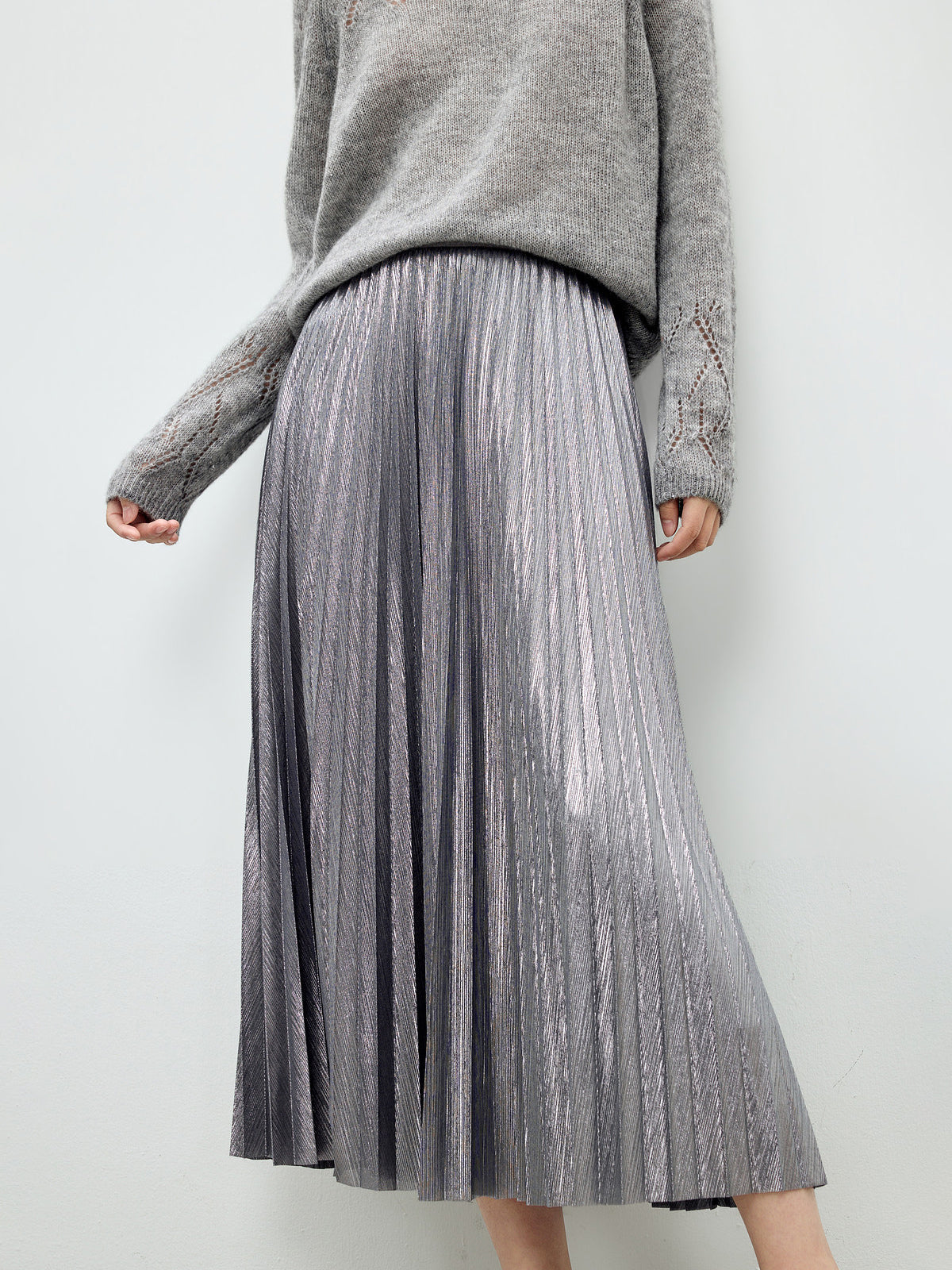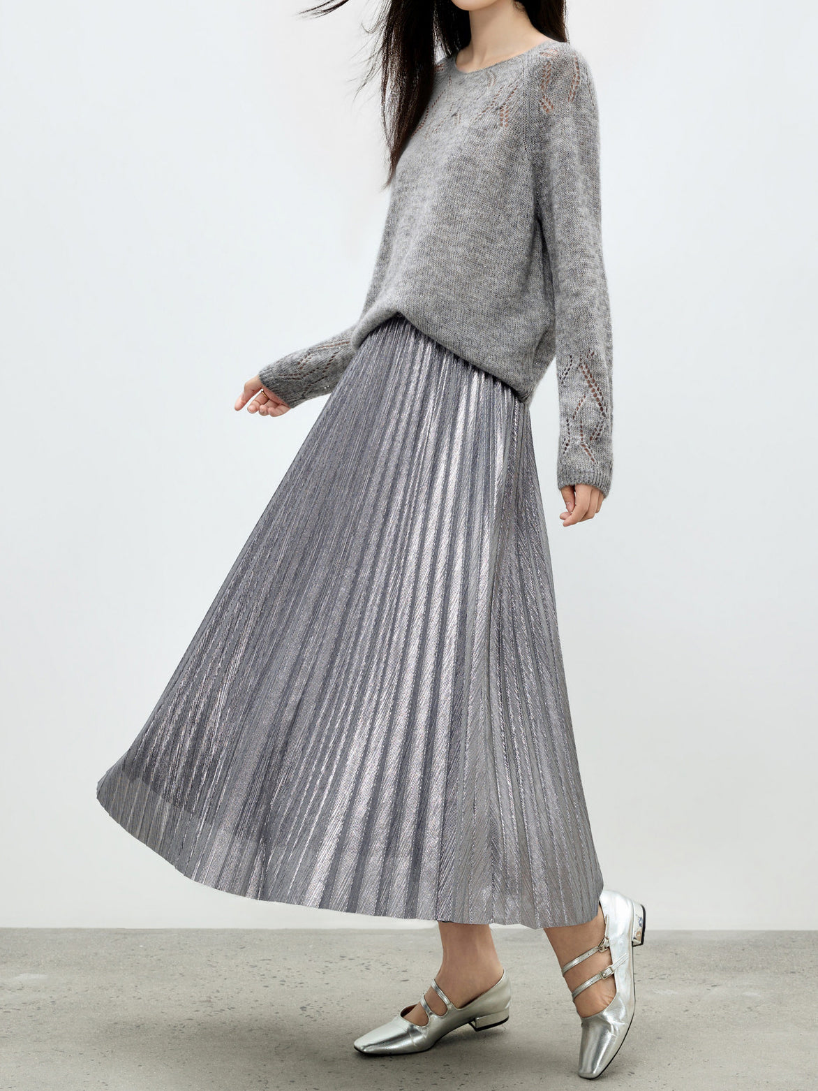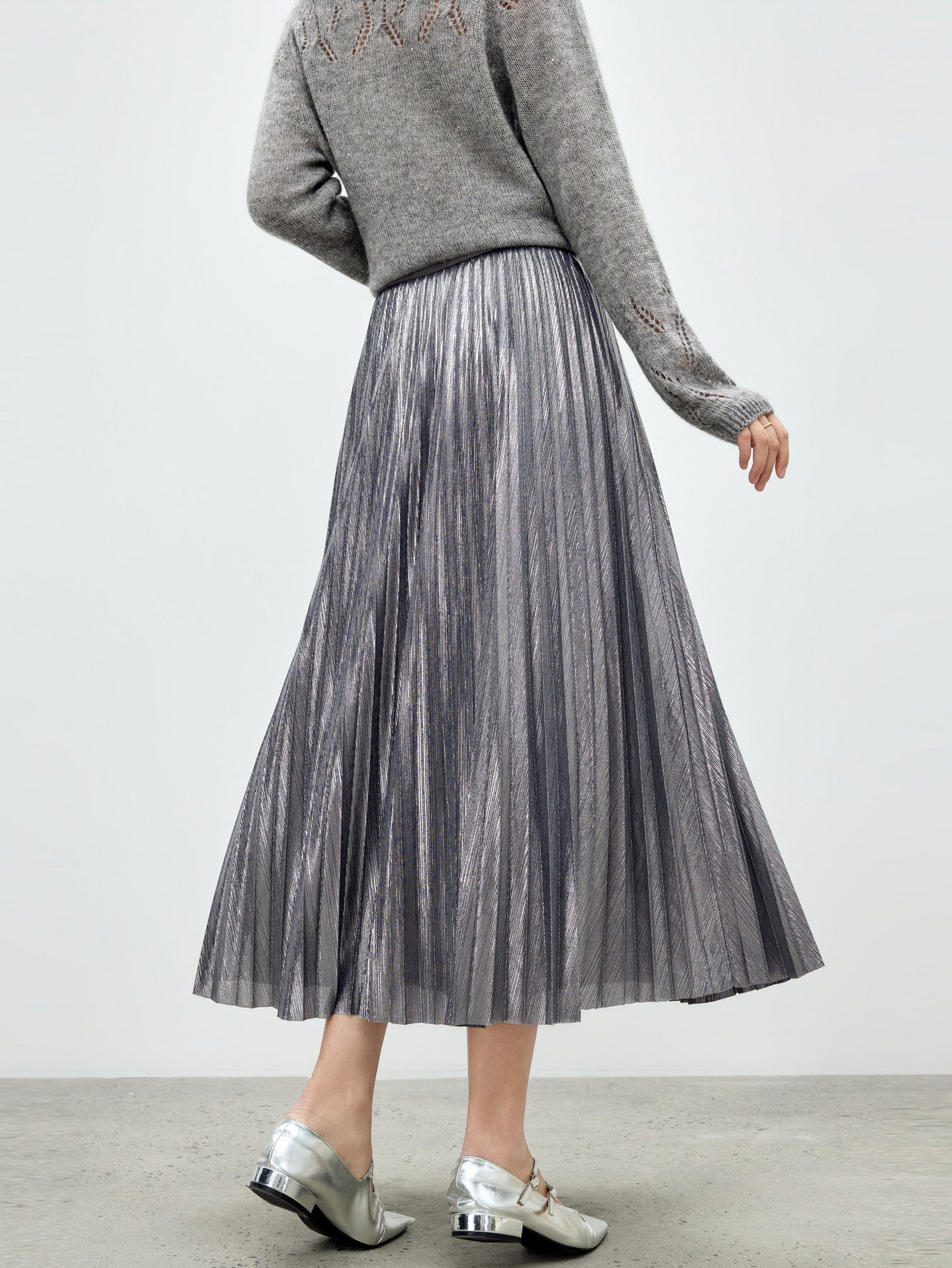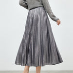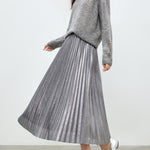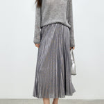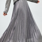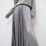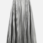 メタリック調の素材が映えるロング丈のプリーツスカート。