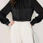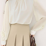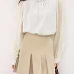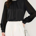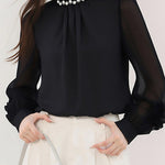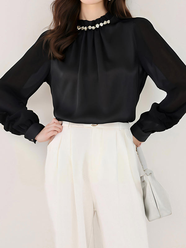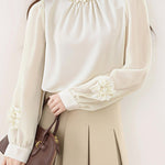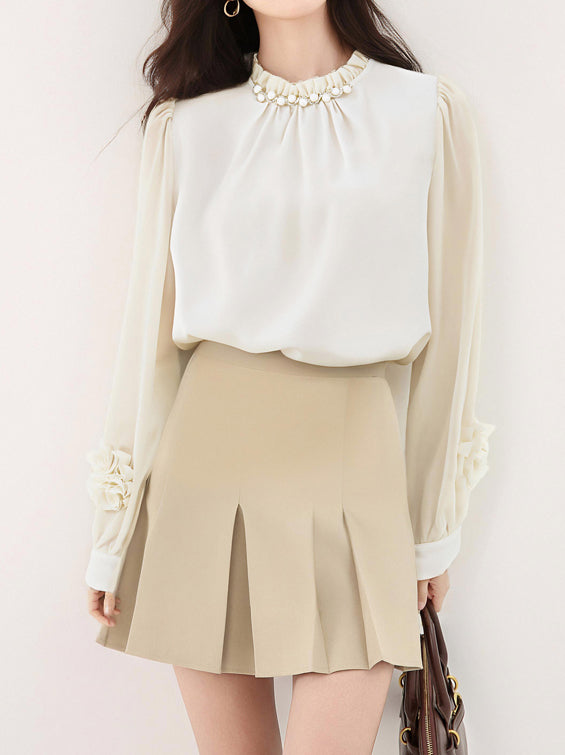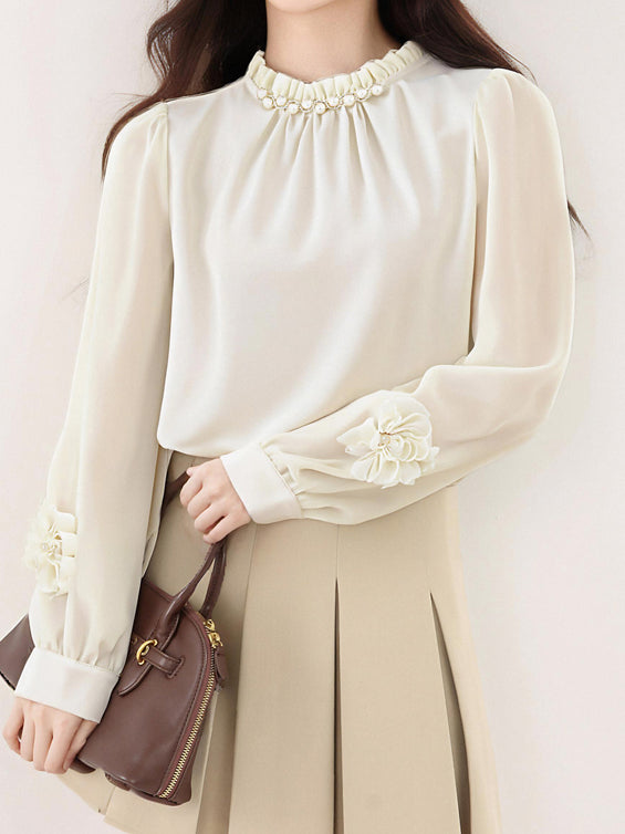 異素材フラワーデザイン袖パールネックブラウス 2色入