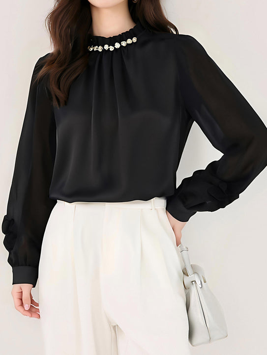 大人かわいい服を叶え、優雅なパール襟が印象的なブラウス。