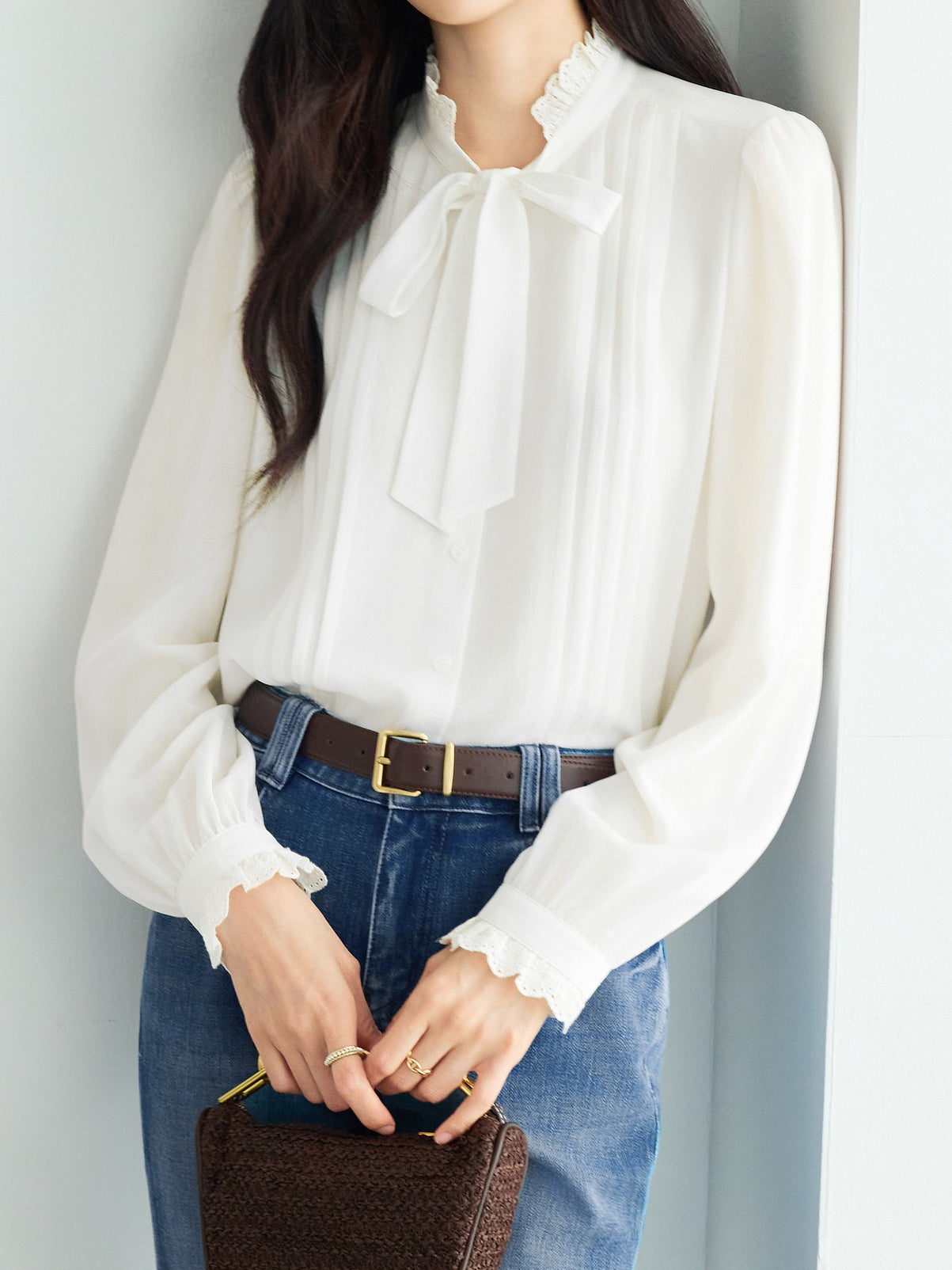 ボウタイピンタックデザインフリルブラウス