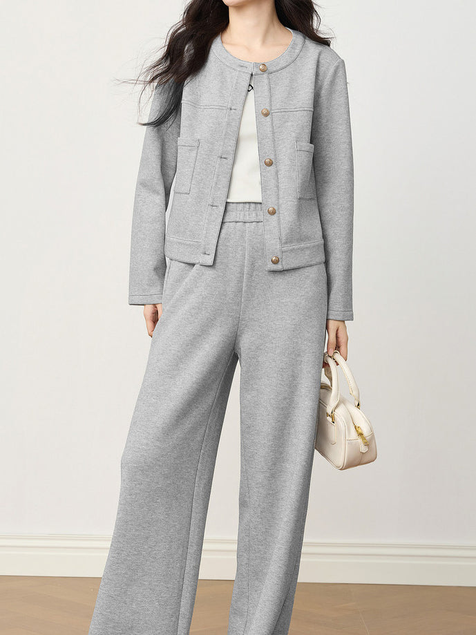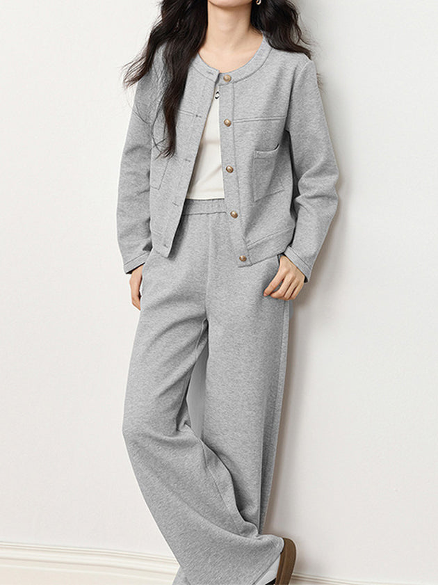 ノーカラーステッチデザイン金ボタンジャケット+イージーパンツSET 2色入