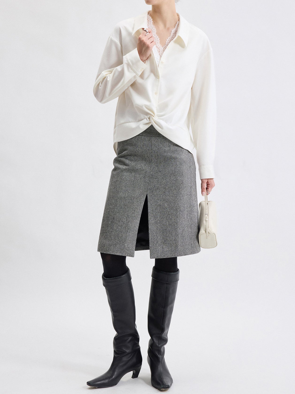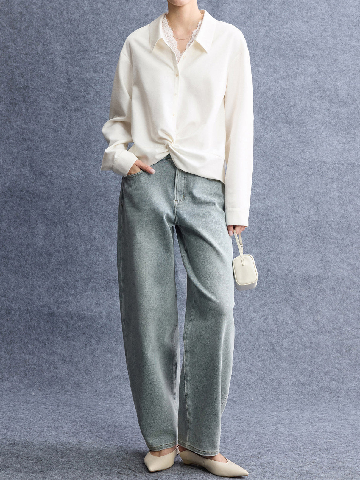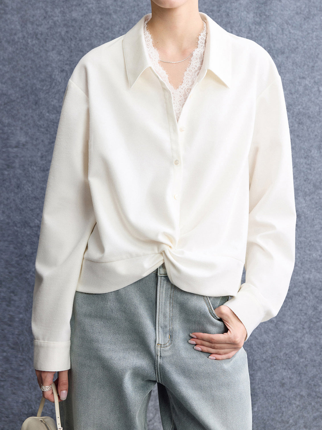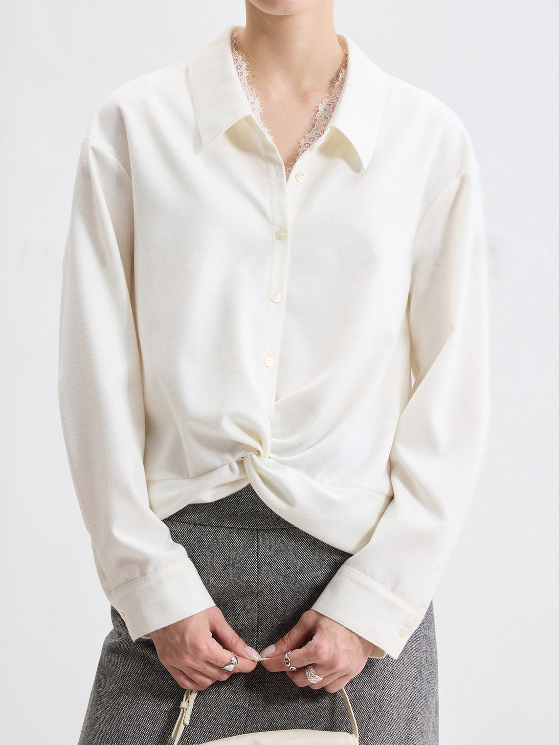 襟周りにレースを彩り、襟付きできちんと感を出し、大人の女性らしい抜け感を演出します。