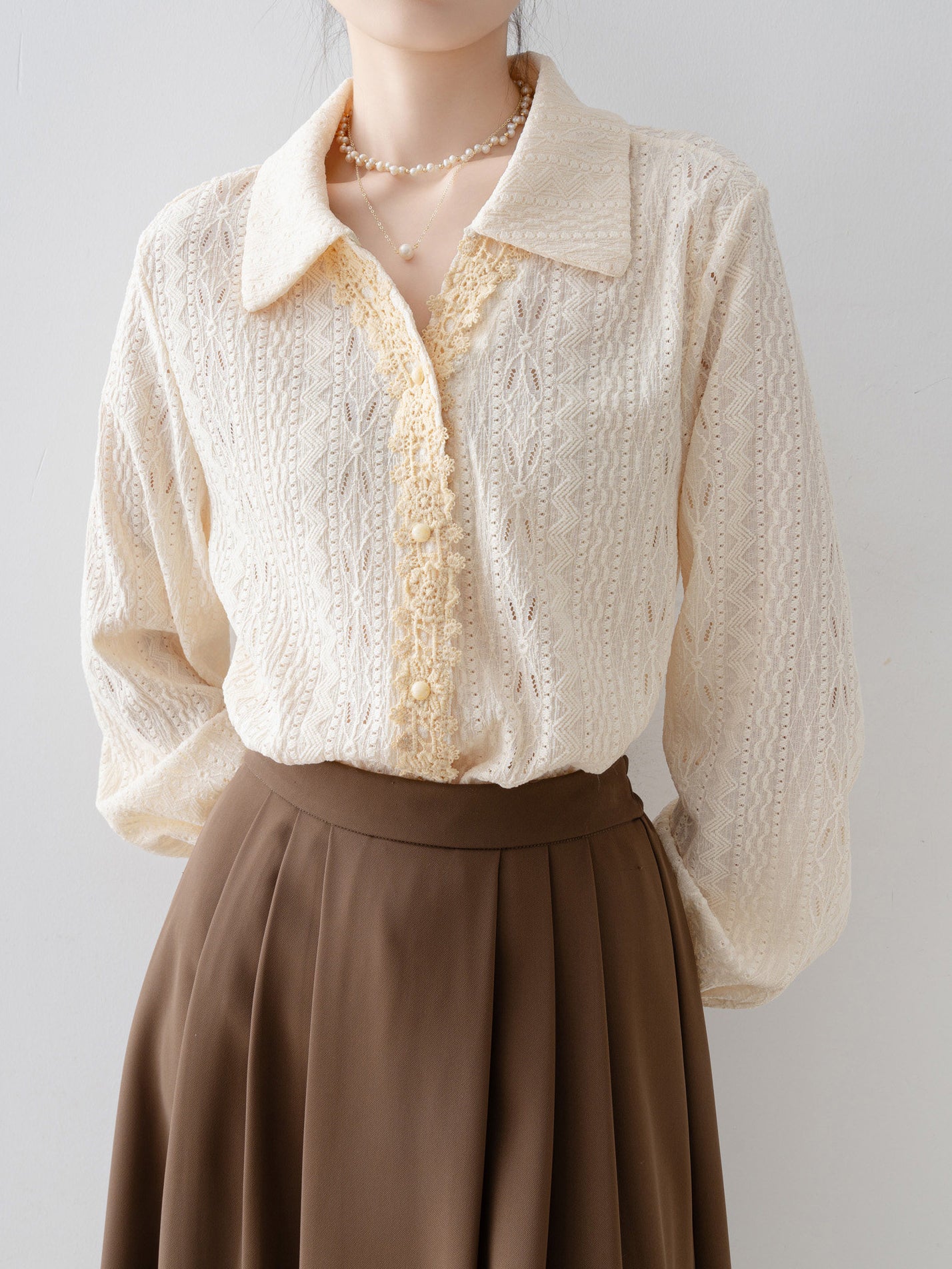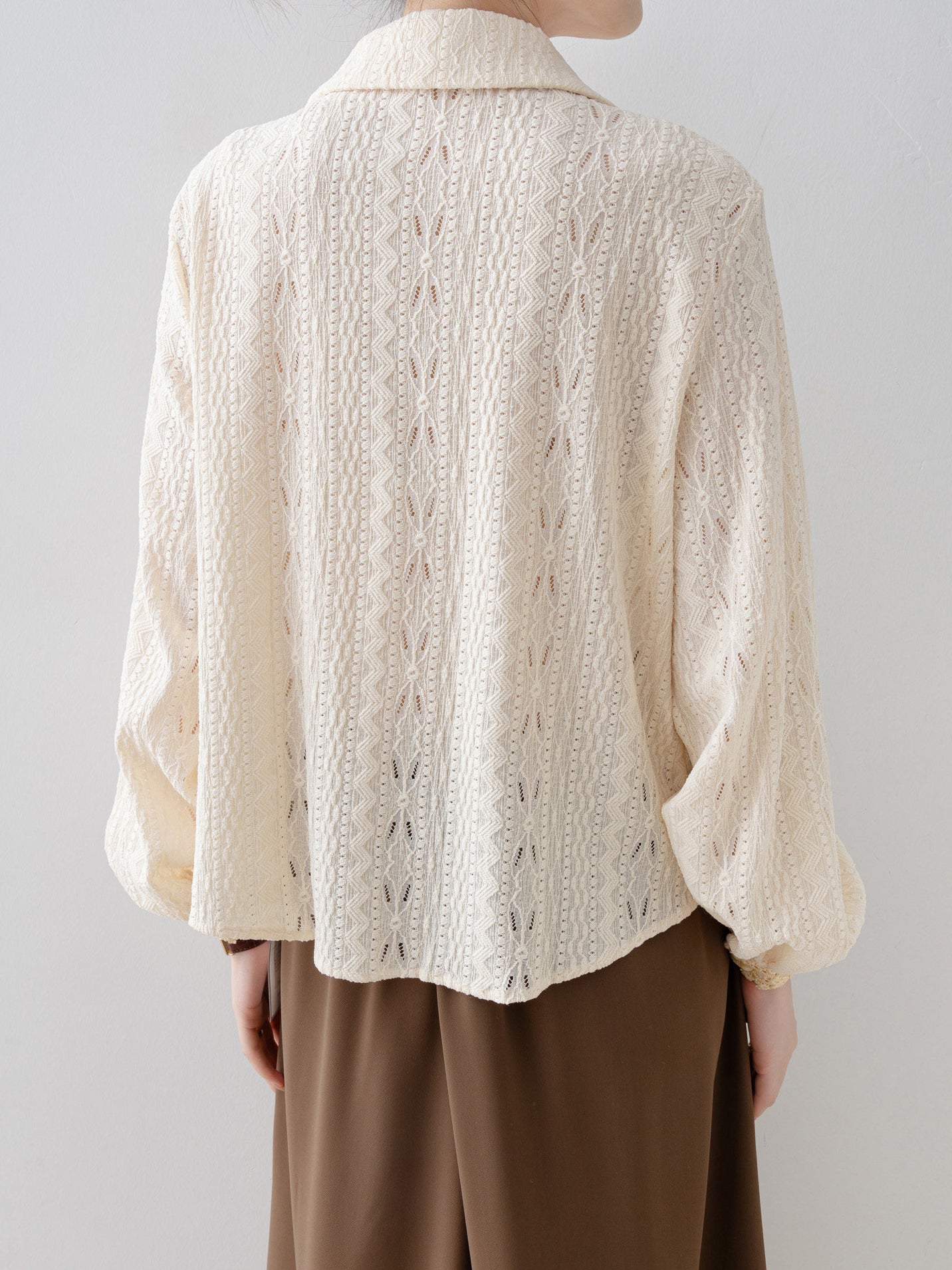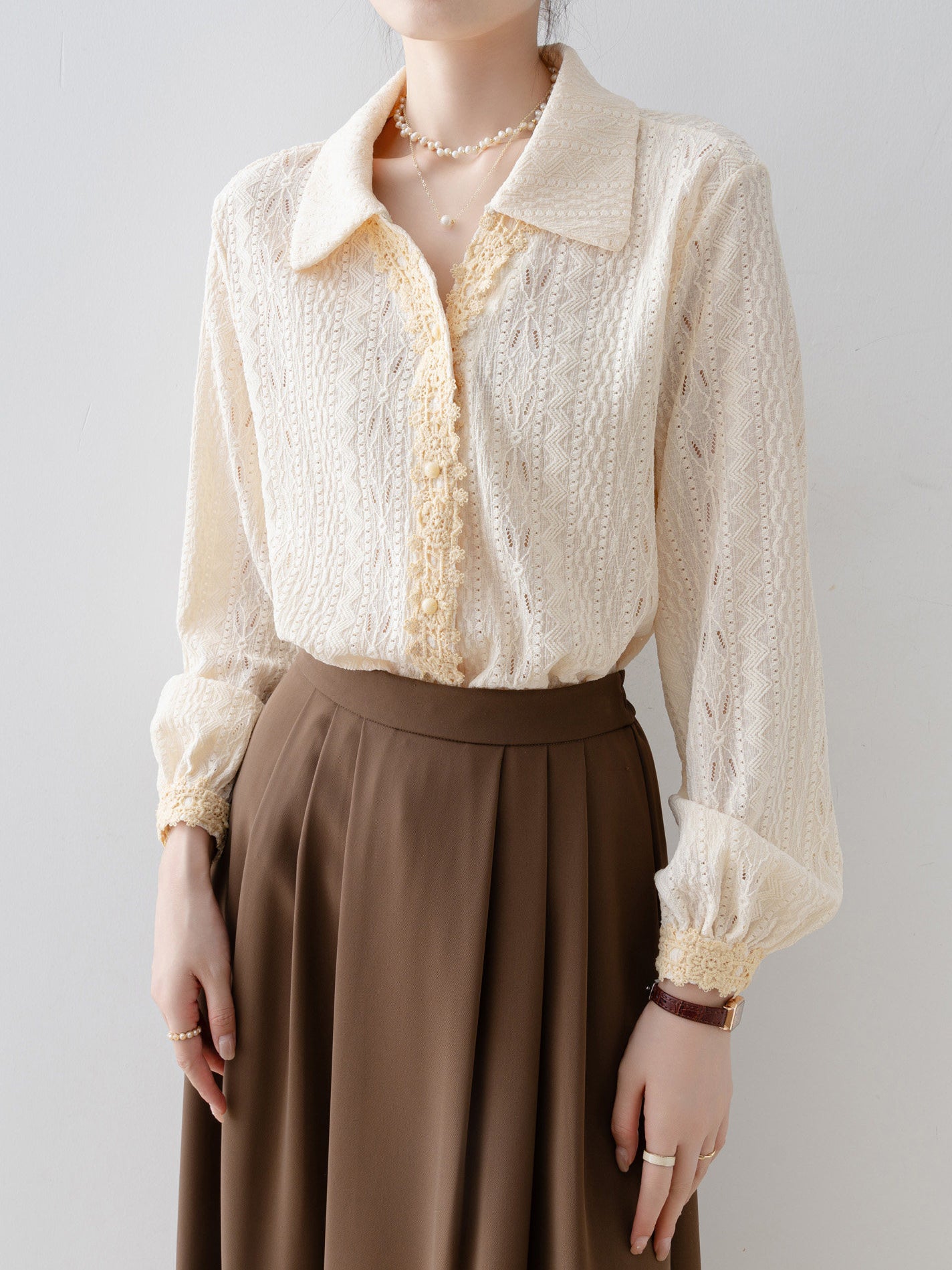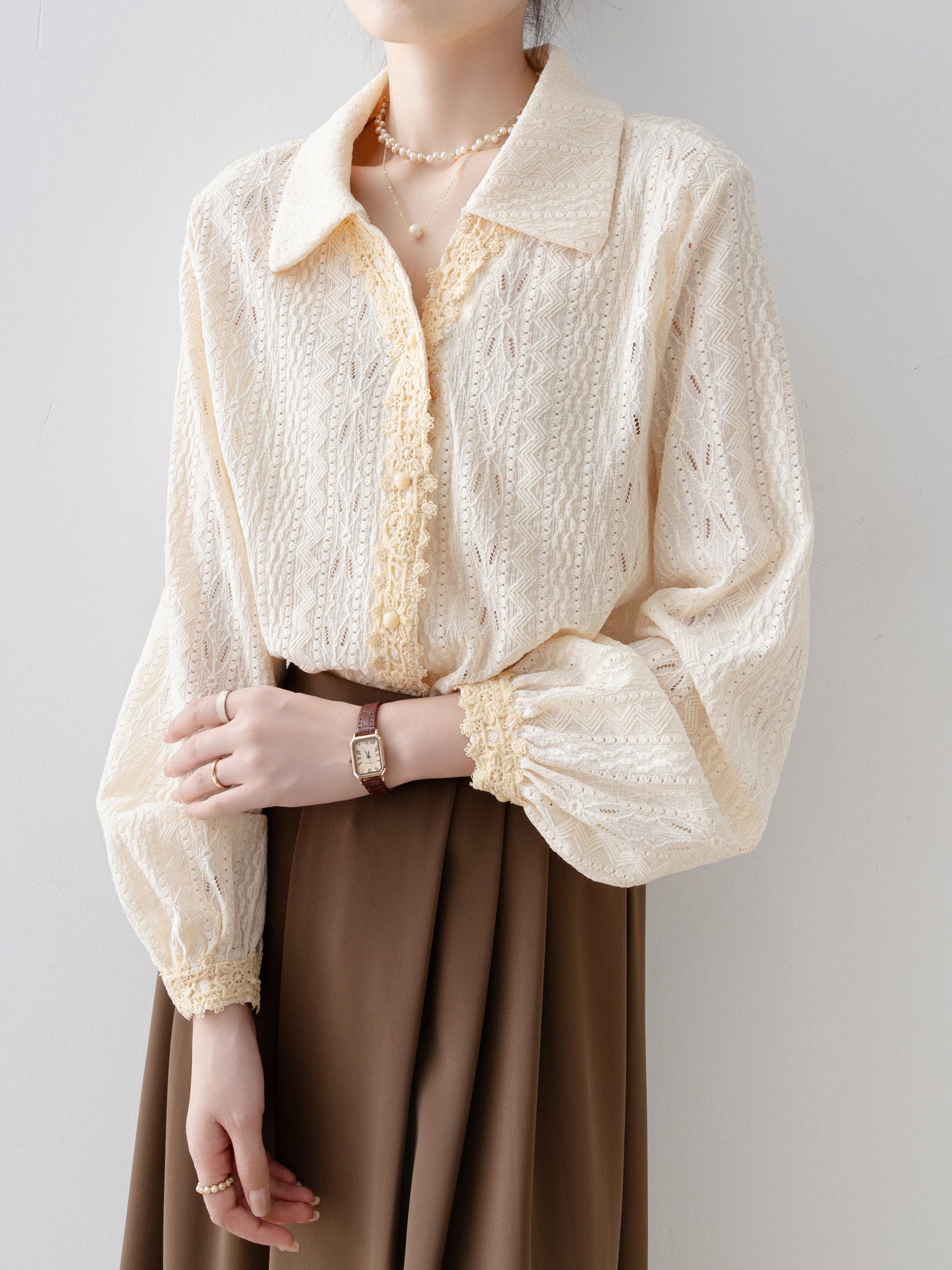 繊細で高級感のあるレースをドッキングされ、レディライクな大人ブラウス。