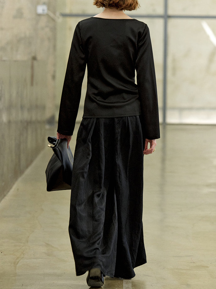 さらりとした素材で体のラインを拾いすぎず、華奢見せへと導いてくれます。