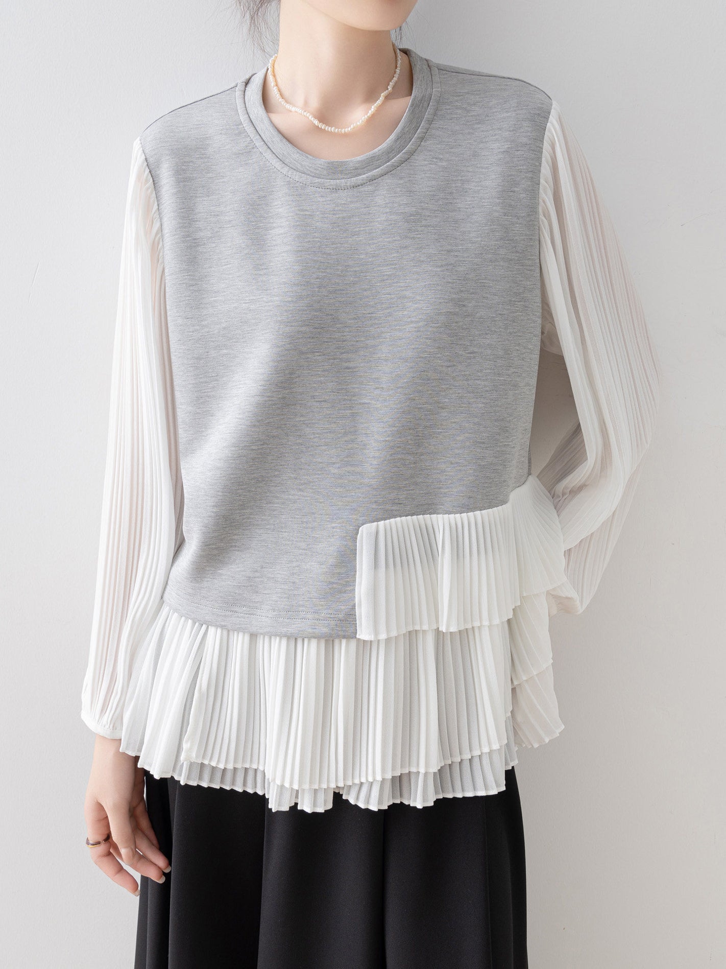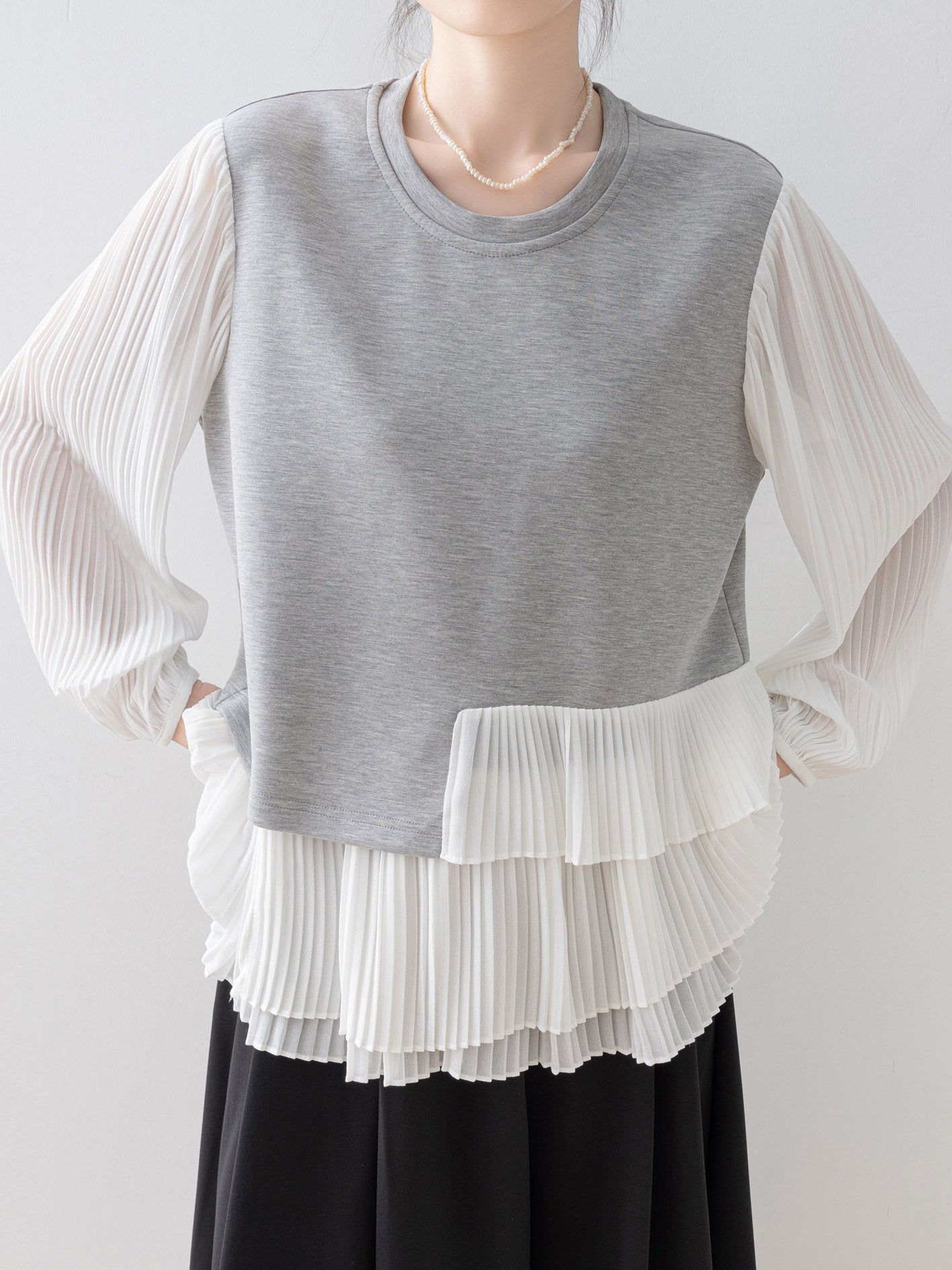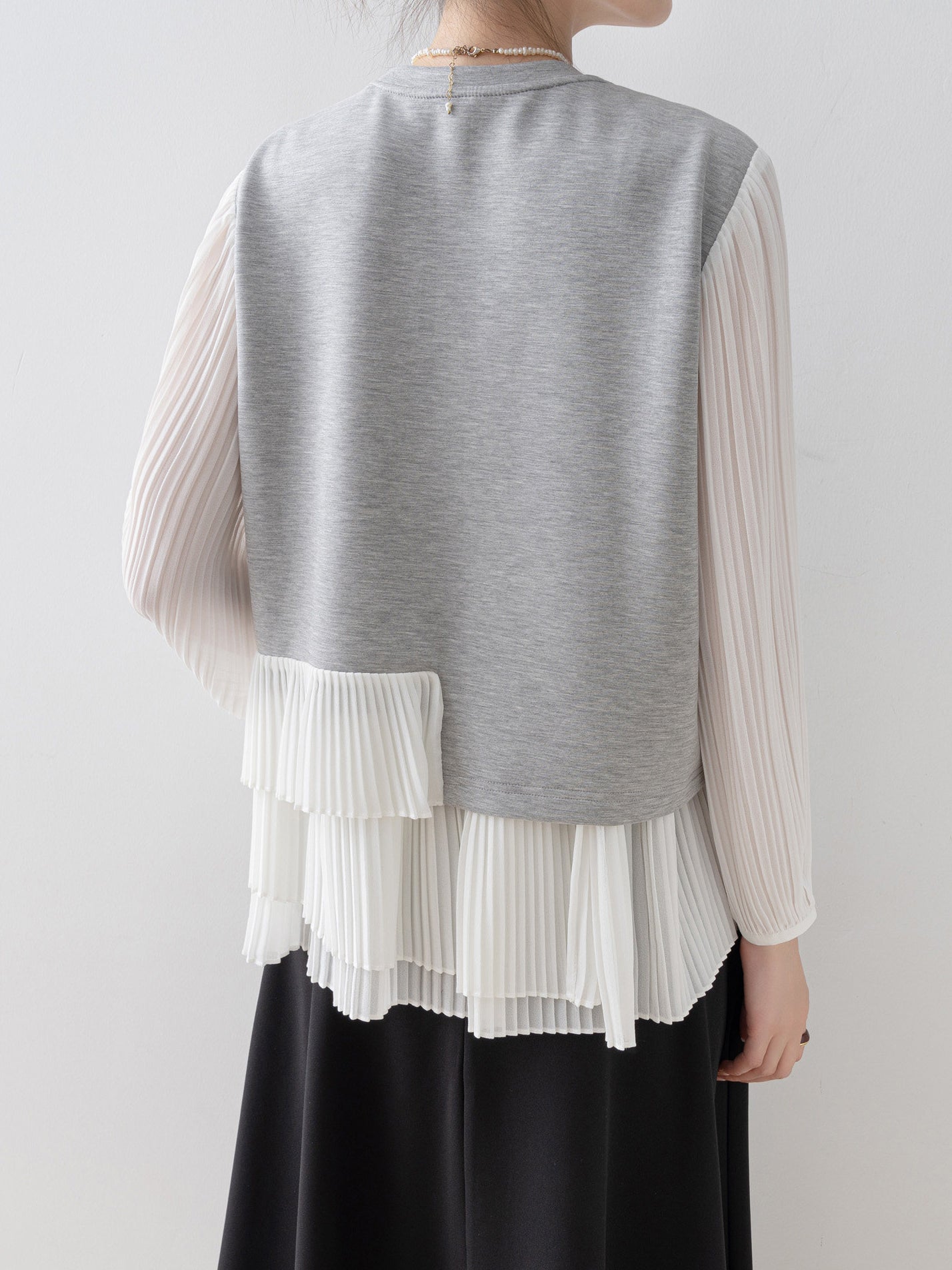 スウェットライクな身頃と透け感のあるプリーツ袖の組み合わせで、カジュアルさと華やかさを両立します。