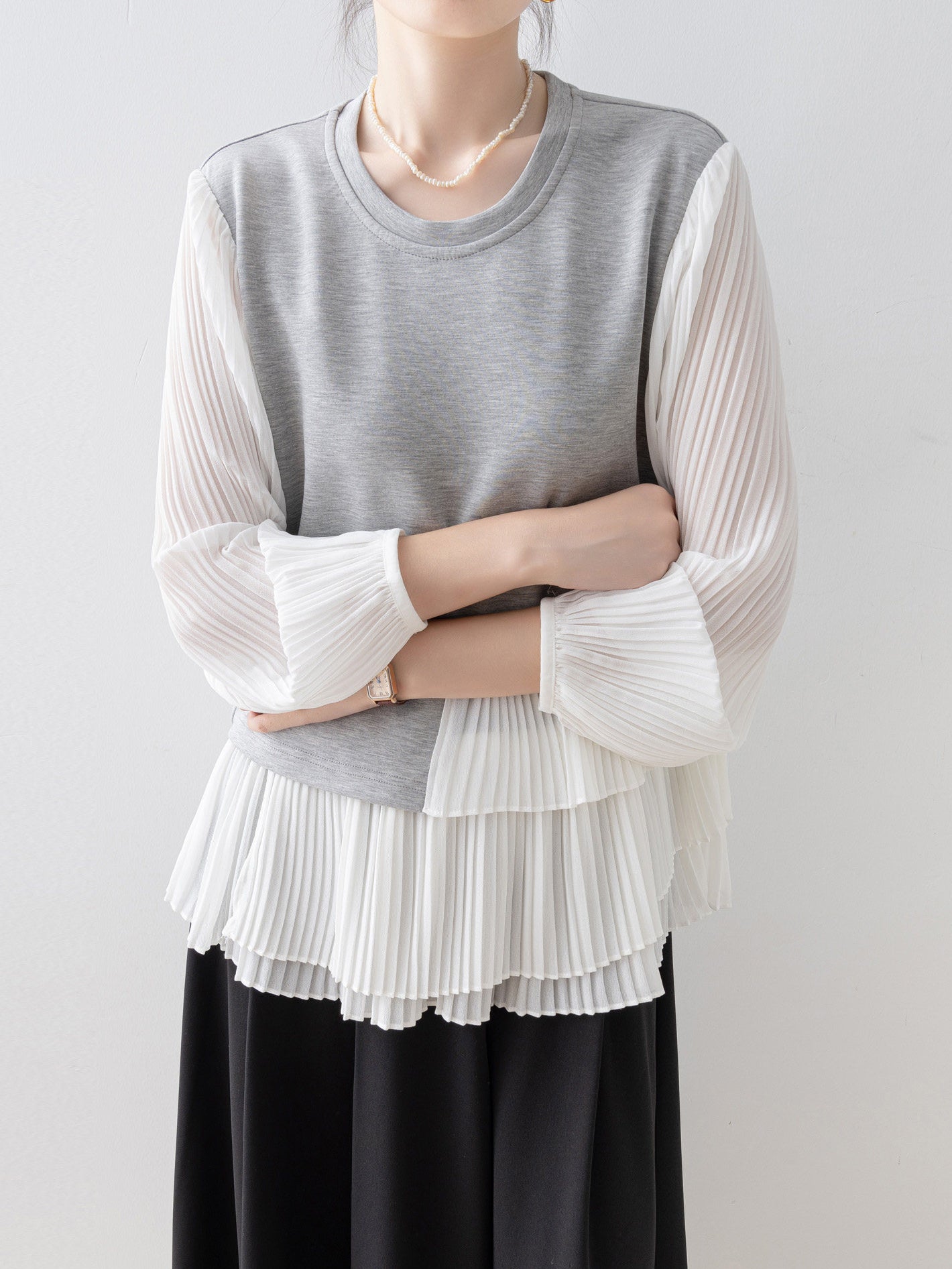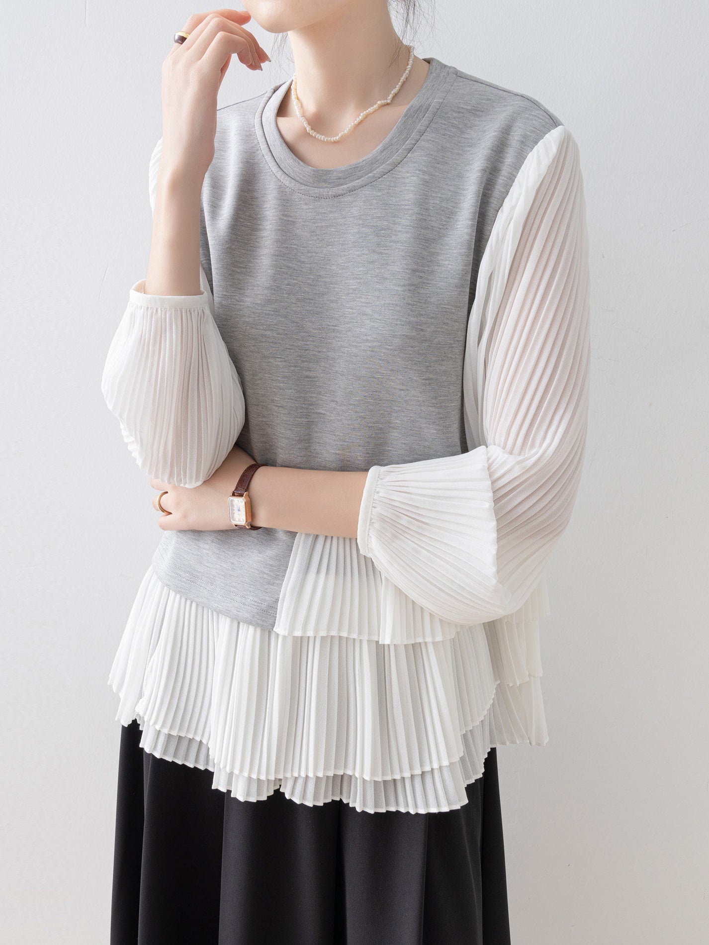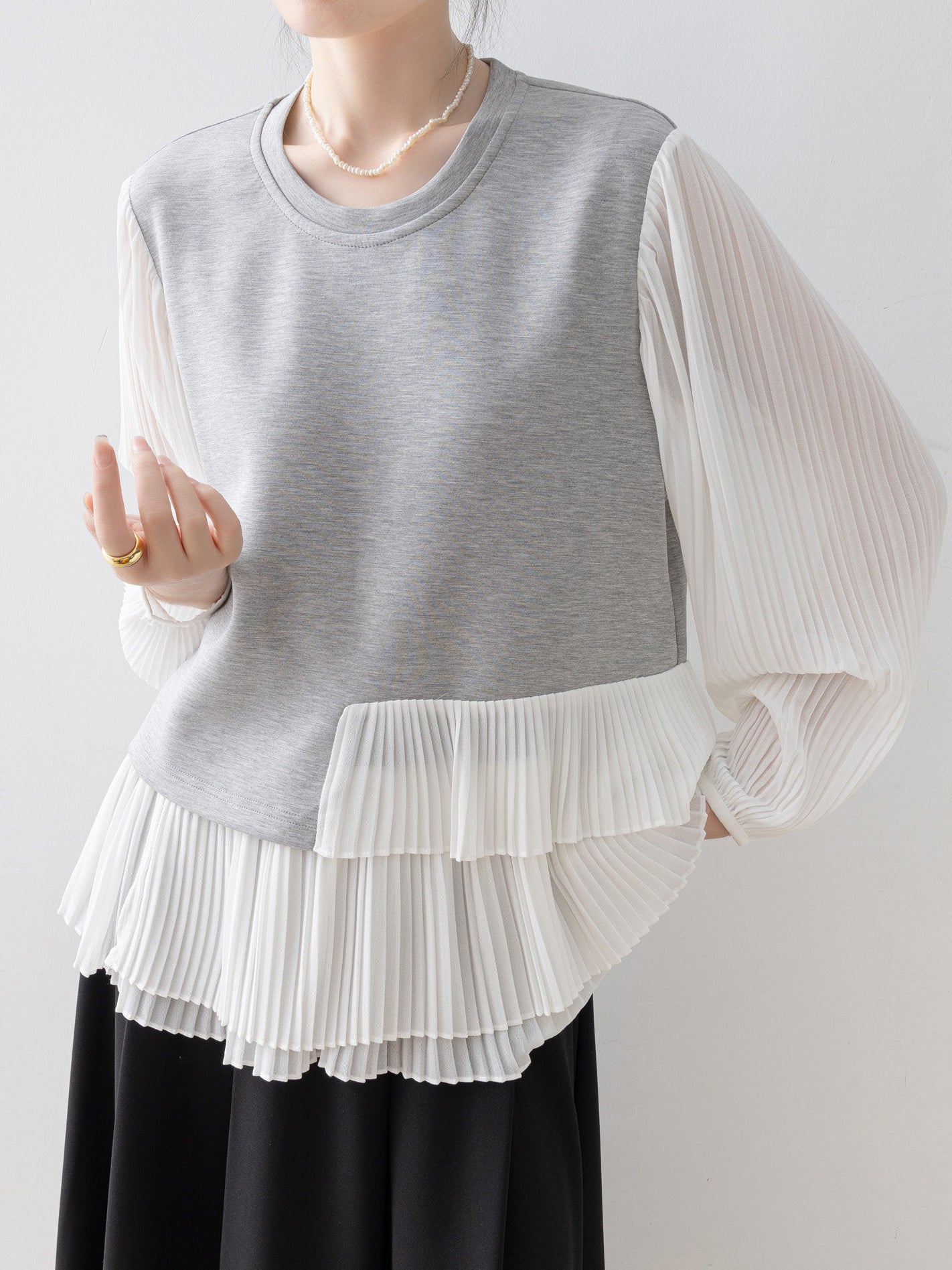 スウェットライクな身頃と透け感のあるプリーツ袖の組み合わせで、カジュアルさと華やかさを両立します。