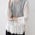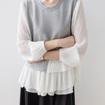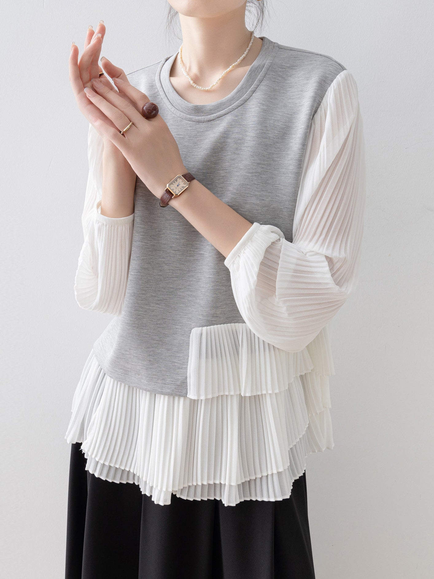 プリーツを重ねた異素材コンビが目を惹くトップス。