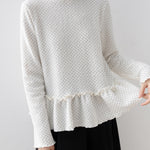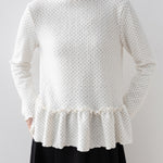 ☆フリルをあしらい、裾に向かってふんわり広がるペプラムデザインがレディライクな雰囲気を漂わせる。