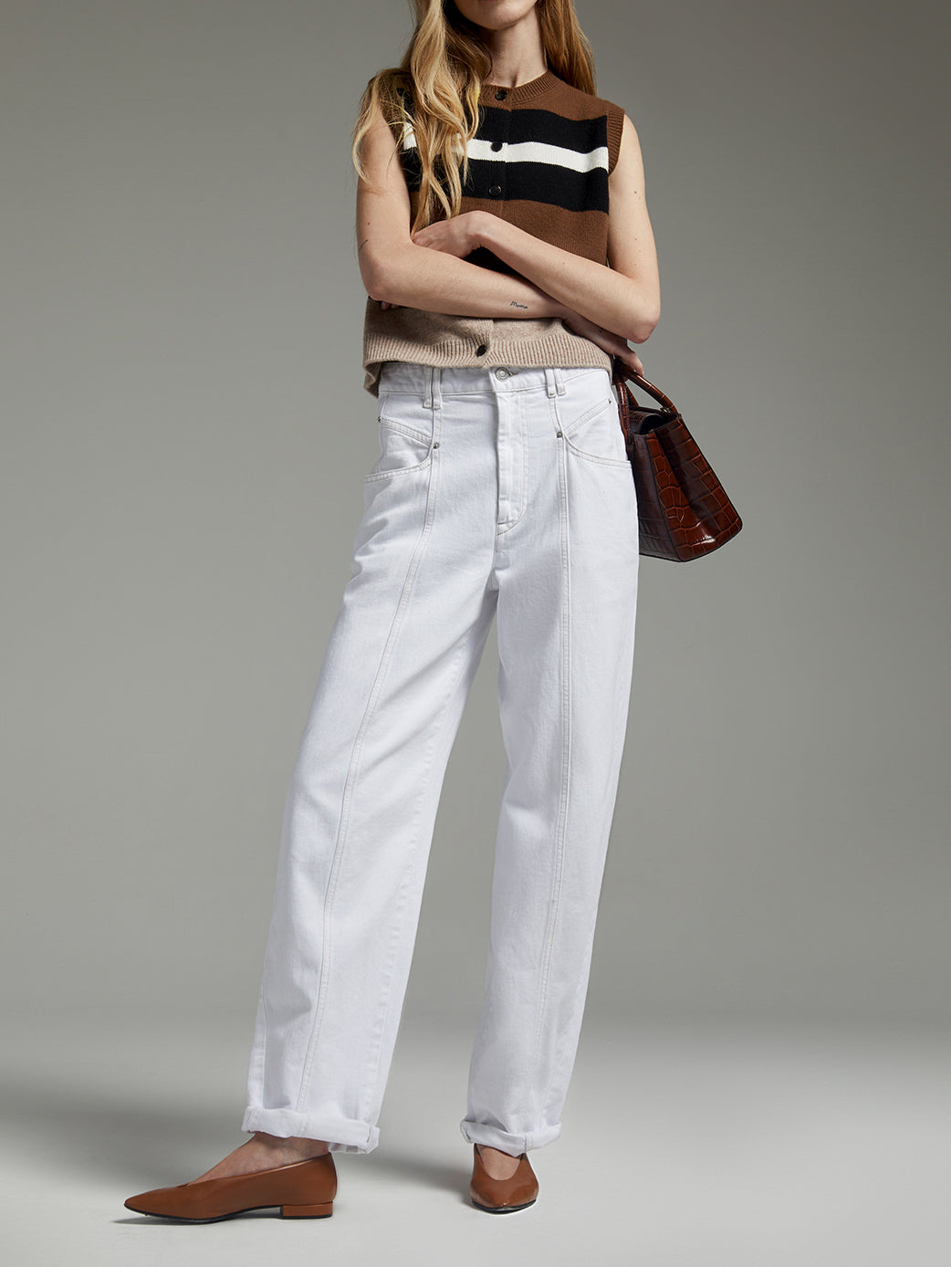 It goes well with tapered pants, straight pants, and I-line skirts with a clean silhouette .
