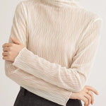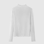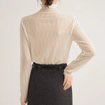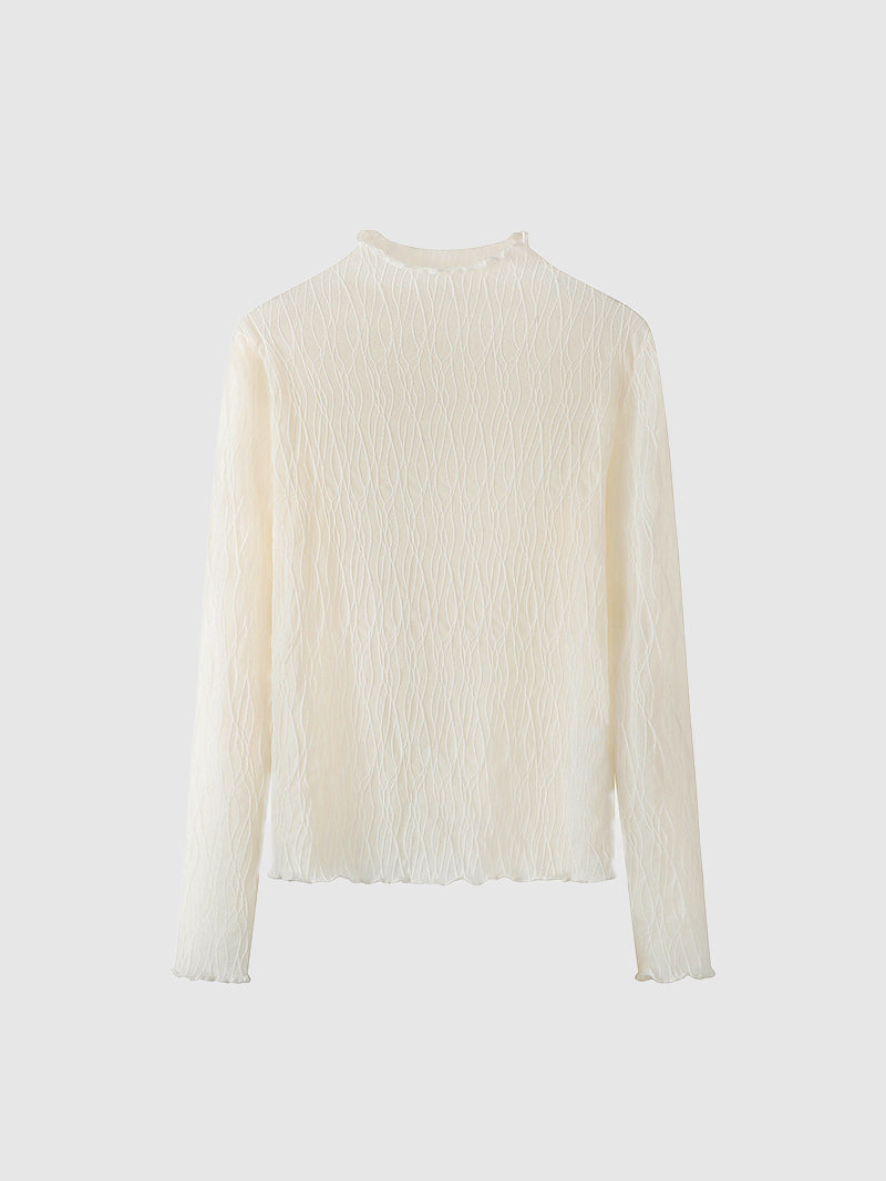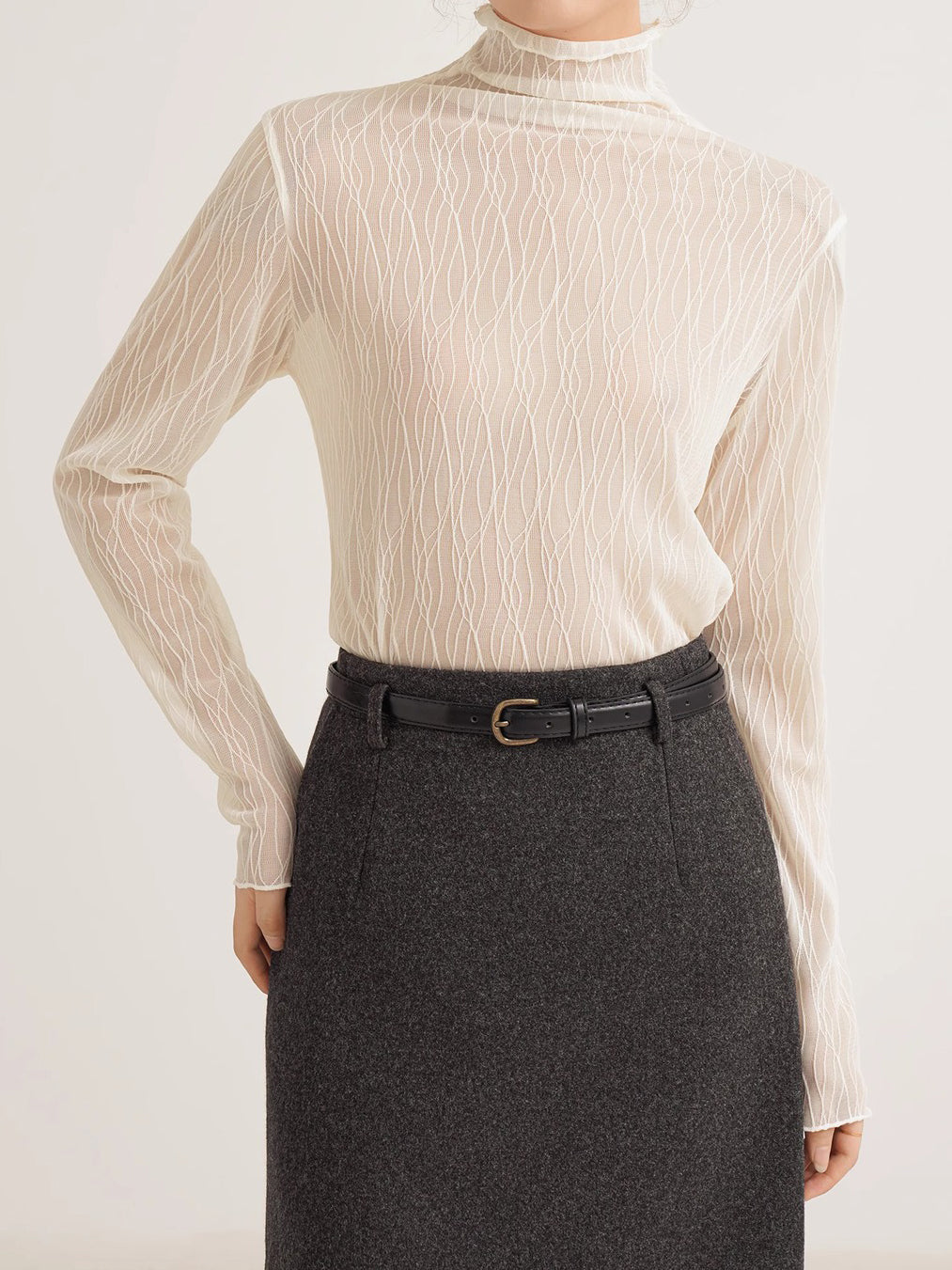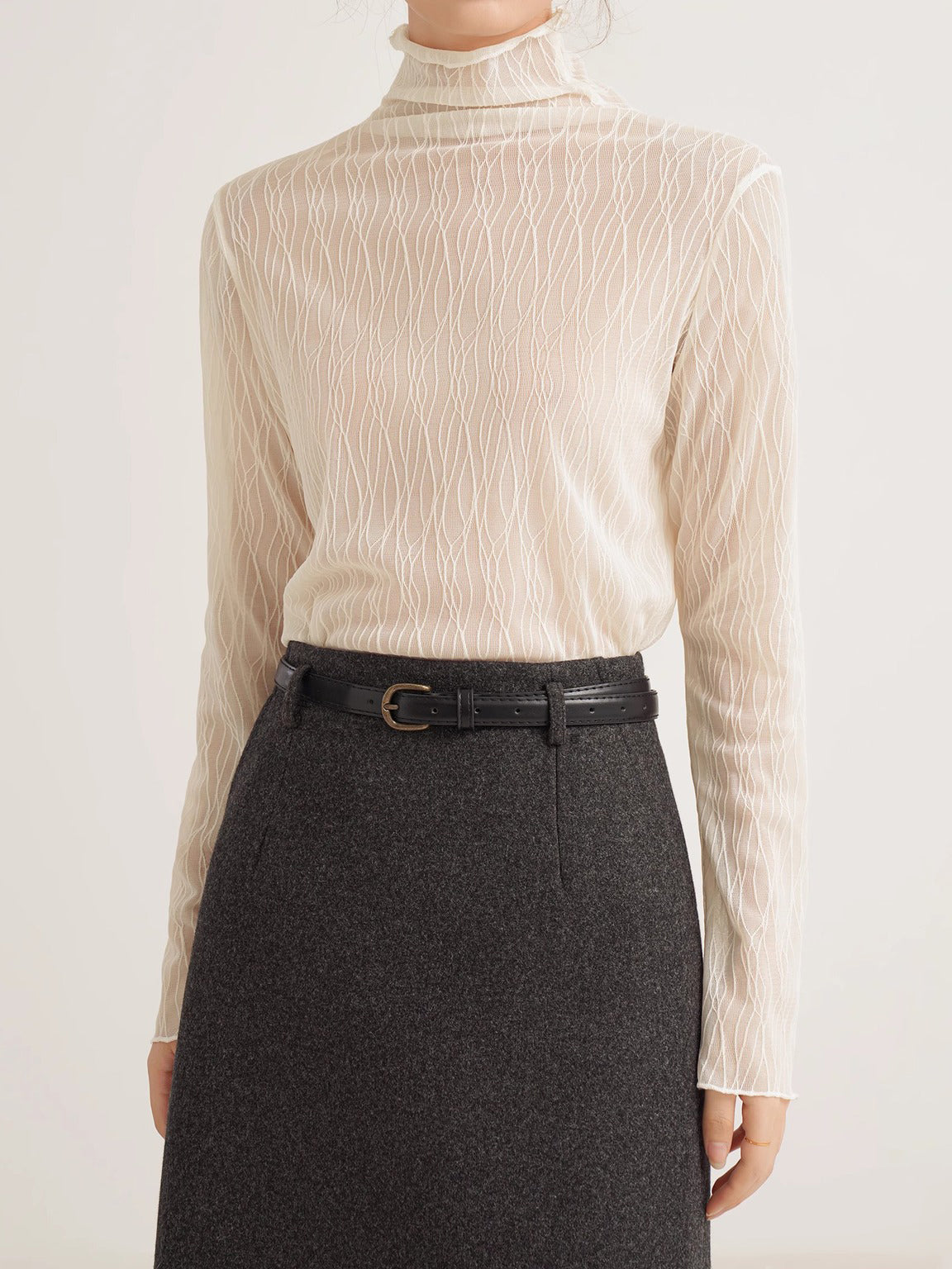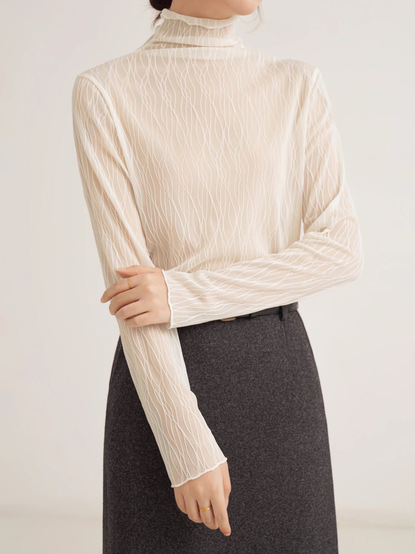 This mellow high neck sheer wave lace top is an elegant piece featuring delicate wave lace and sheer material.