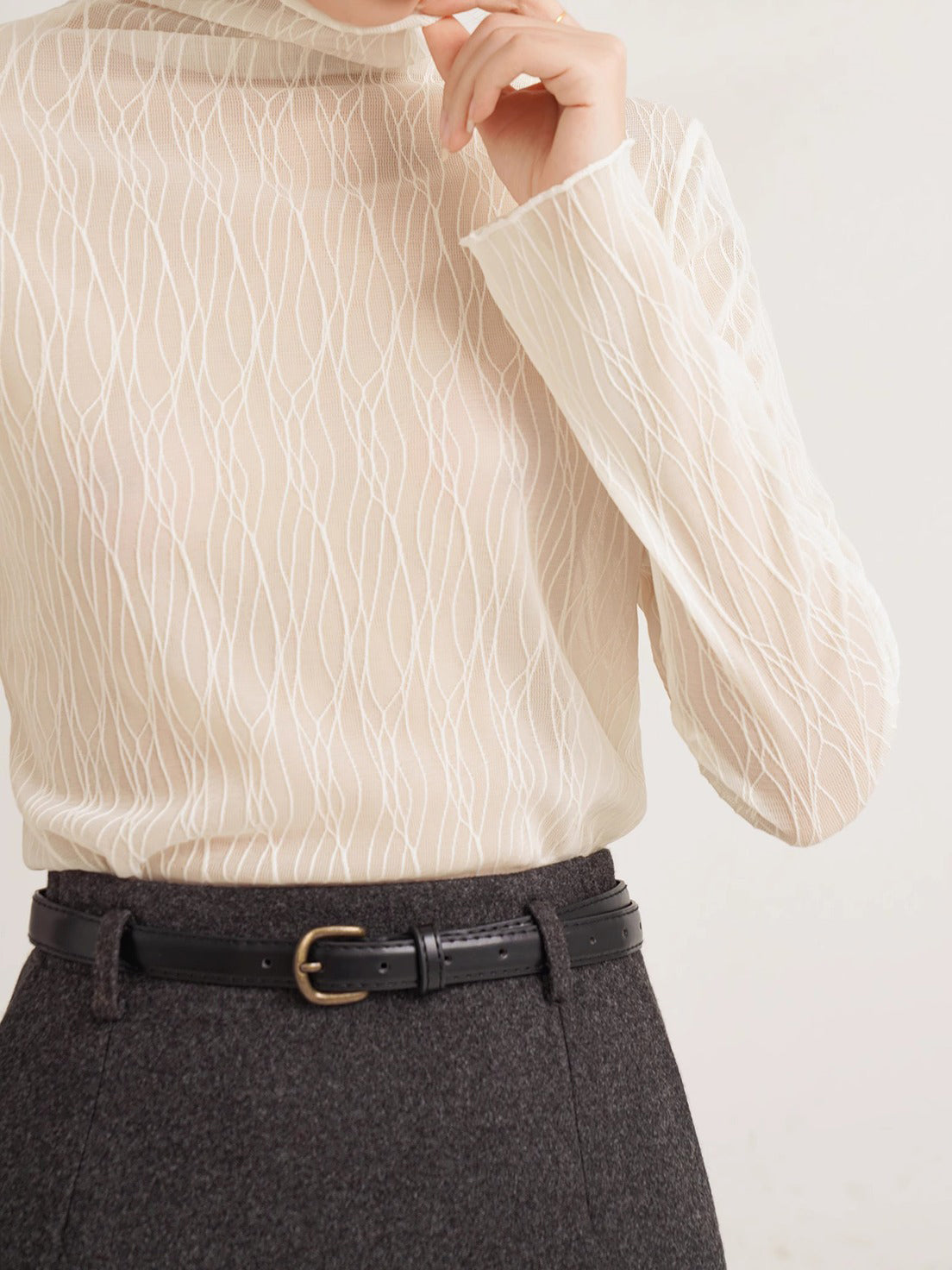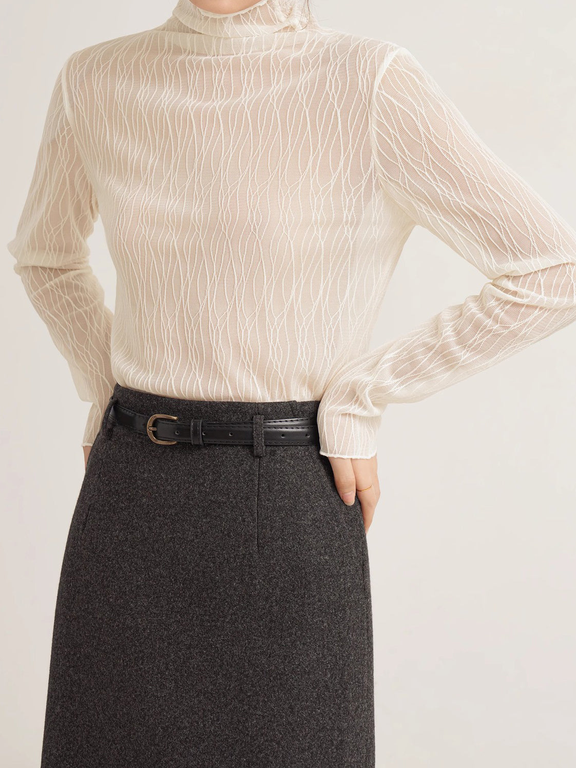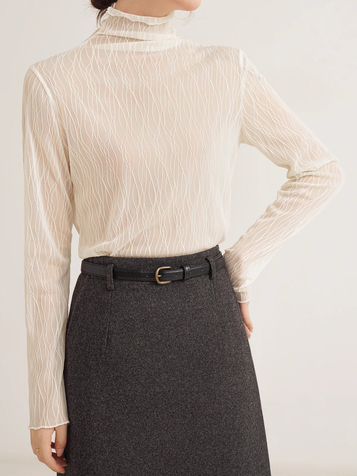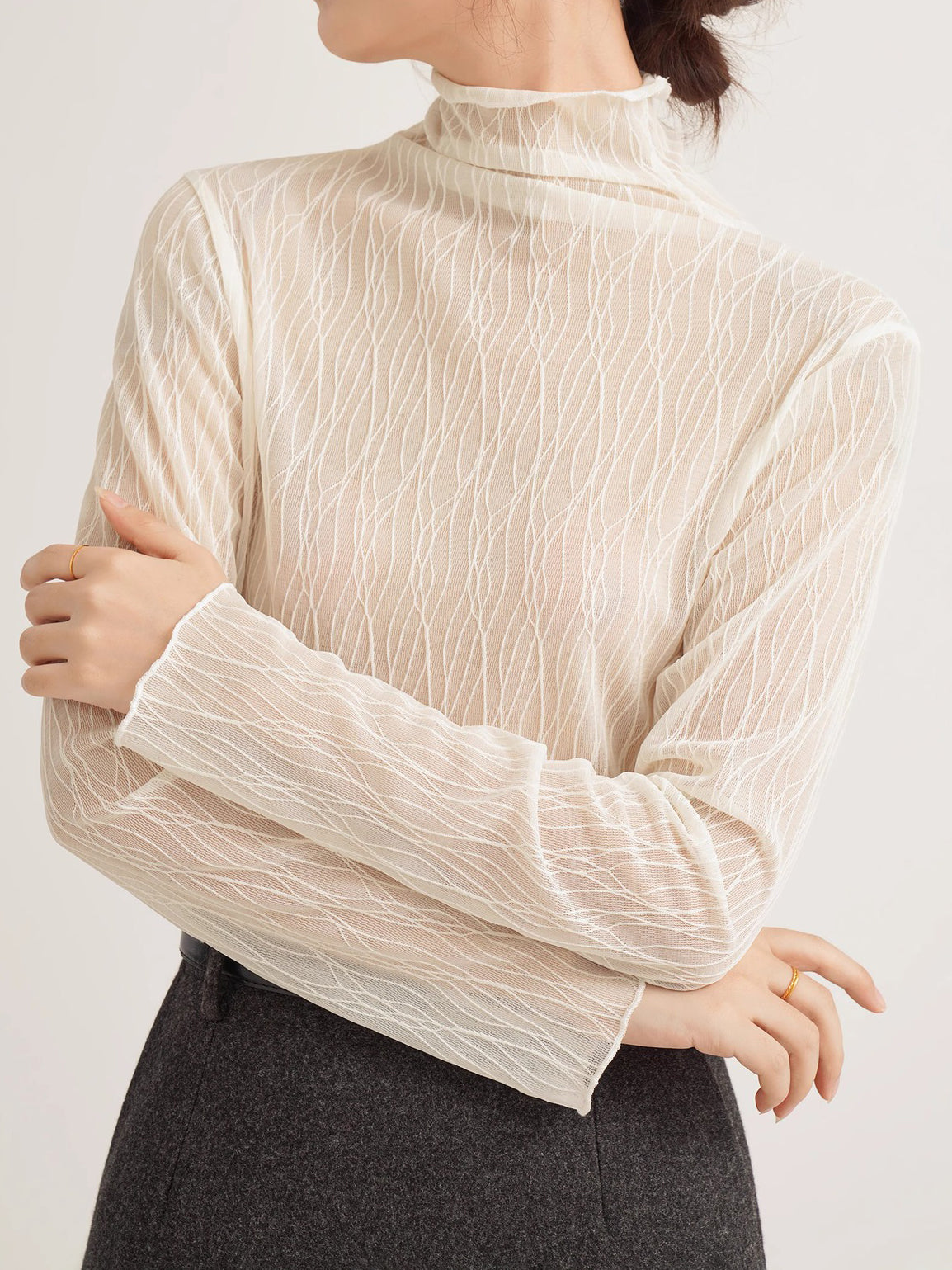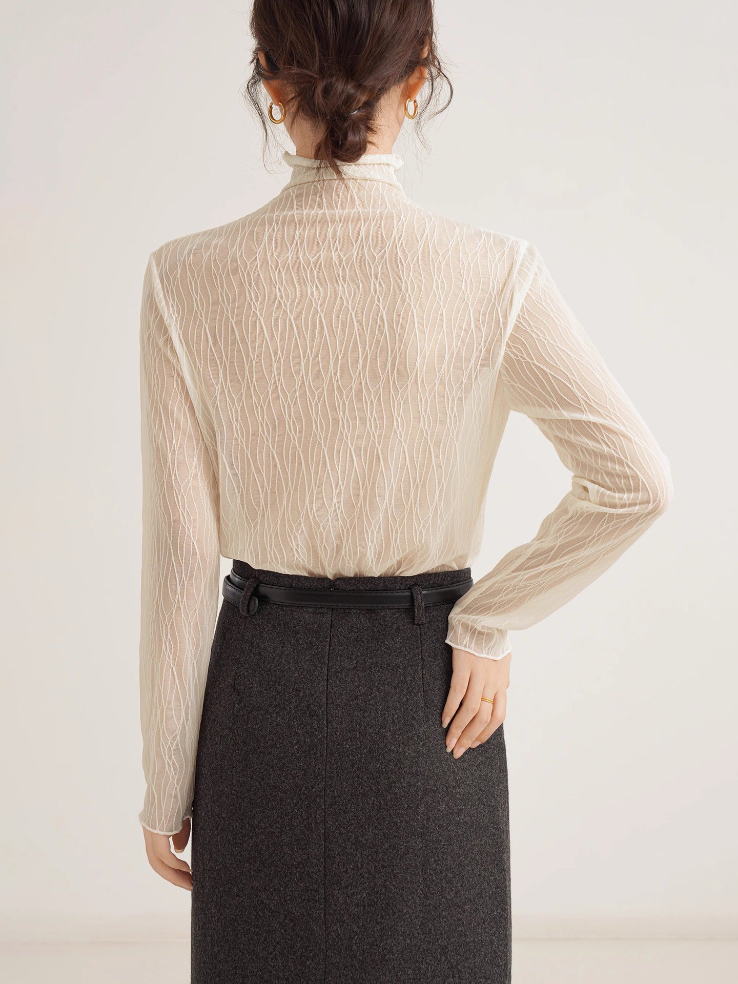 [ An elegant high-neck top made of wavy lace and sheer material ]