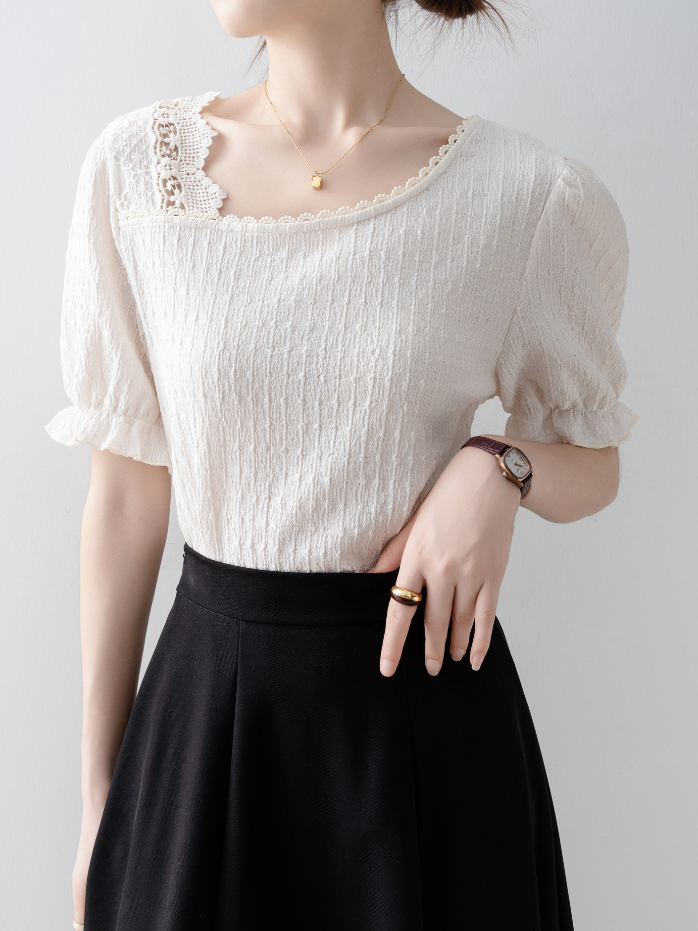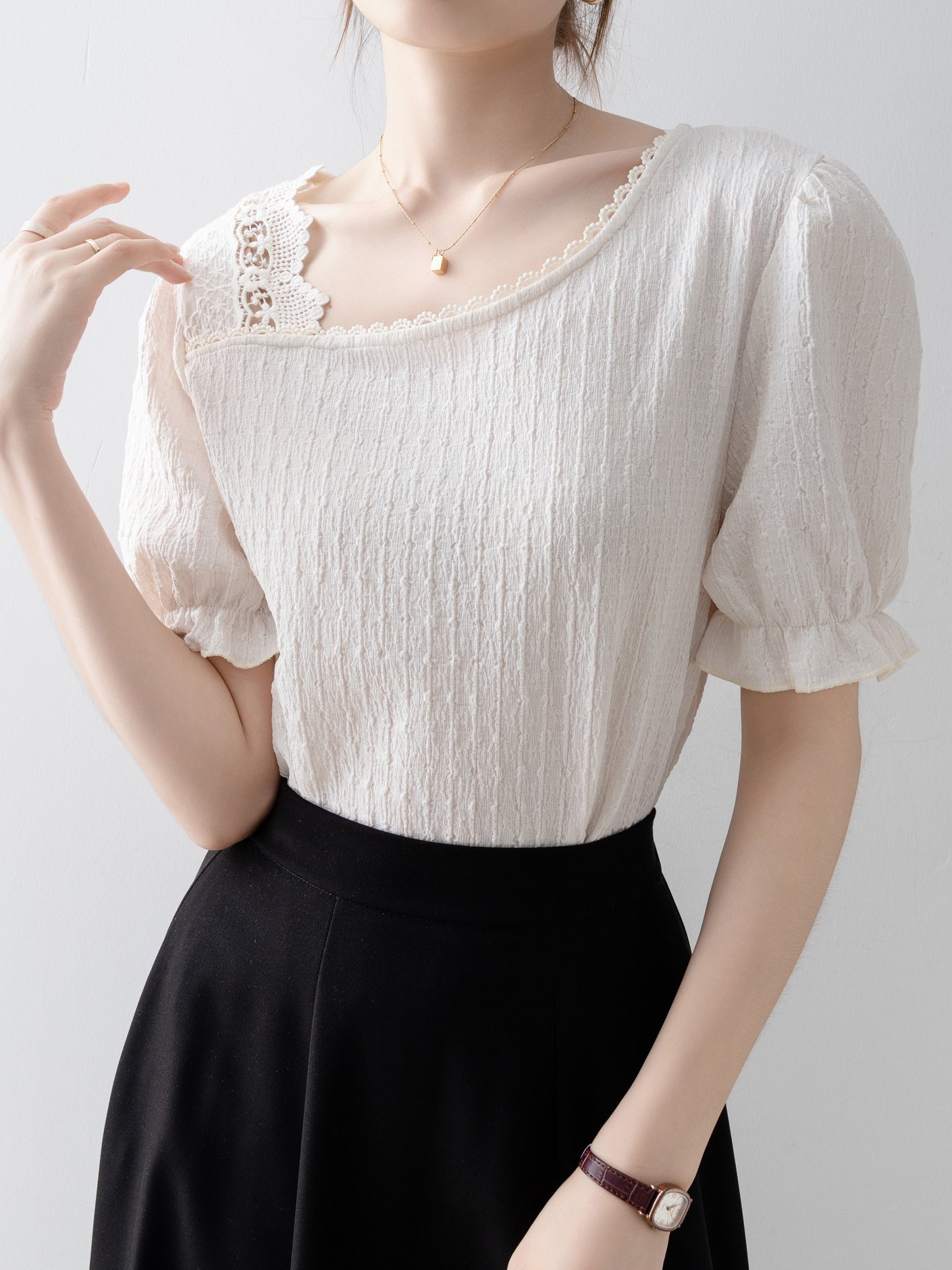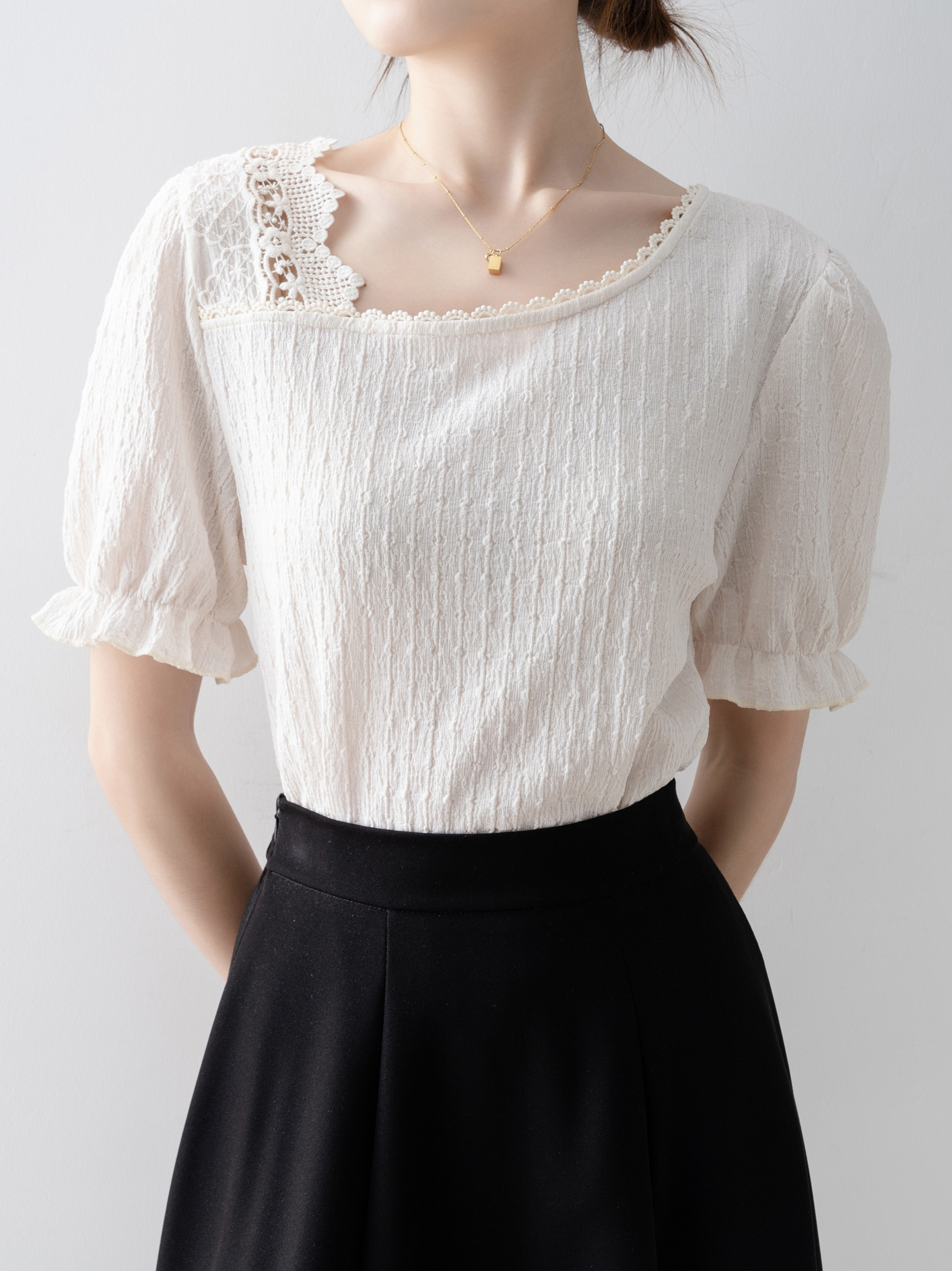 An eye-catching blouse with an asymmetrical collar and lace adorning it.