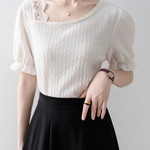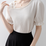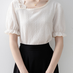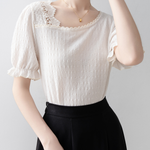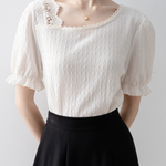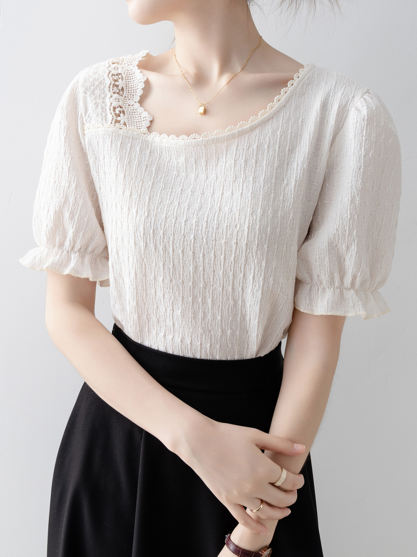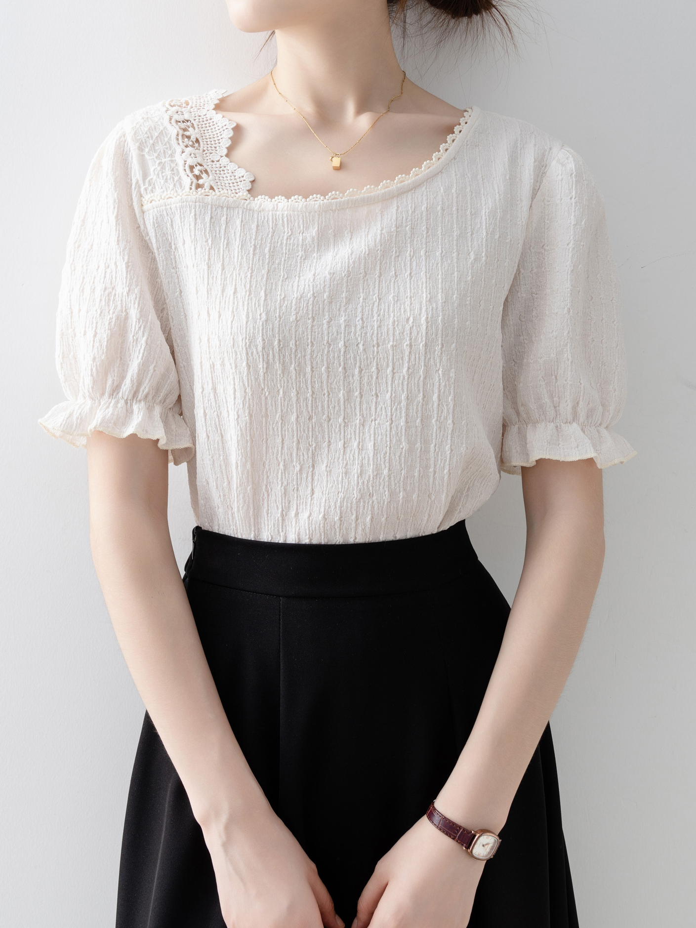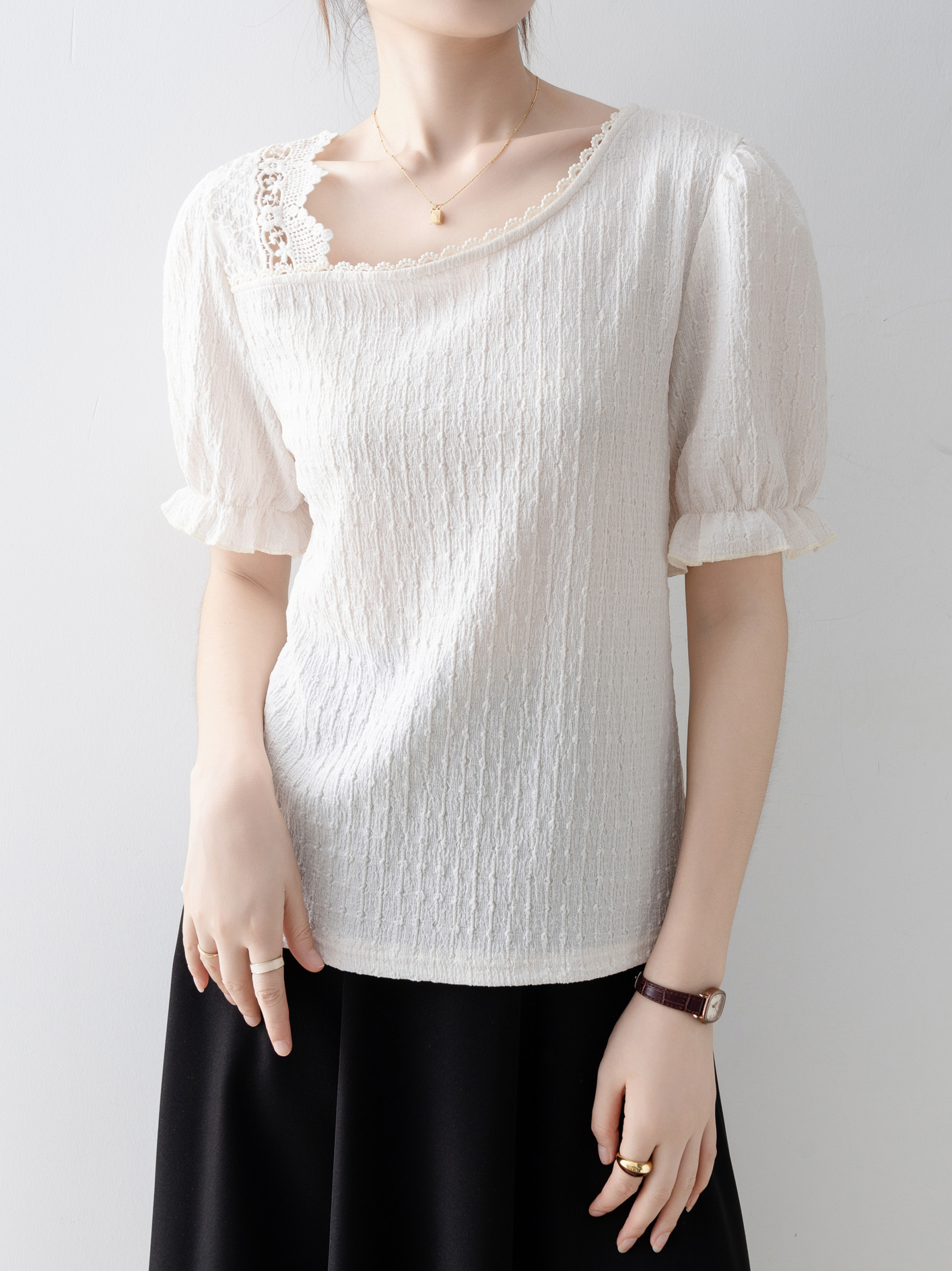 An eye-catching blouse with an asymmetrical collar and lace adorning it.