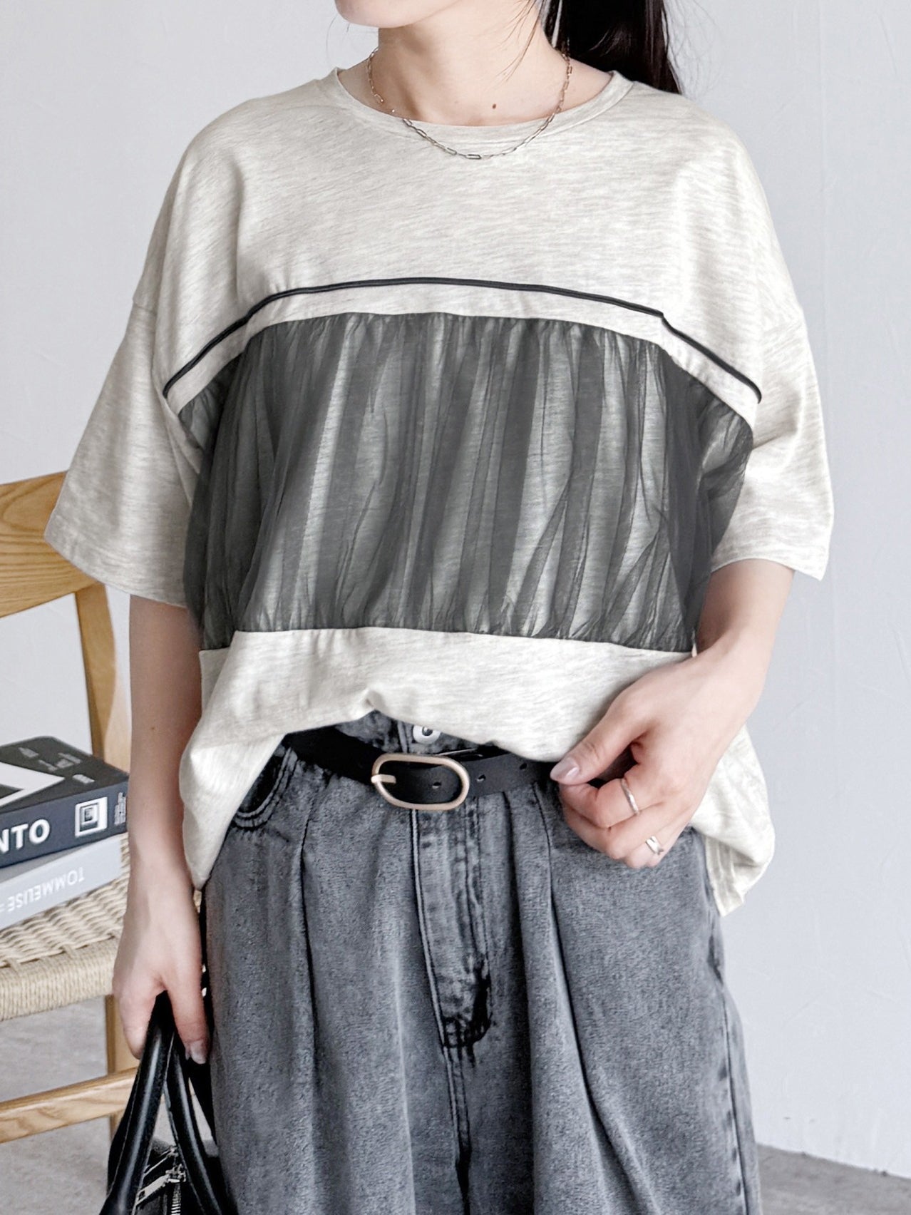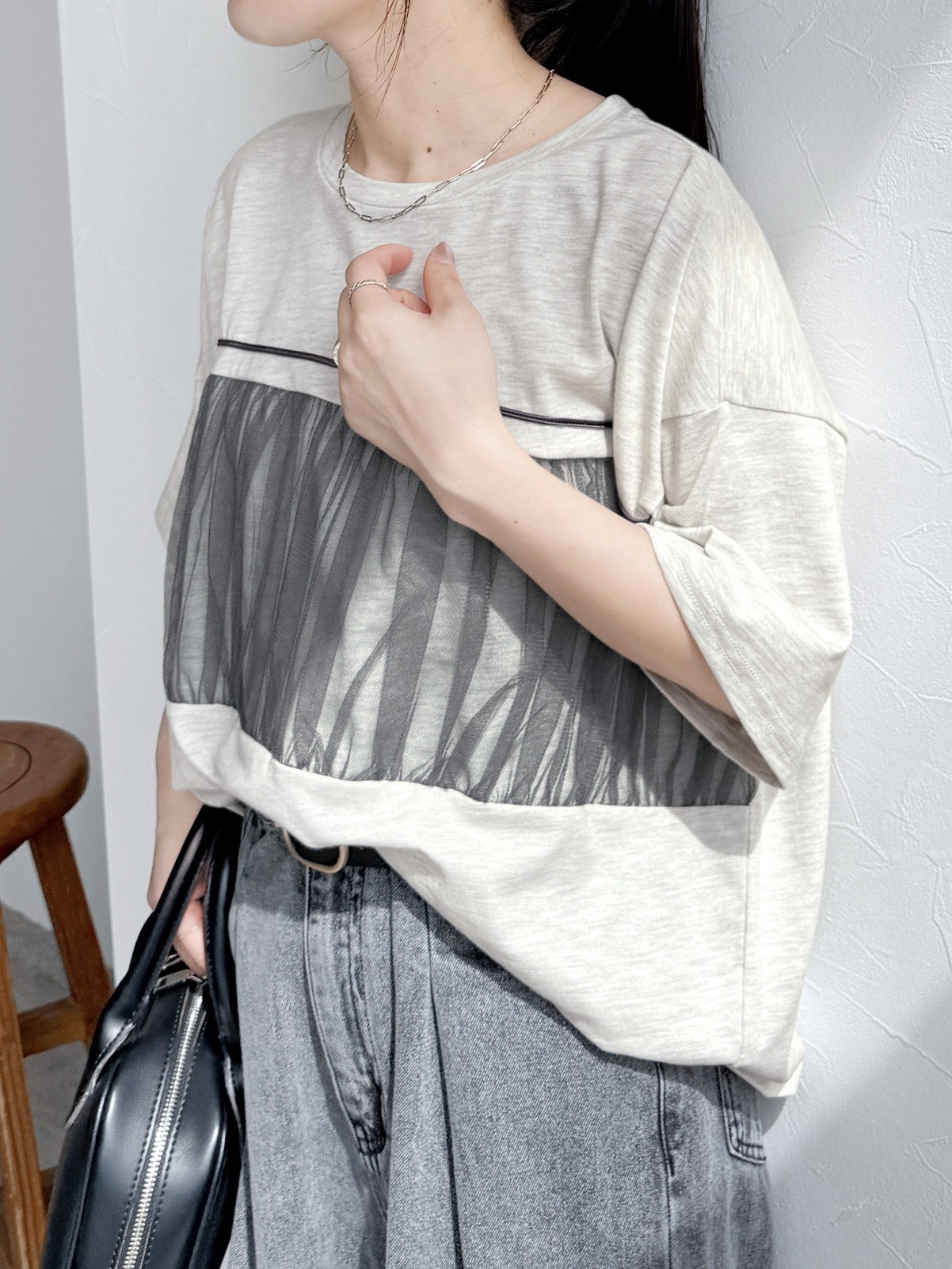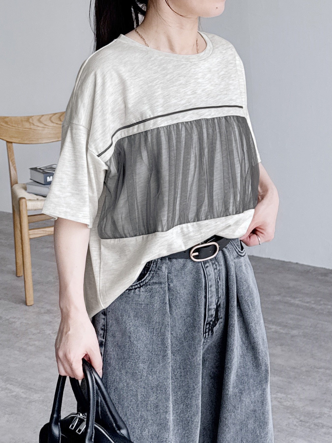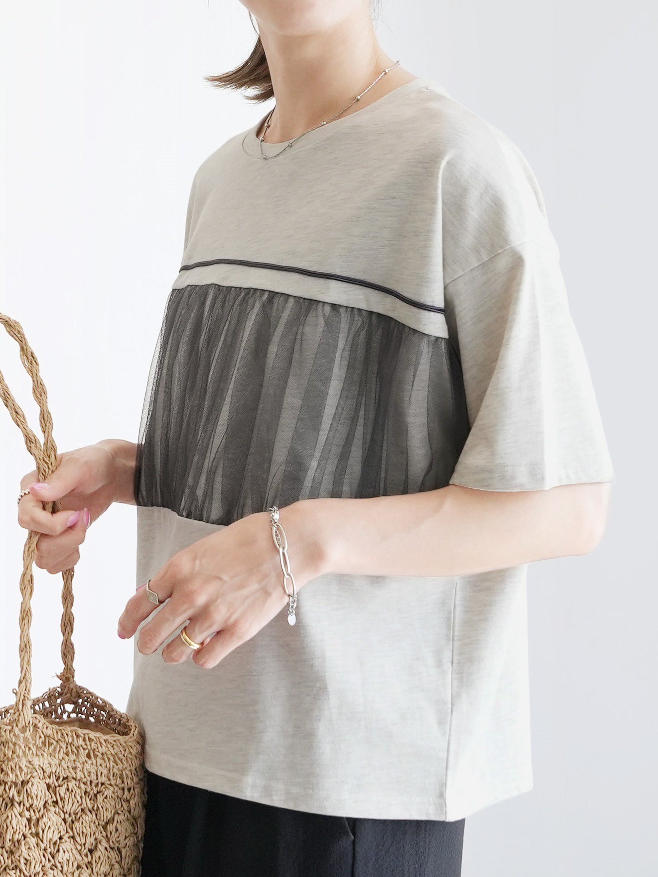 -This is a sweet T-shirt with tulle, so we recommend wearing it casually with denim or wide pants.