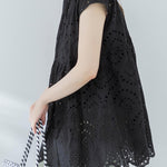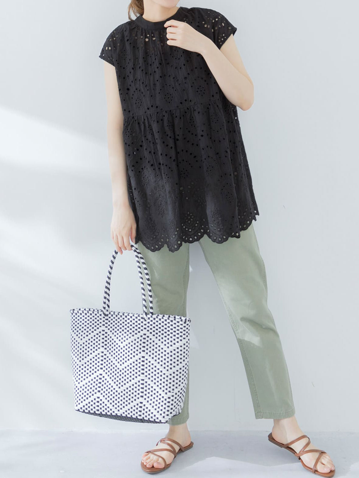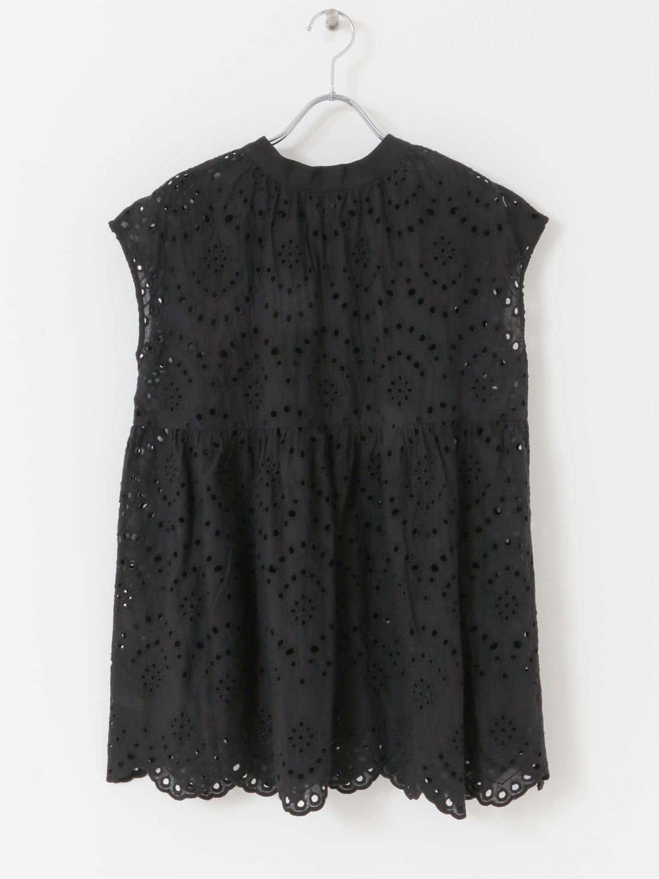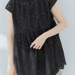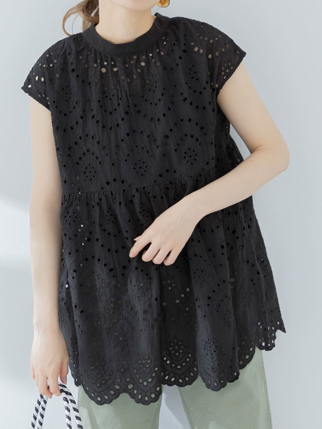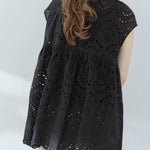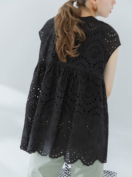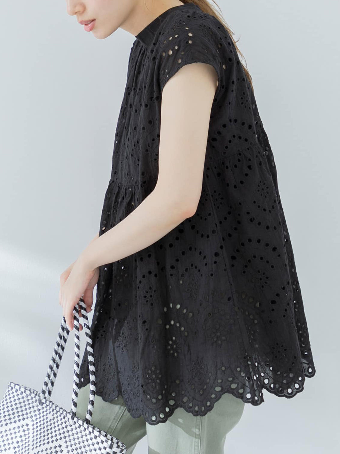 This blouse has a cool feel with cutwork lace that gives just the right amount of transparency to the skin.