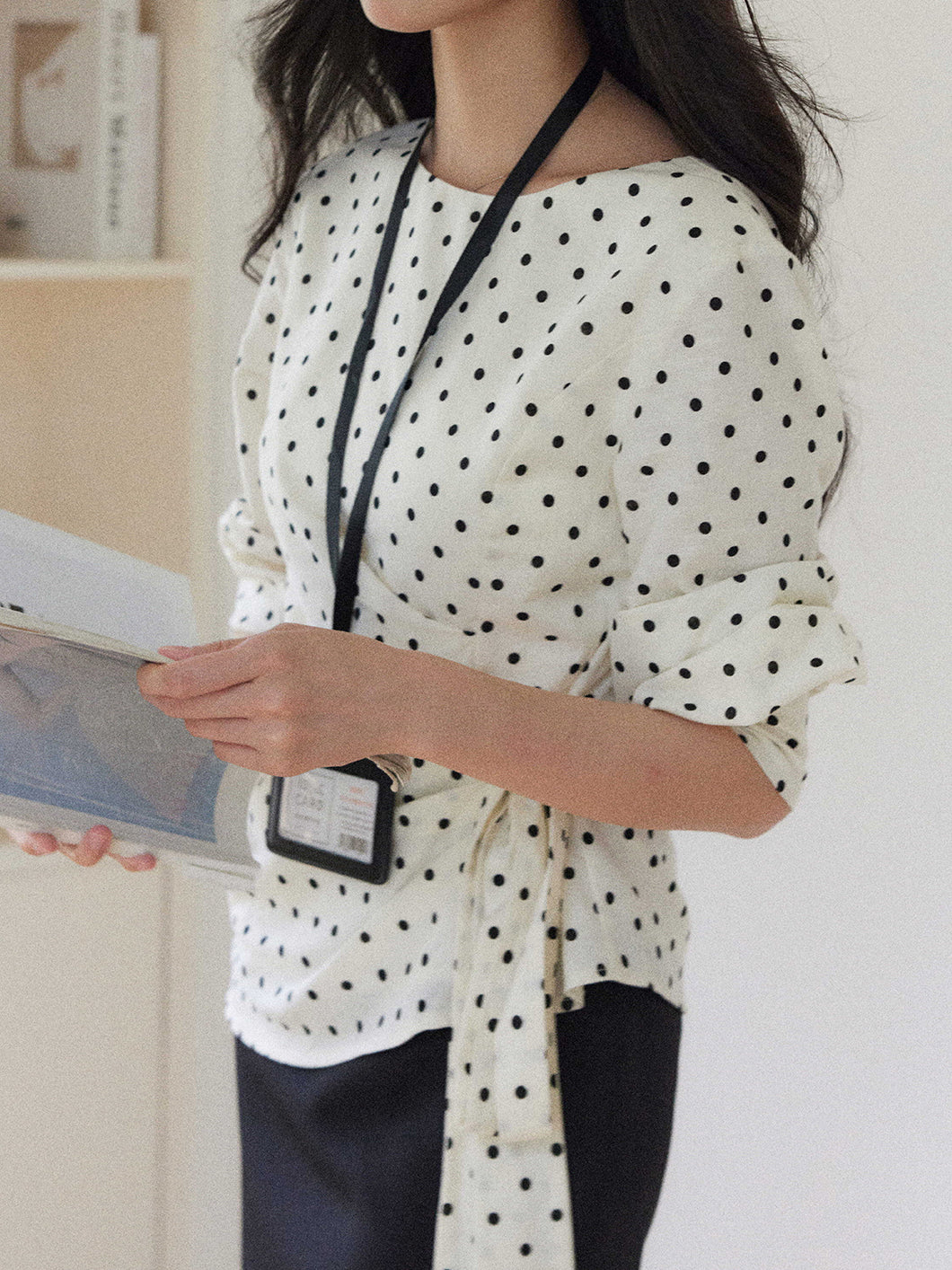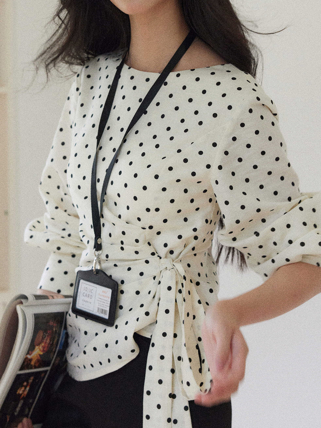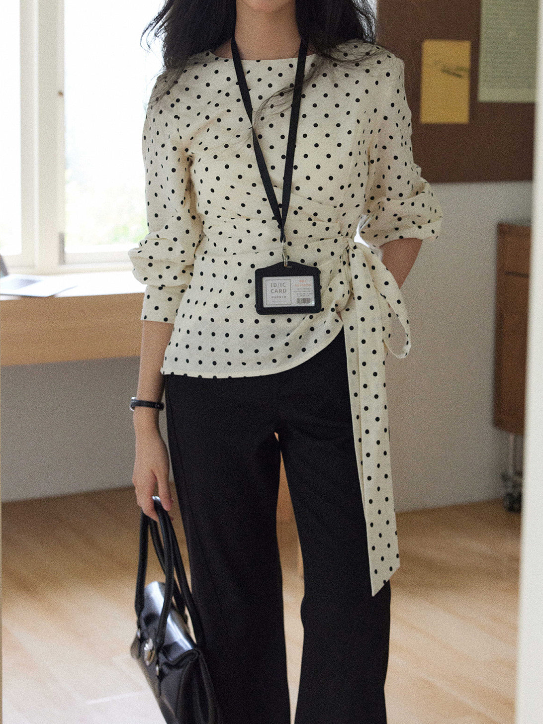 A dotted blouse with a trendy side ribbon ties for easy styling.