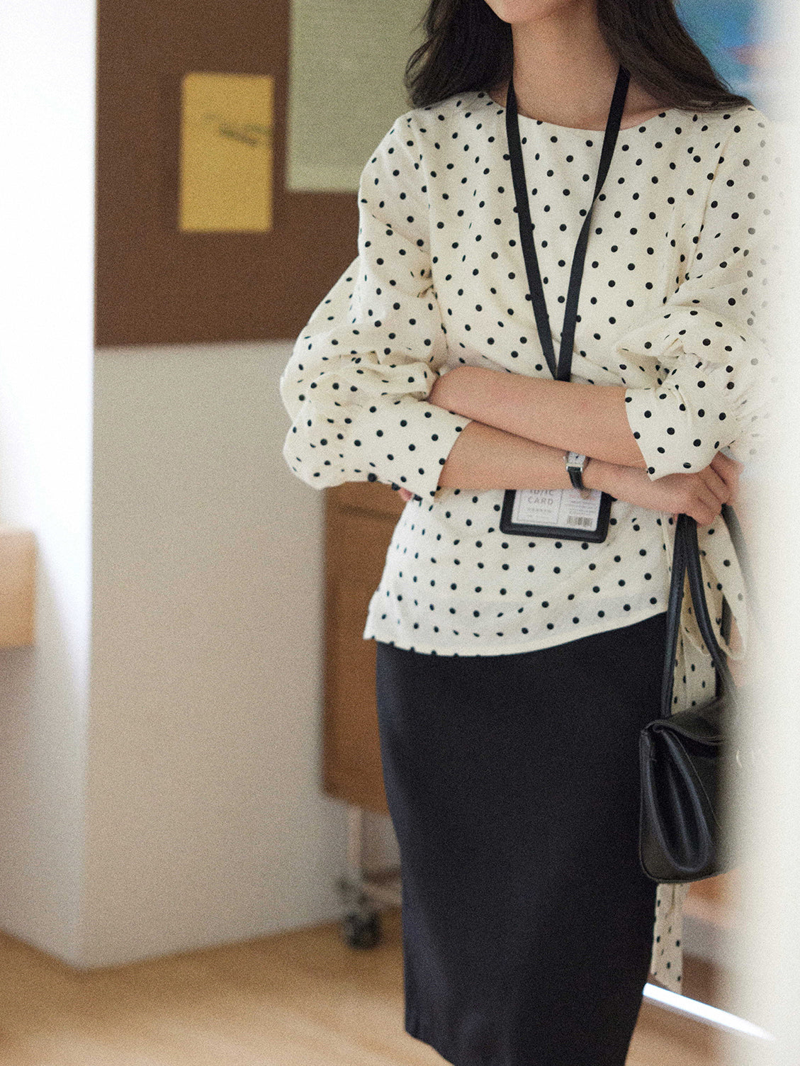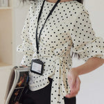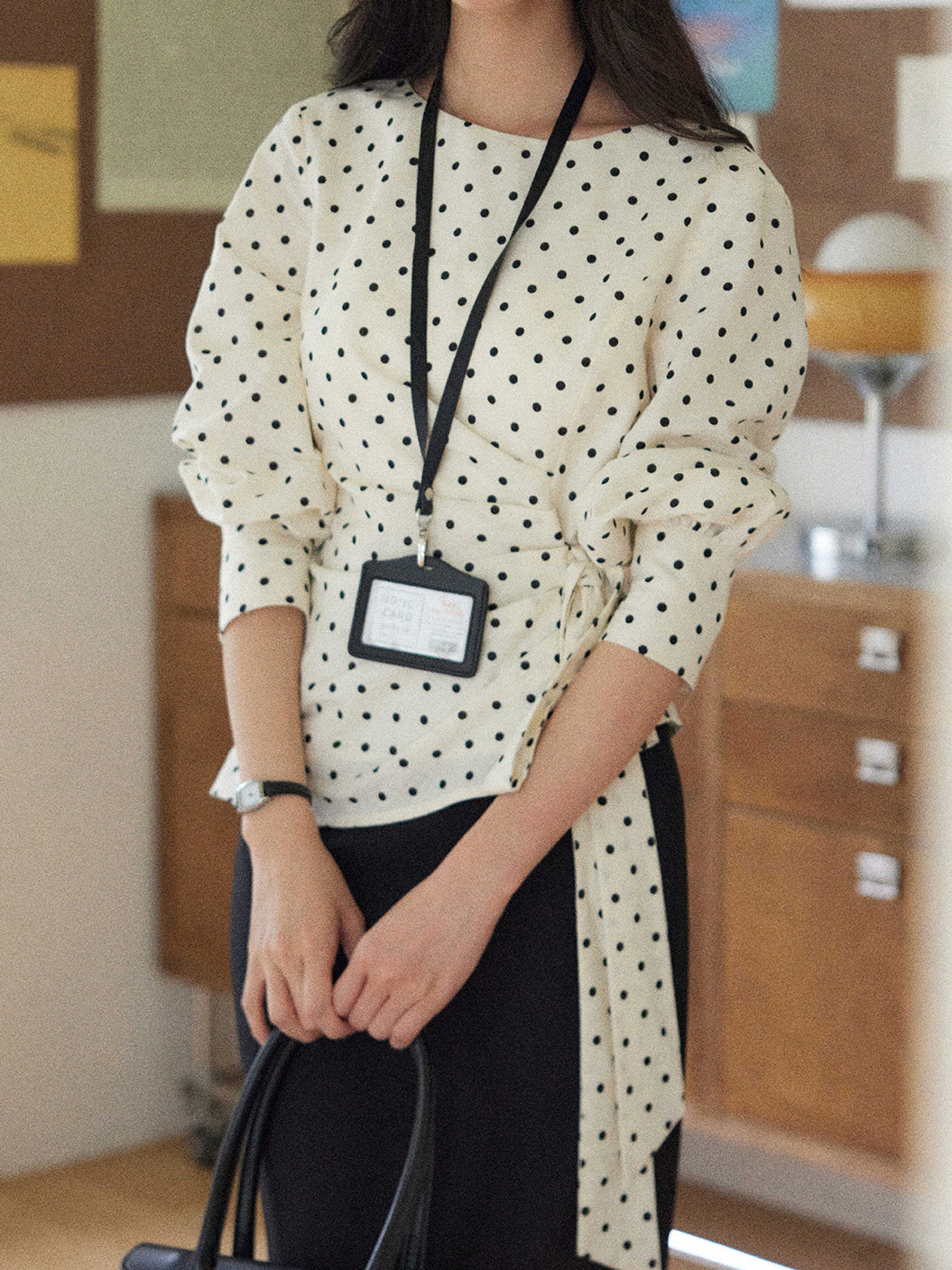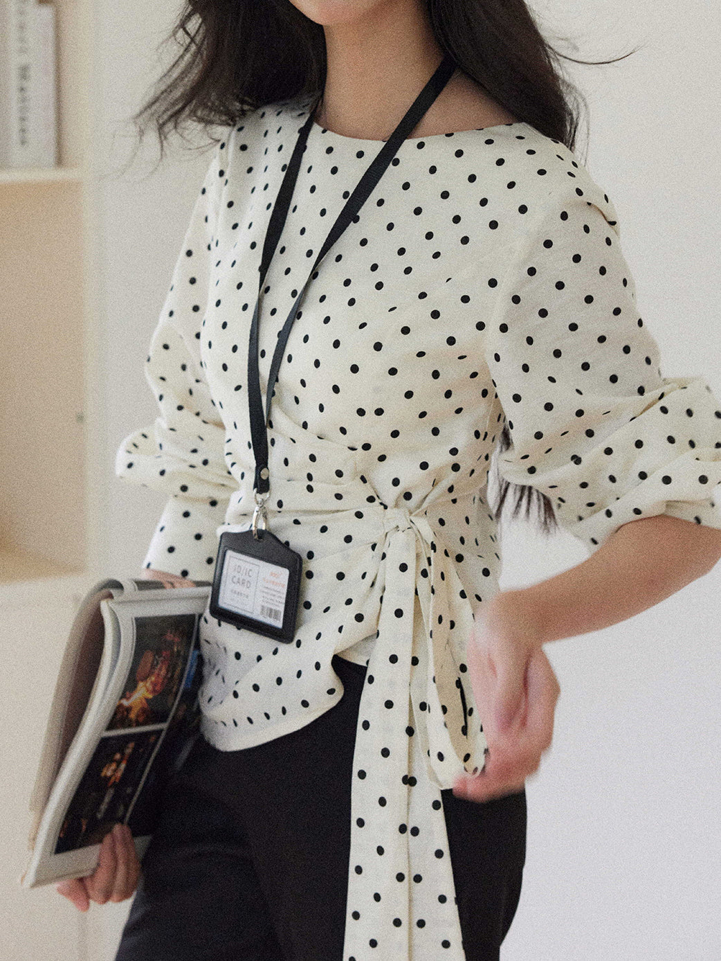 A dotted blouse with a trendy side ribbon ties for easy styling.