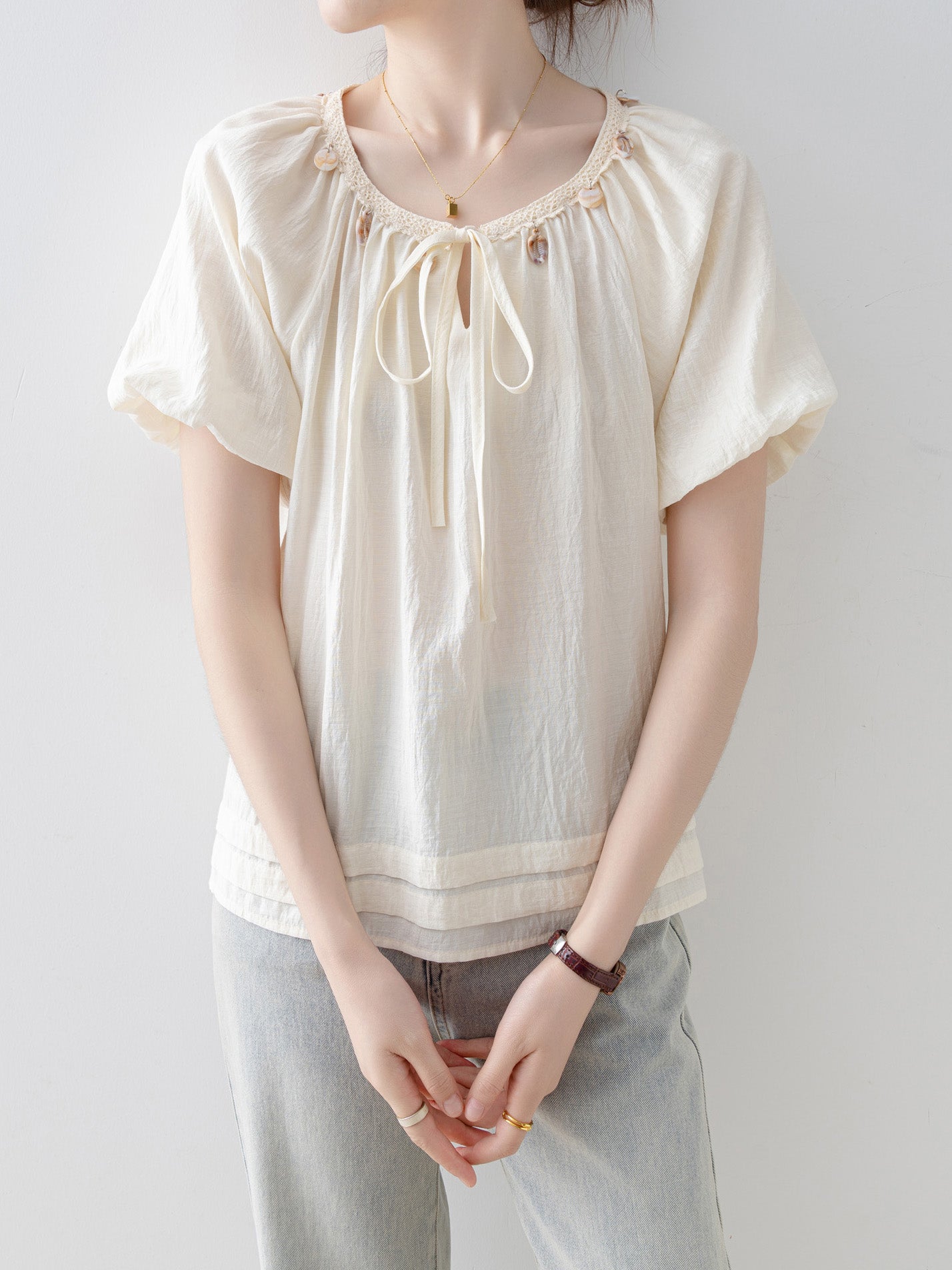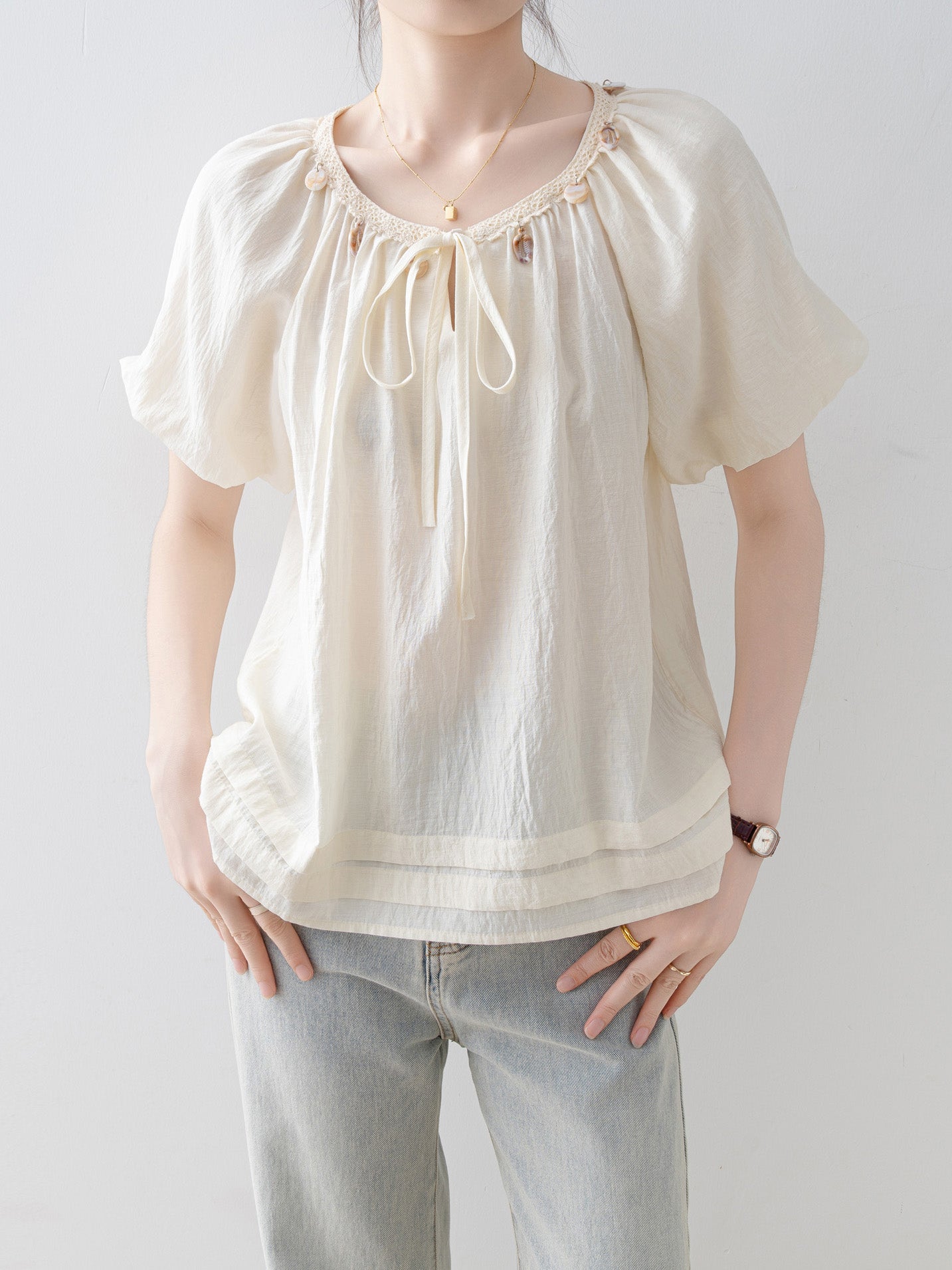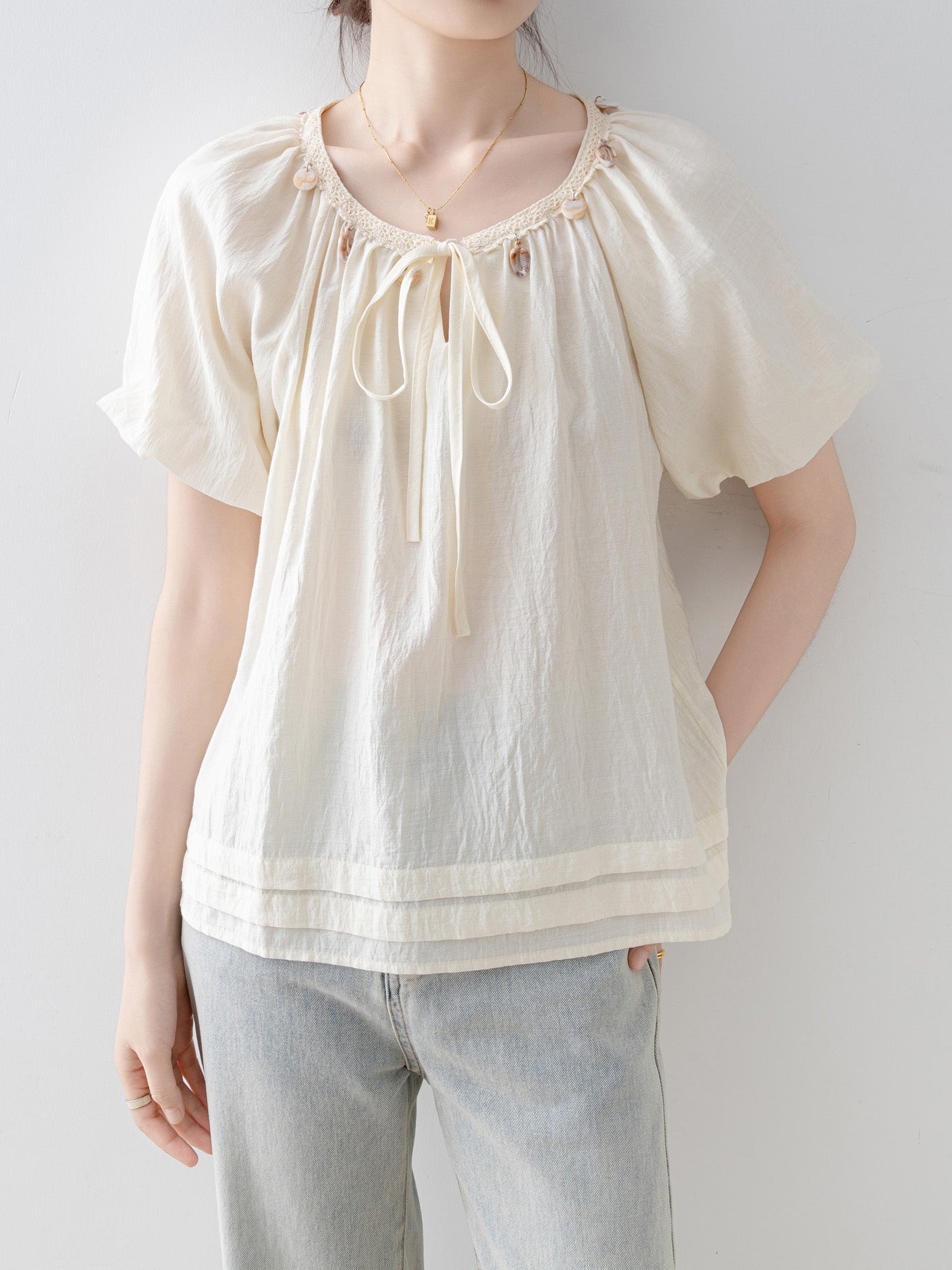 Shell bead ribbon smock blouse