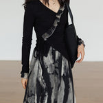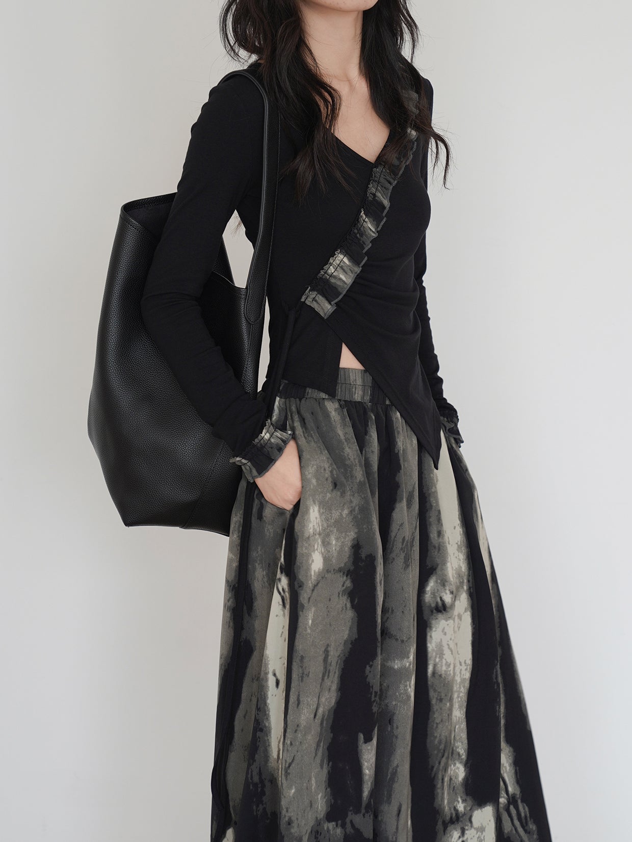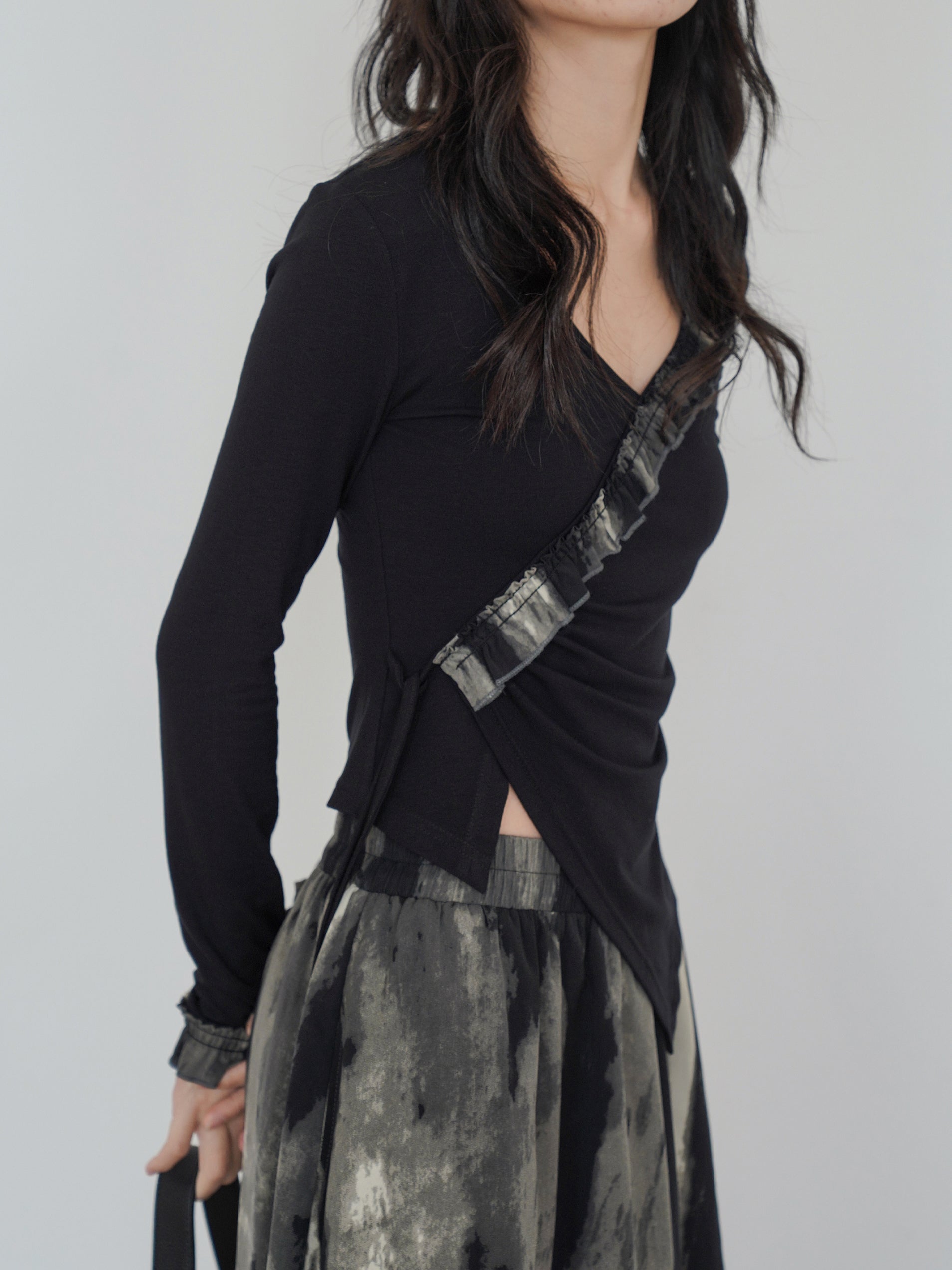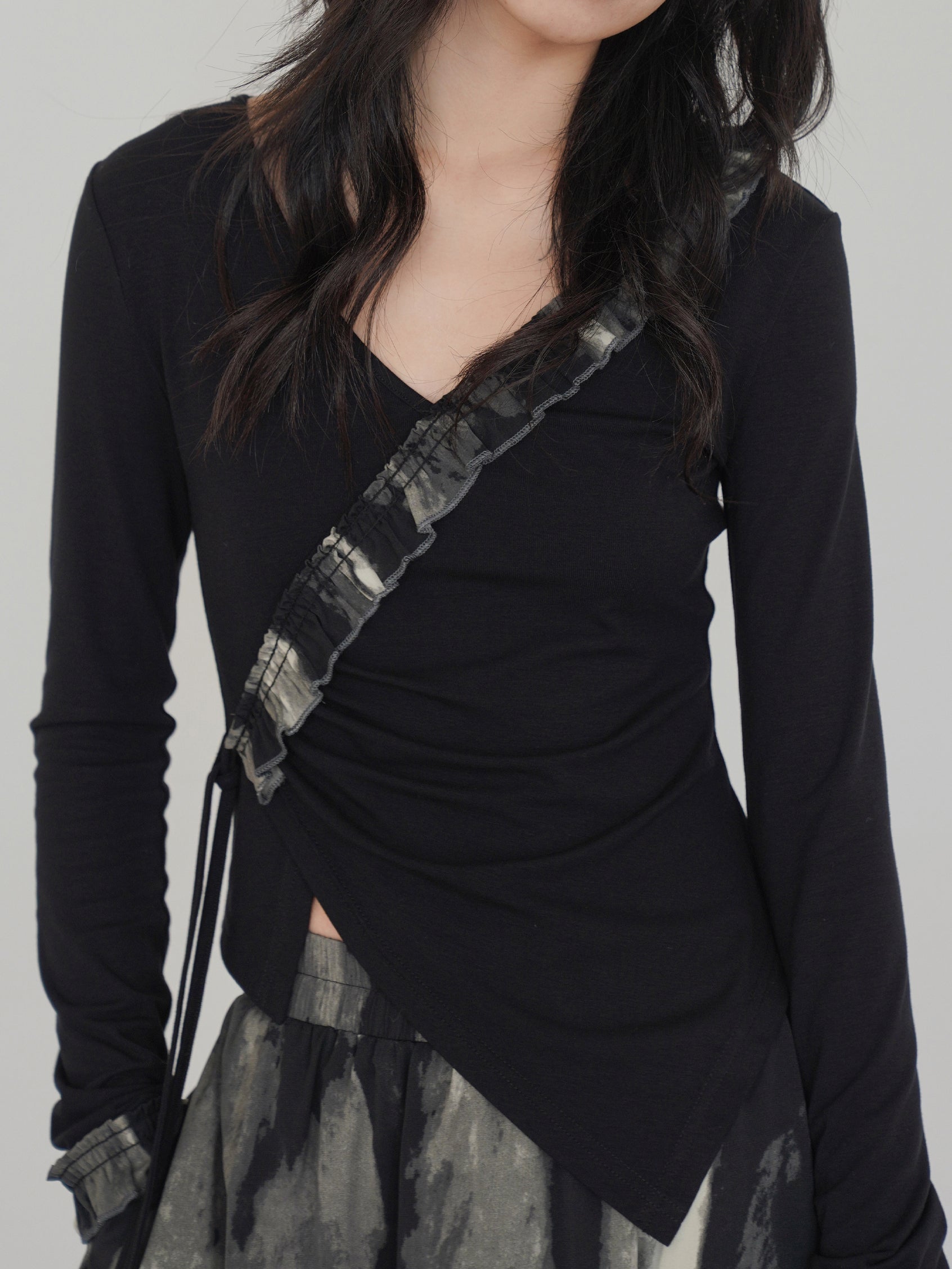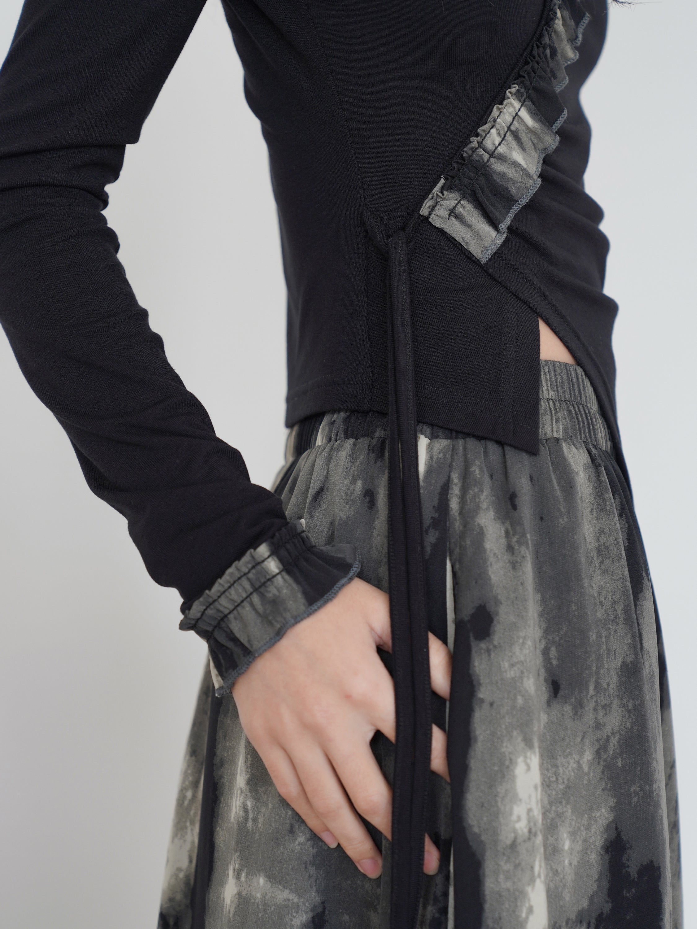 A cut-and-sew top with striking asymmetrical tie-dye ruffles.