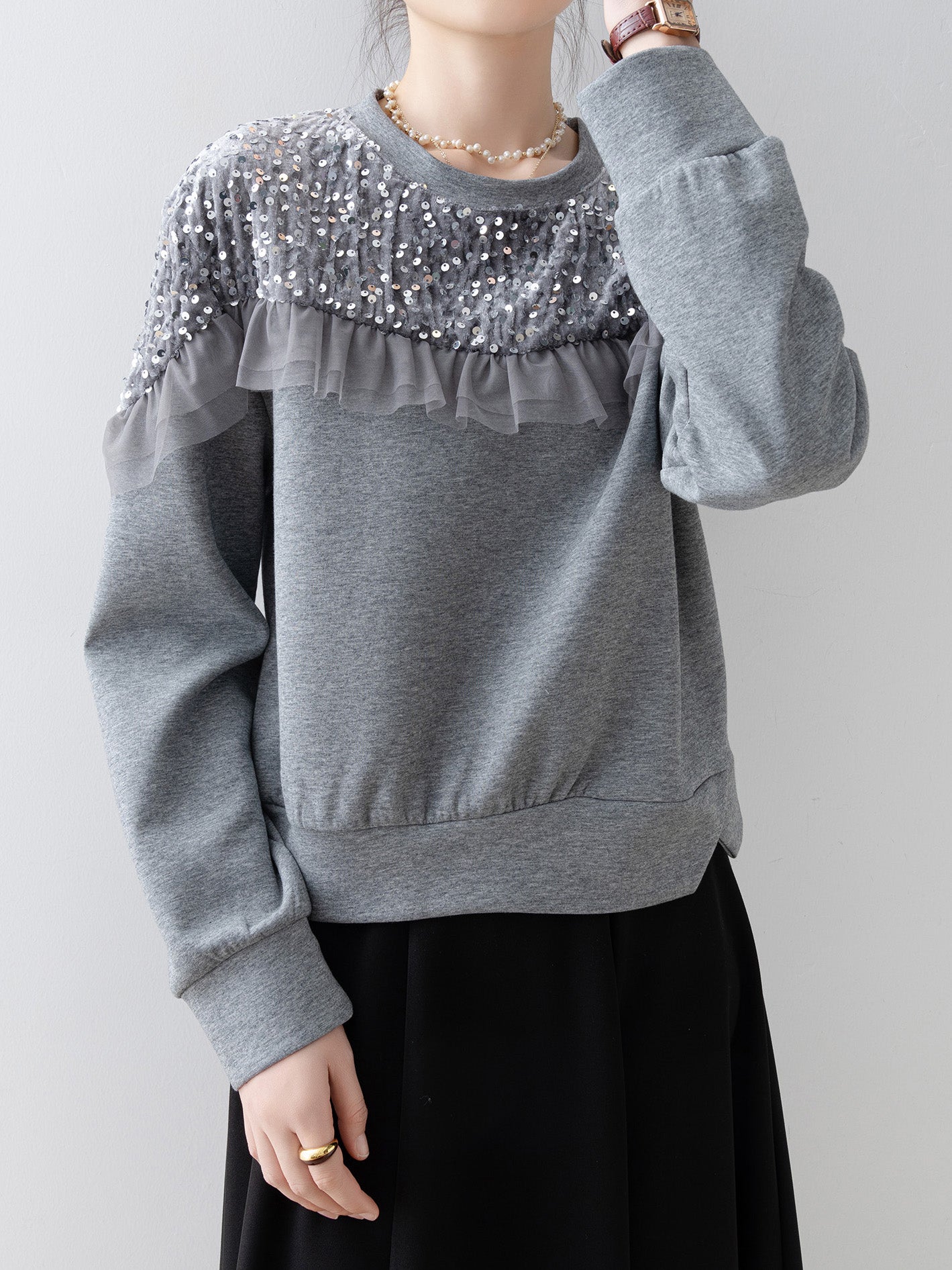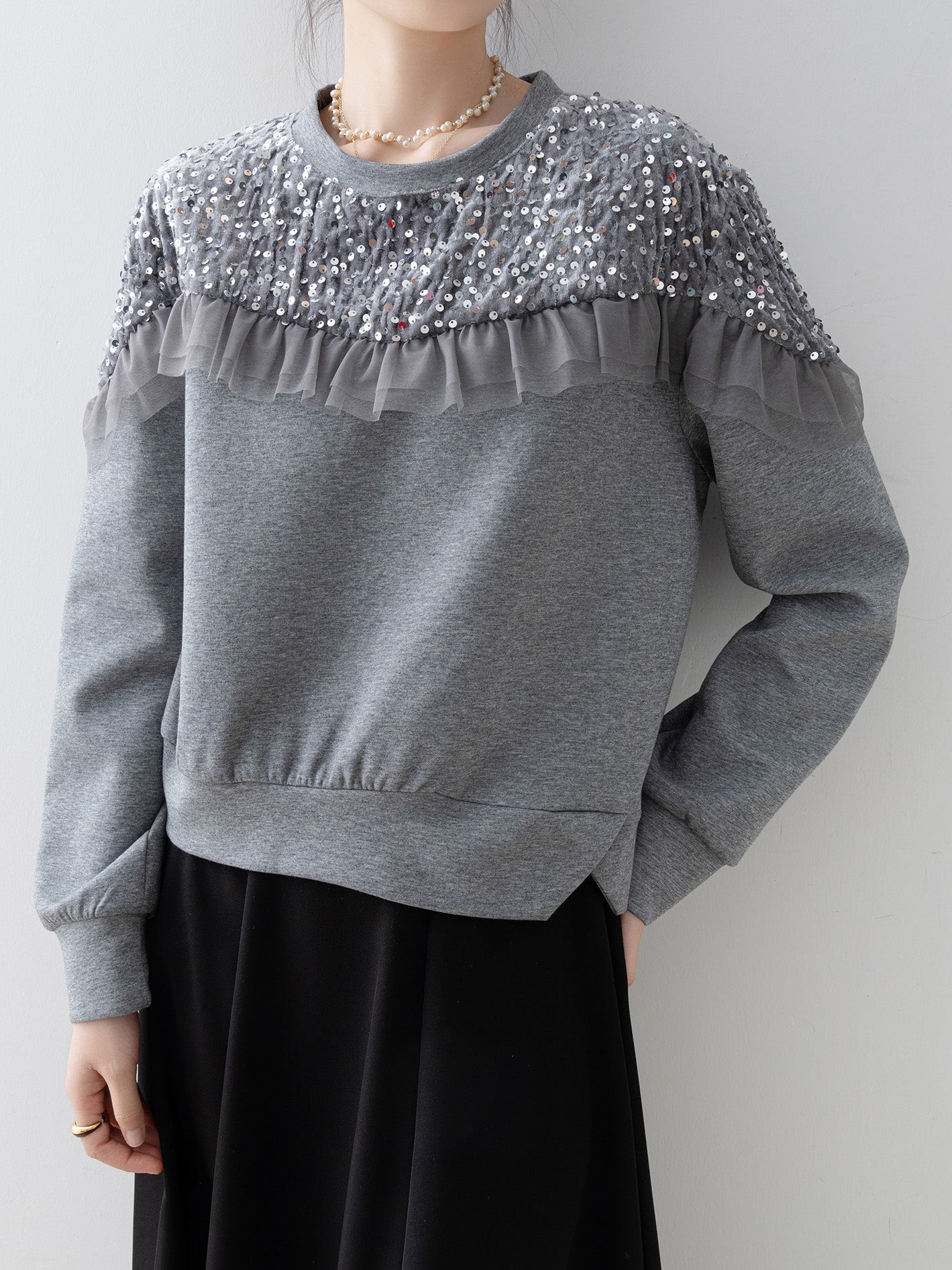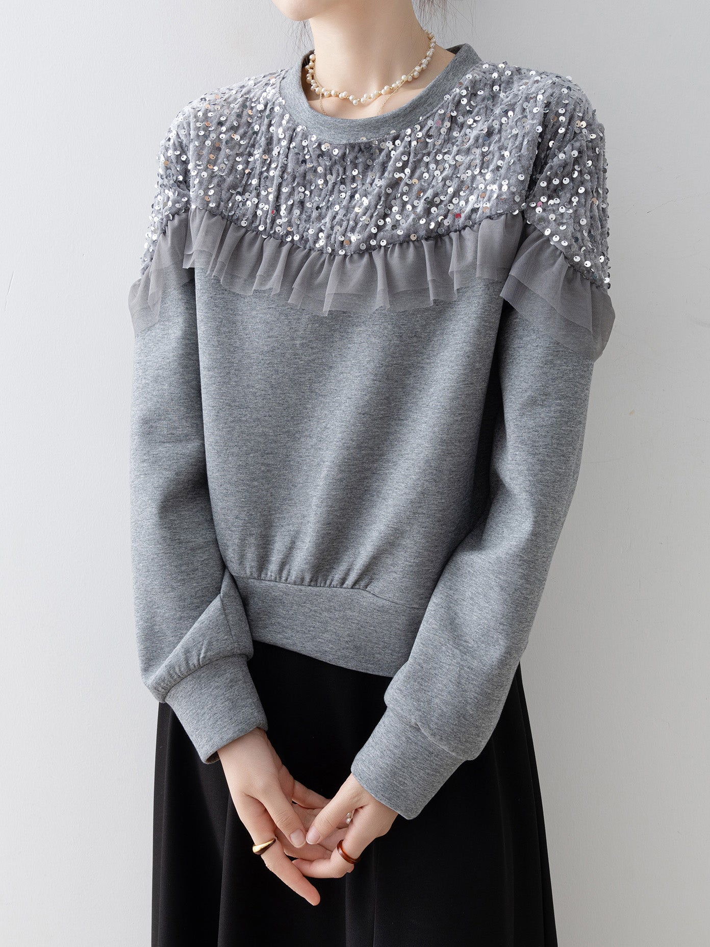 This sweatshirt is decorated with sparkling sequins and cute ruffles, making it a trendy look.