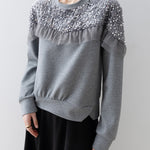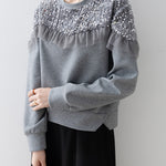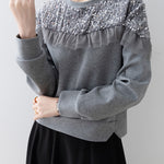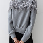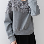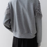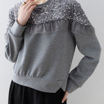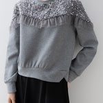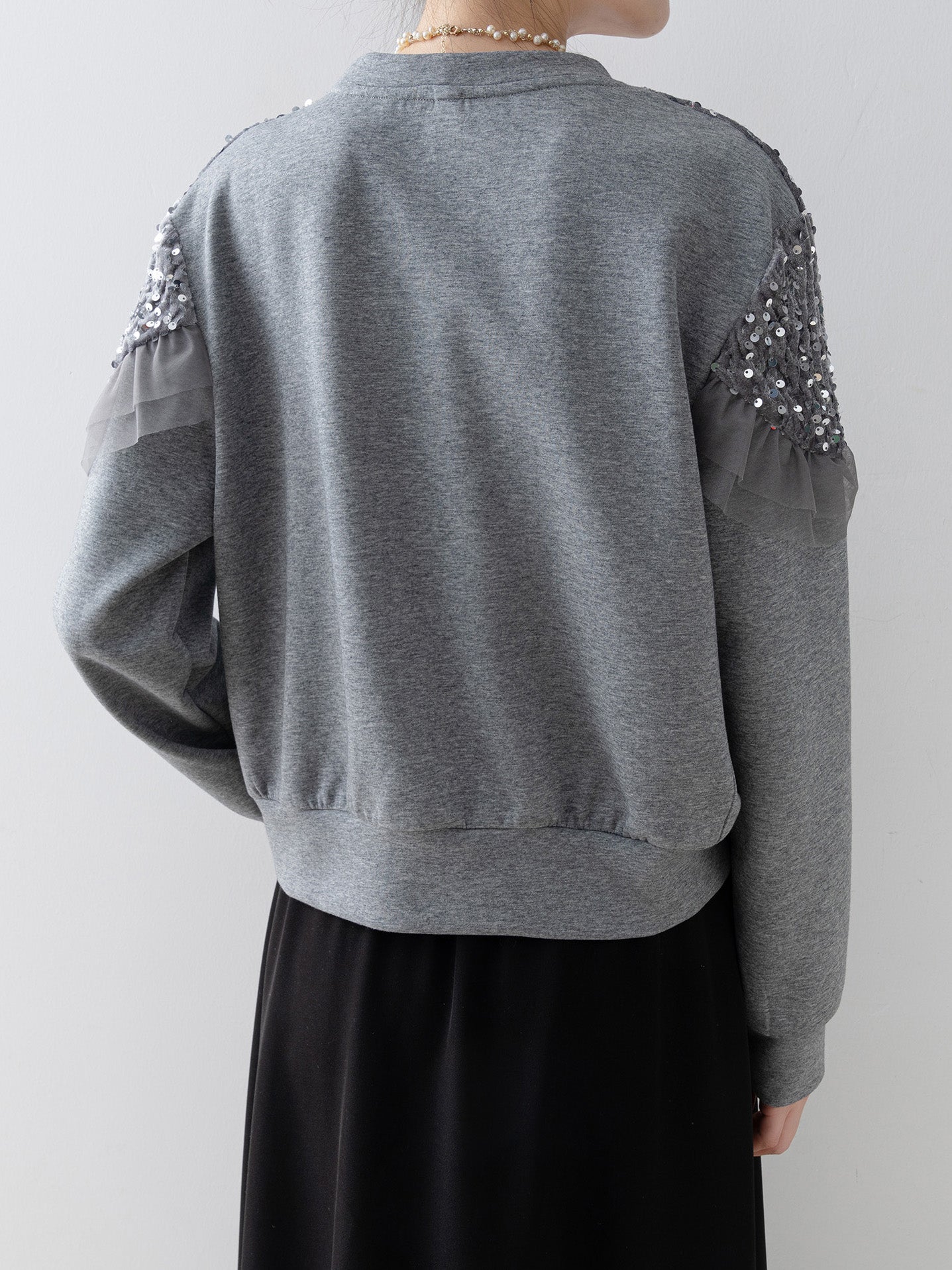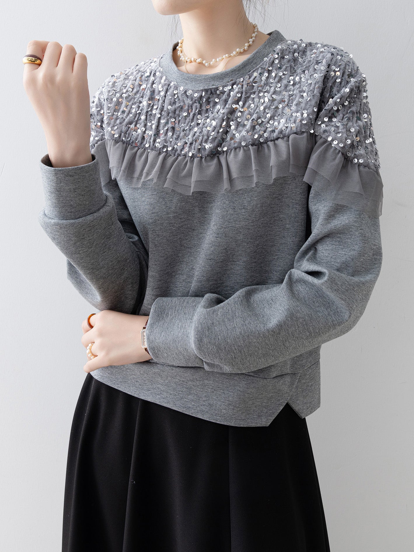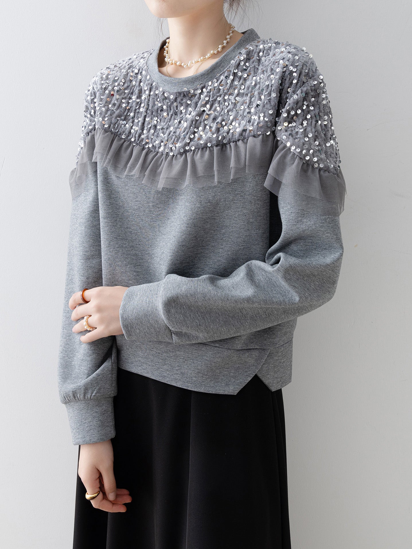 This sweatshirt is decorated with sparkling sequins and cute ruffles, making it a trendy look.
