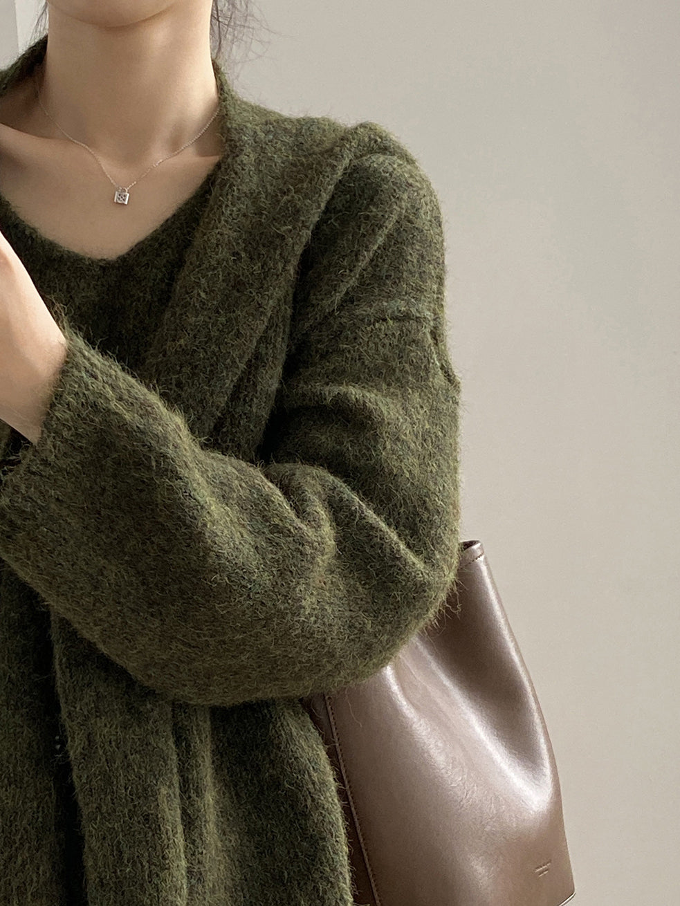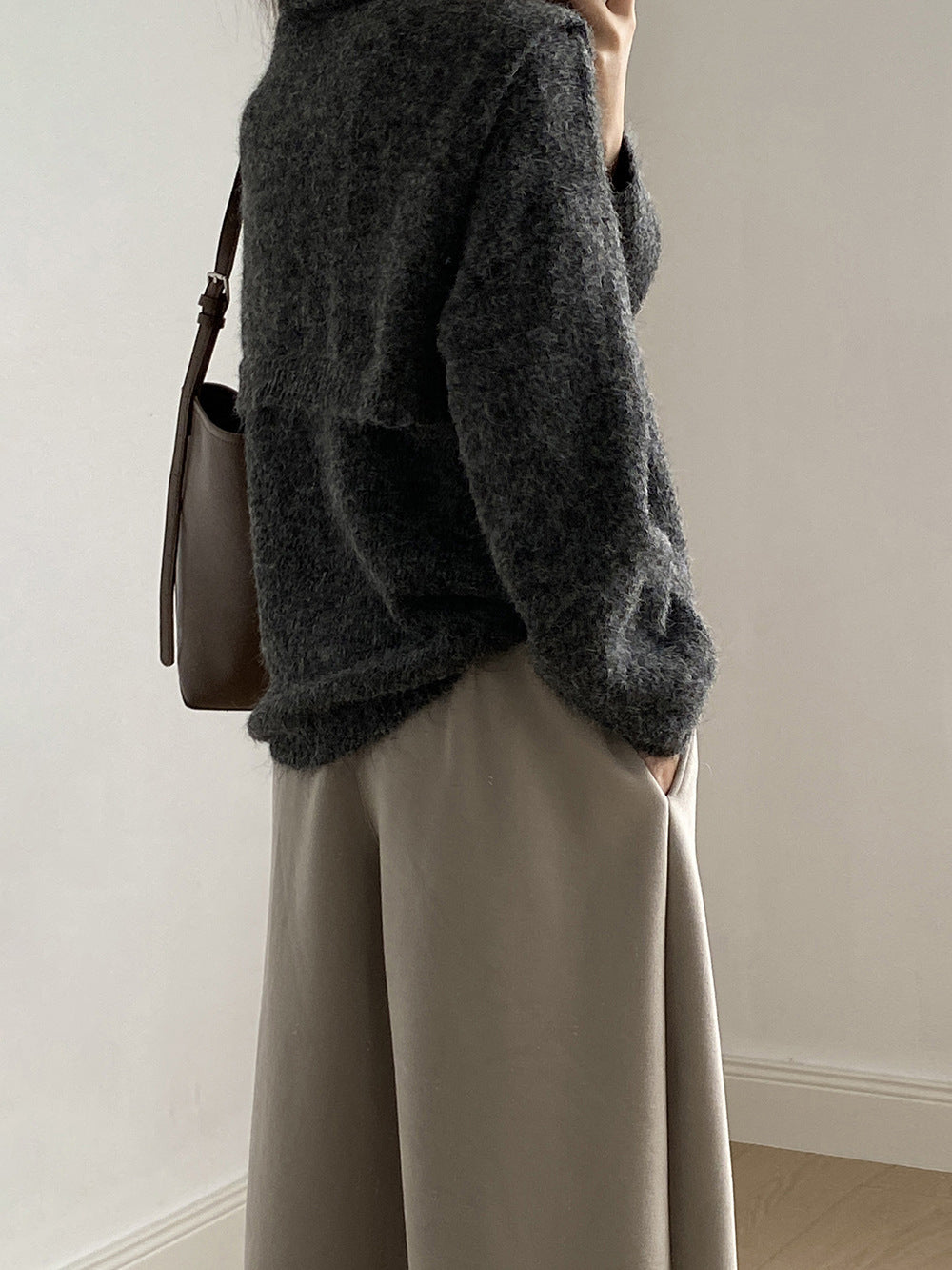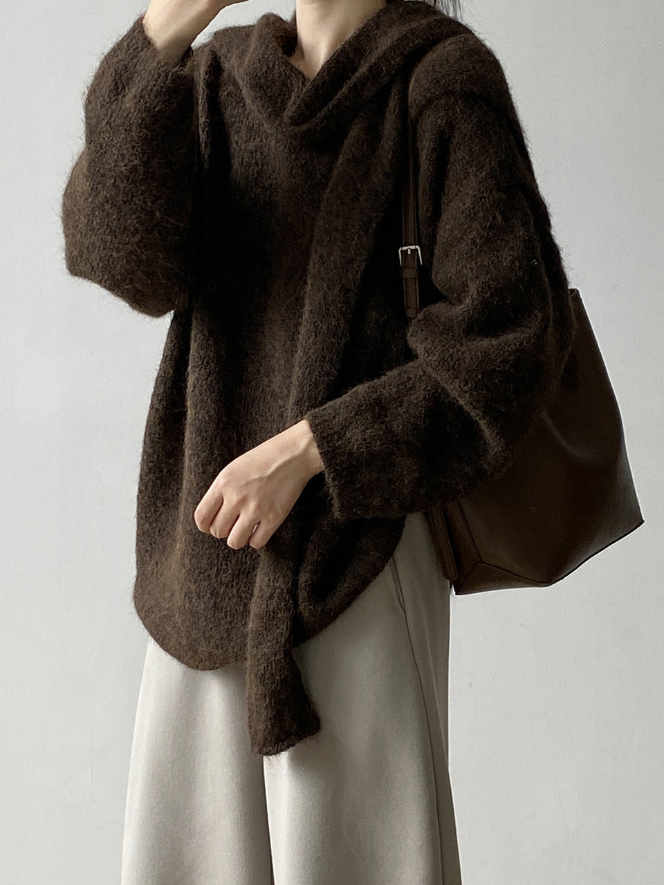 Wearing it over your shoulder creates a relaxed look and a slimming effect.