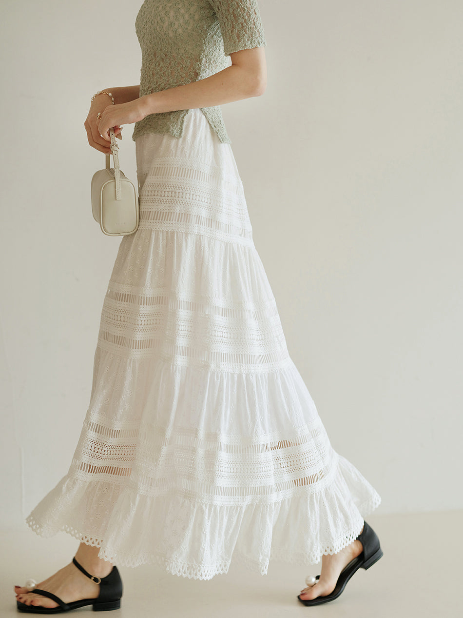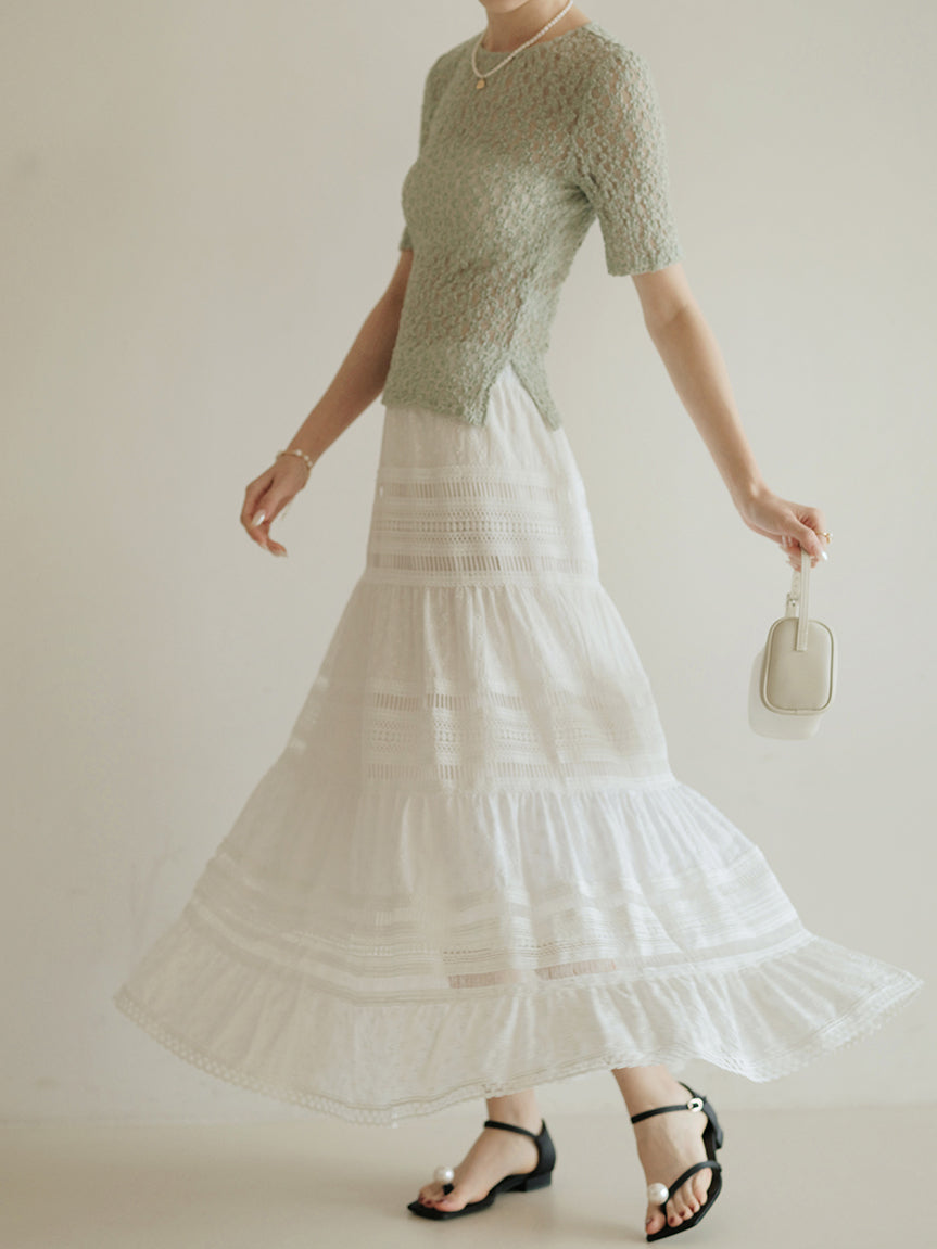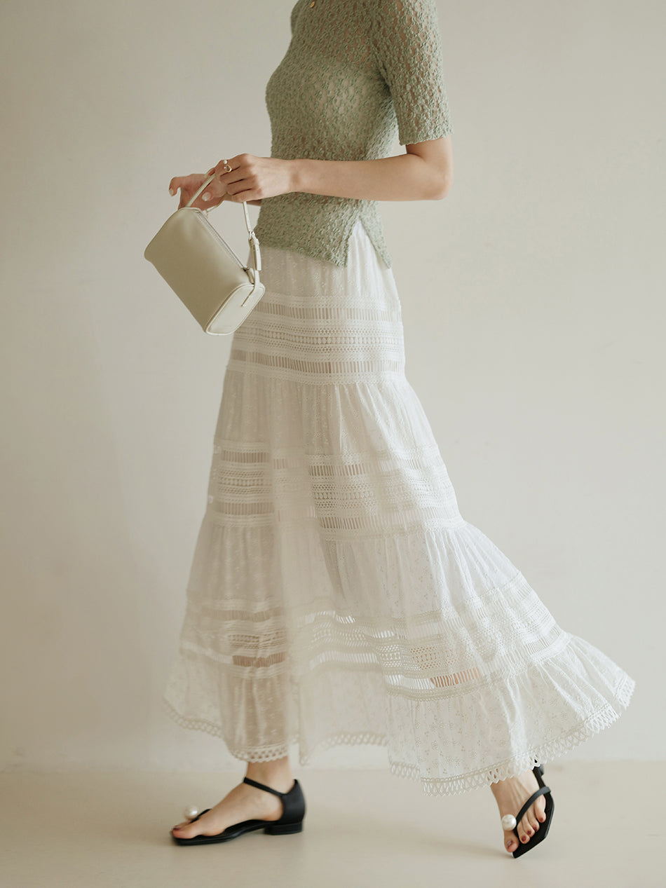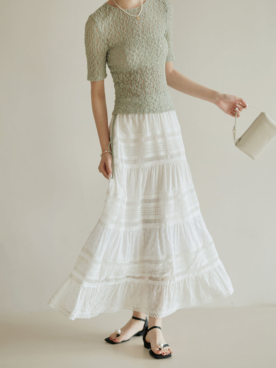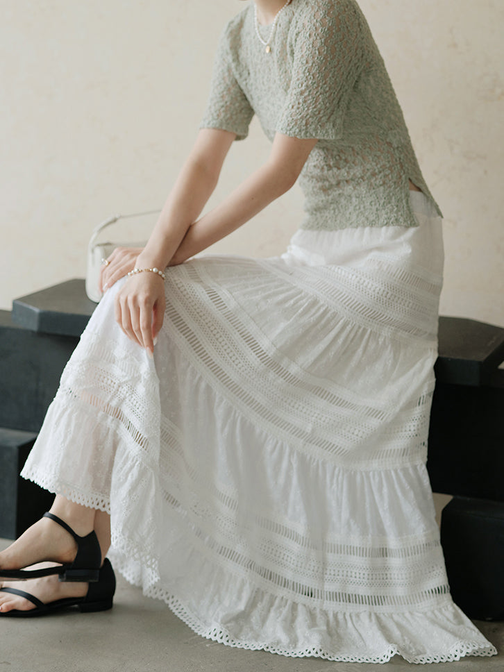 [A tiered skirt with lace cutwork for a gorgeous look】