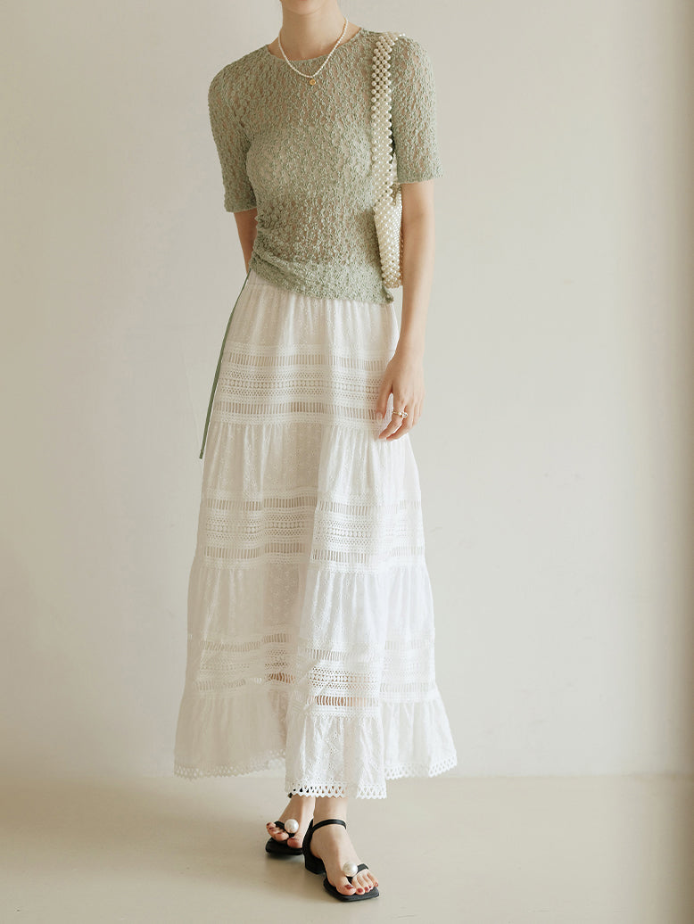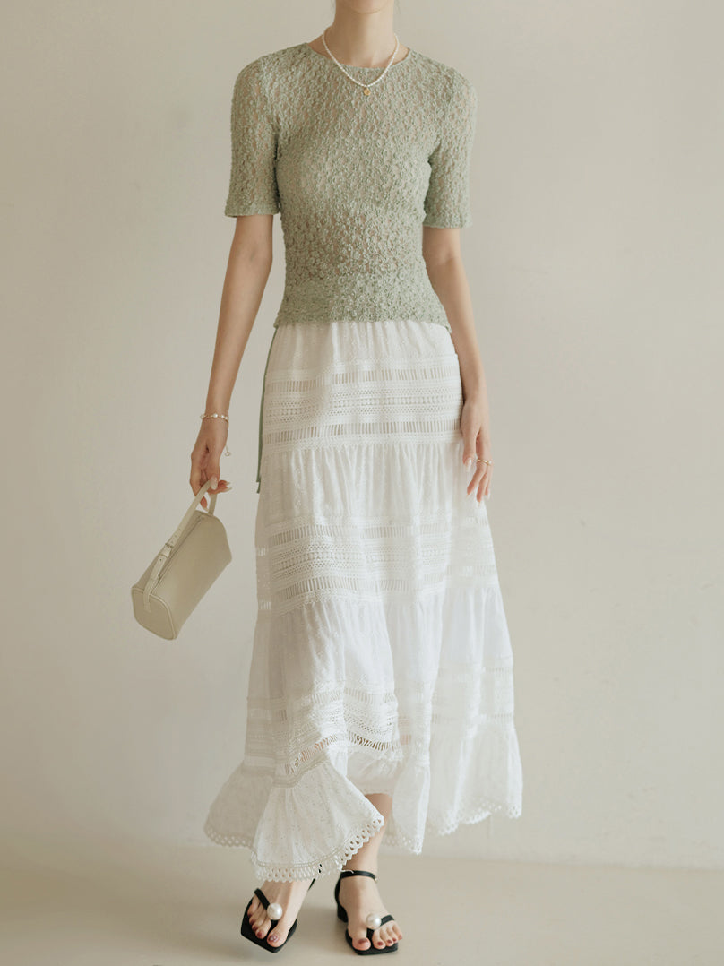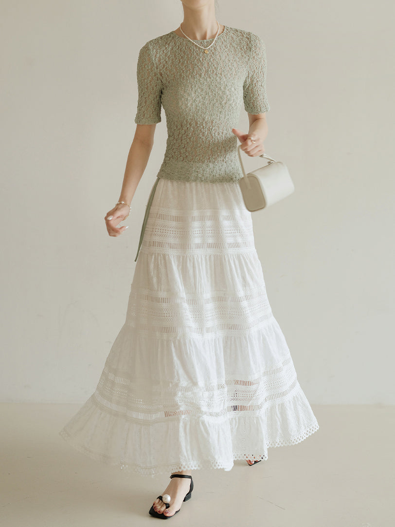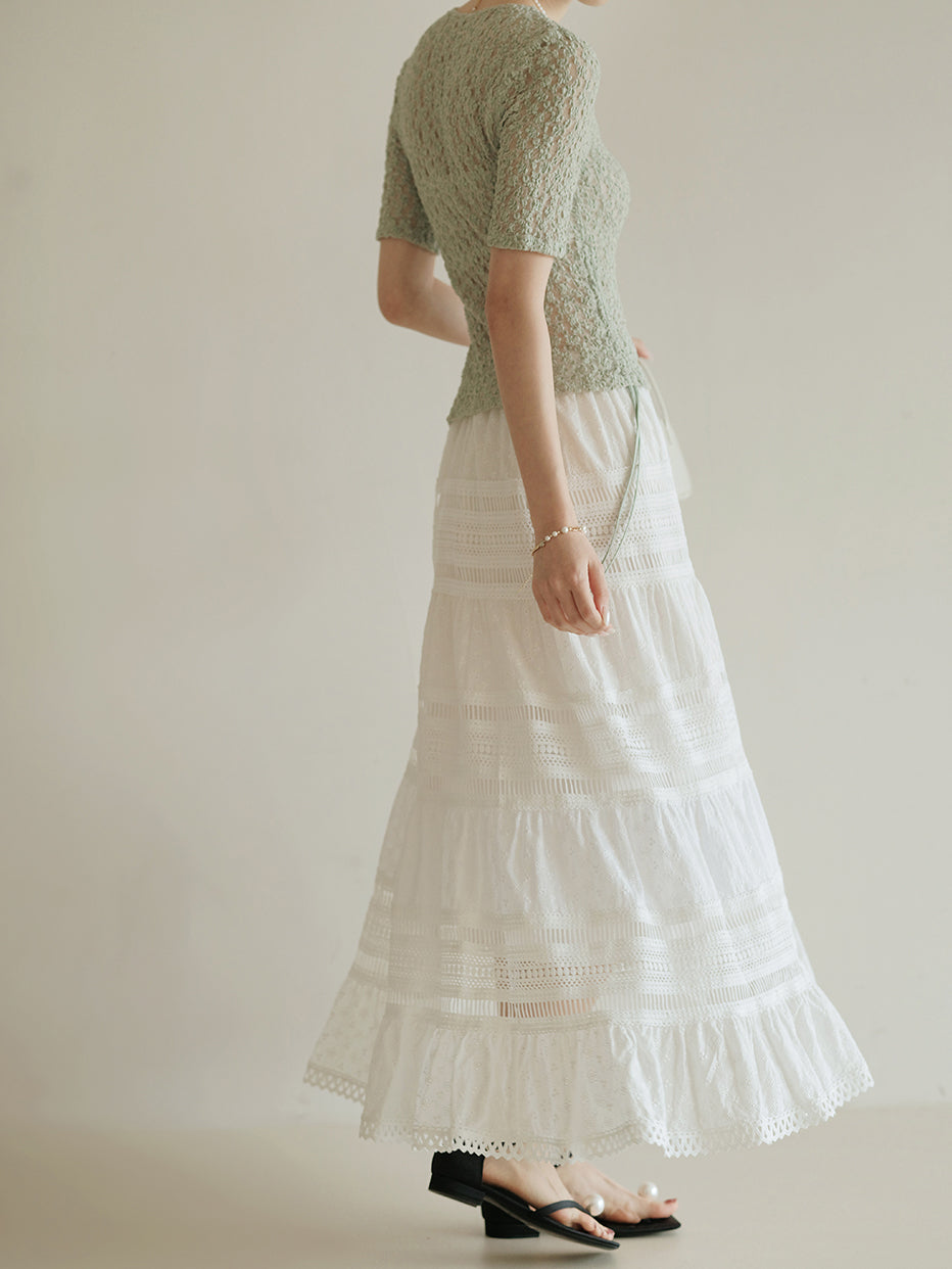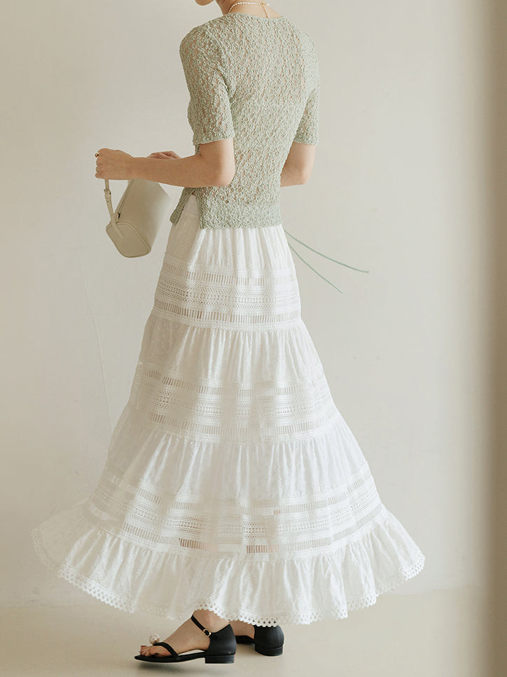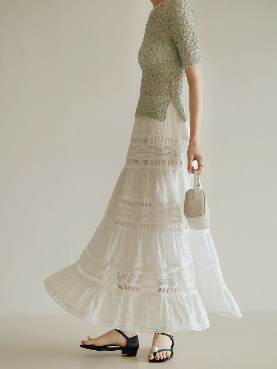 [A tiered skirt with lace cutwork for a gorgeous look】