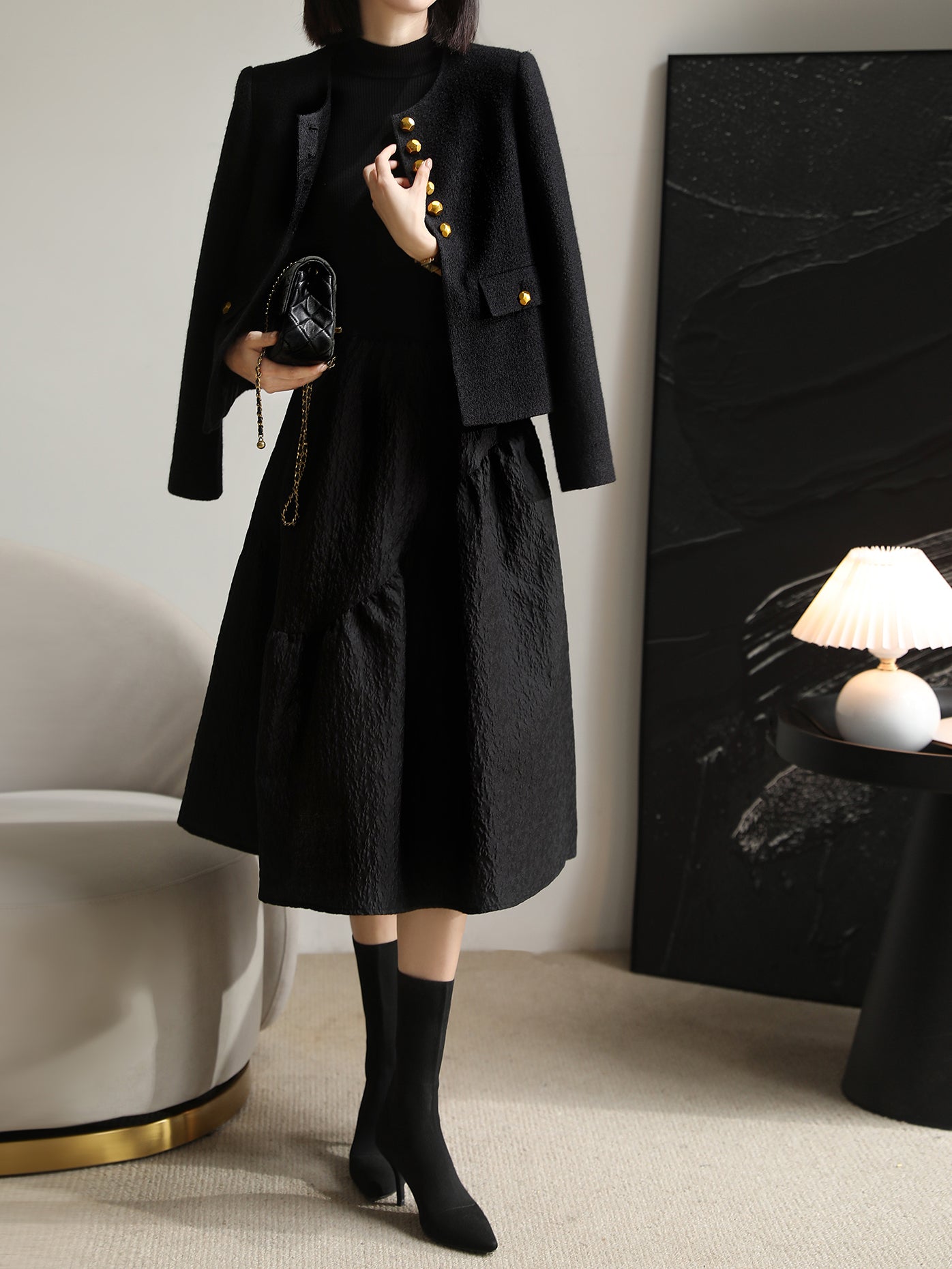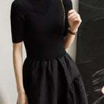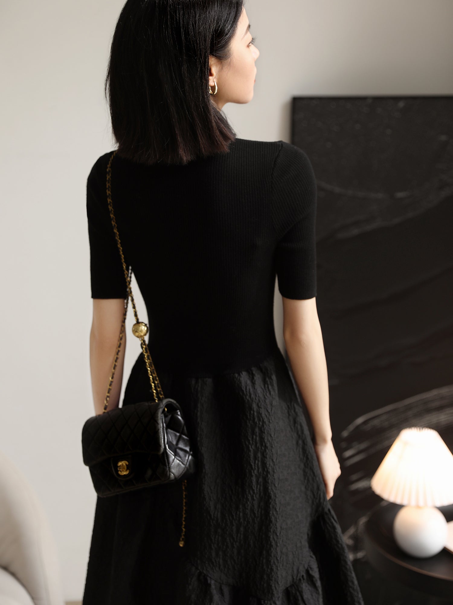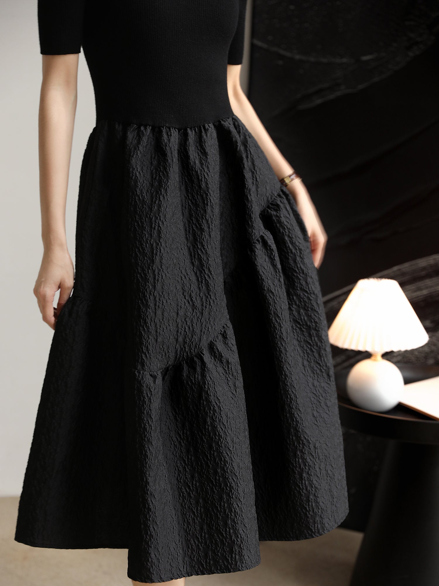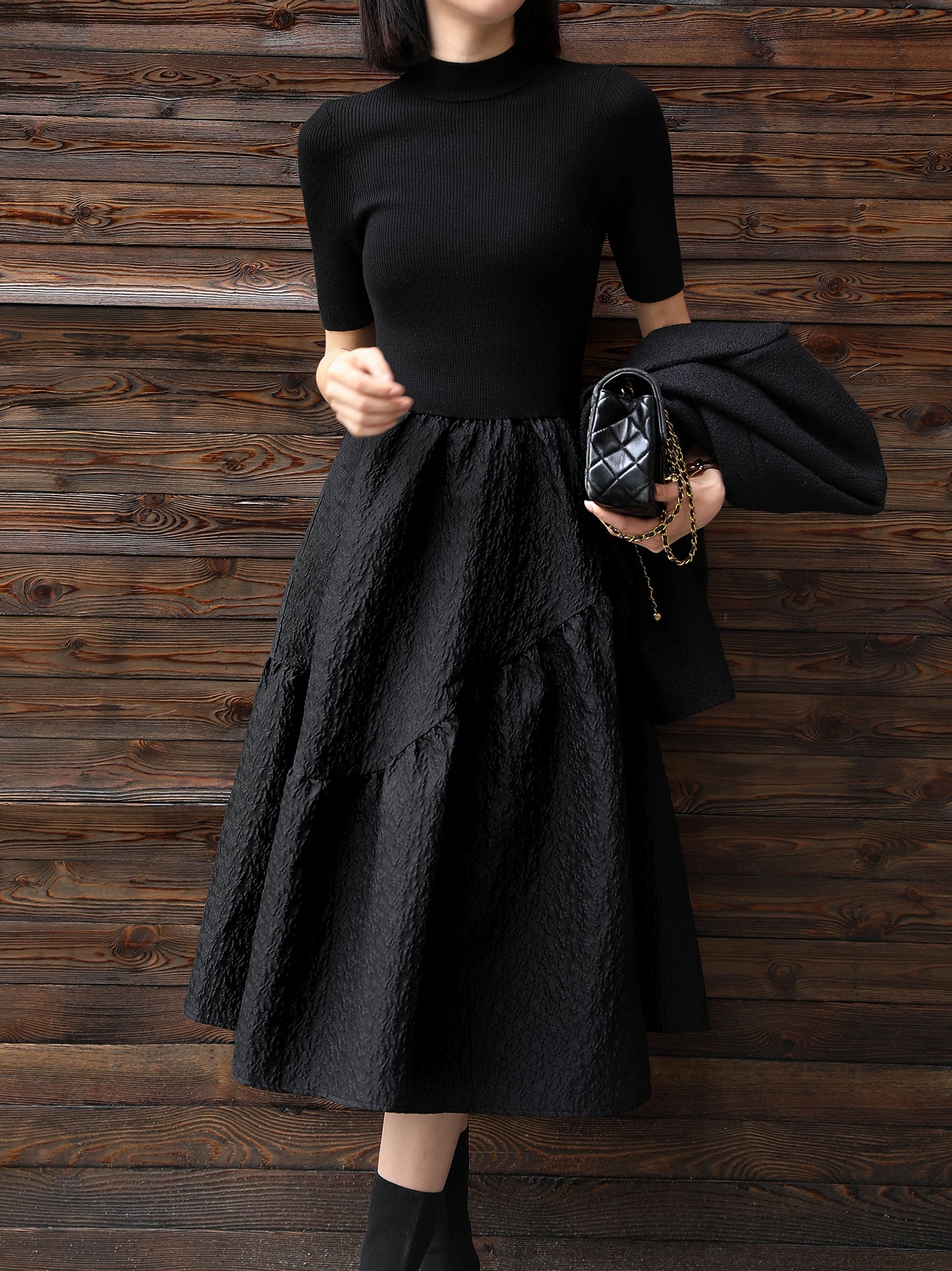 A knit dress that combines a neat cache-coeur knit with a jacquard skirt.