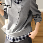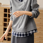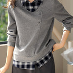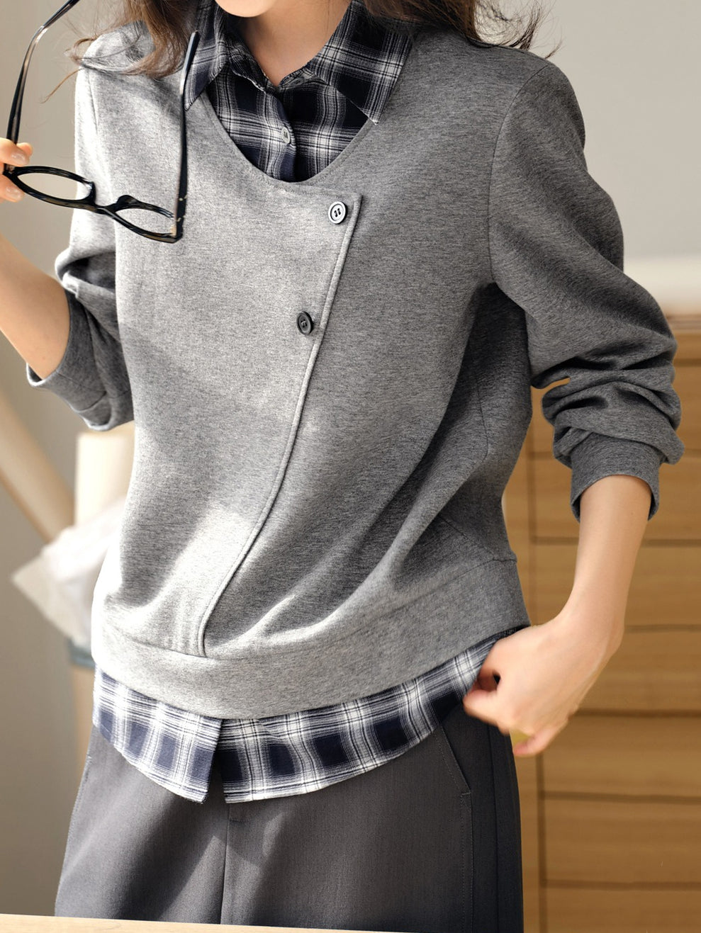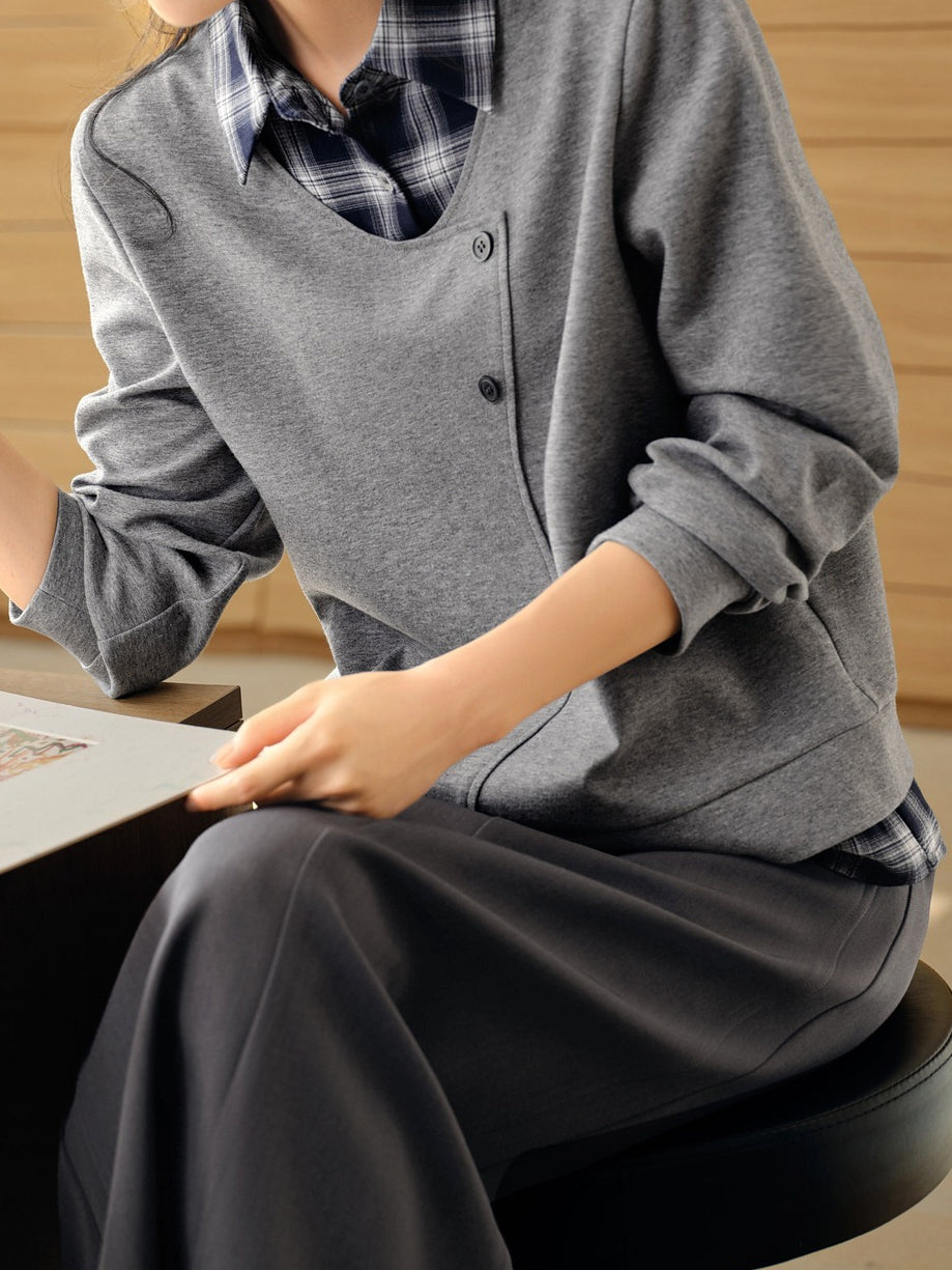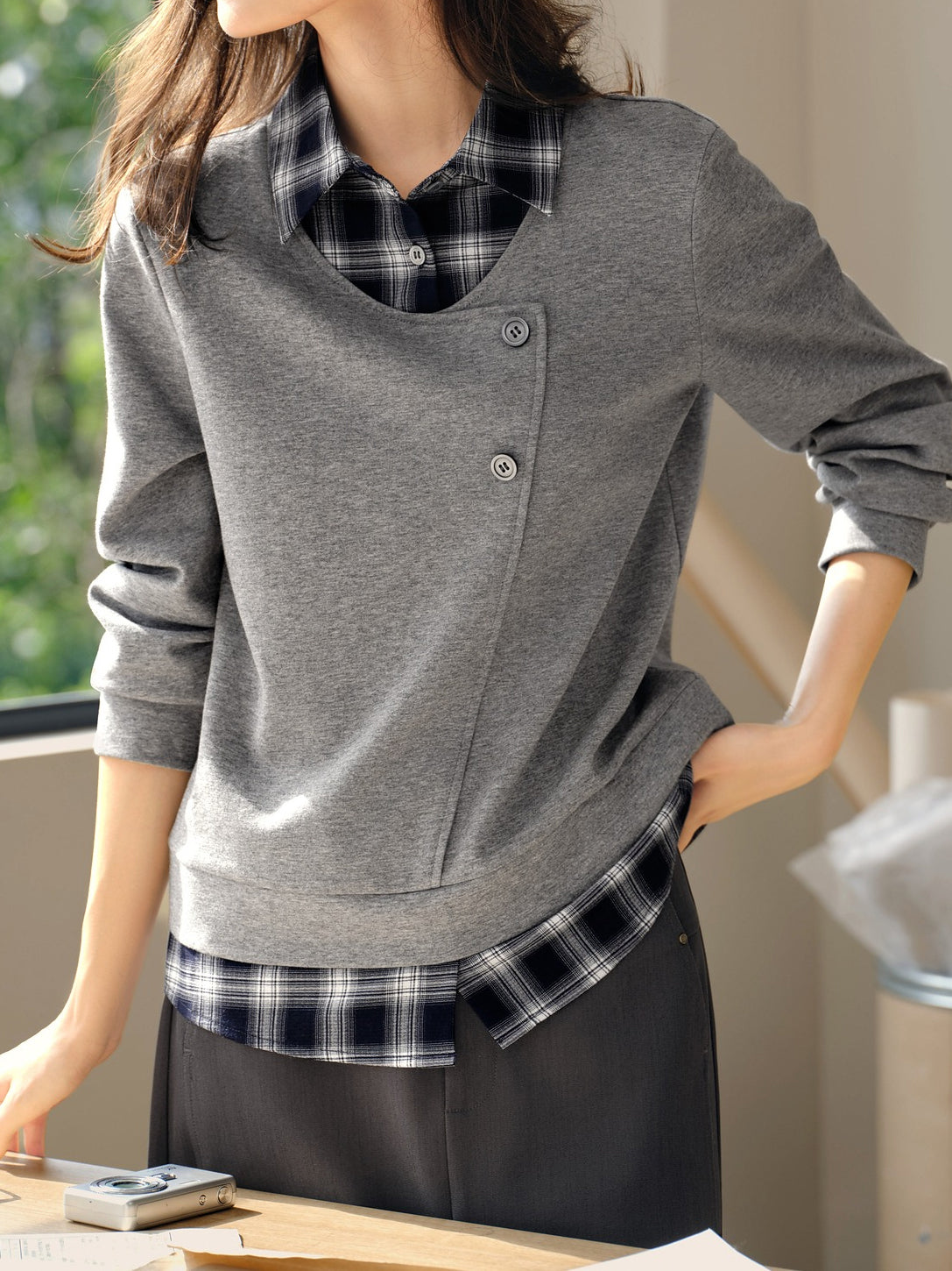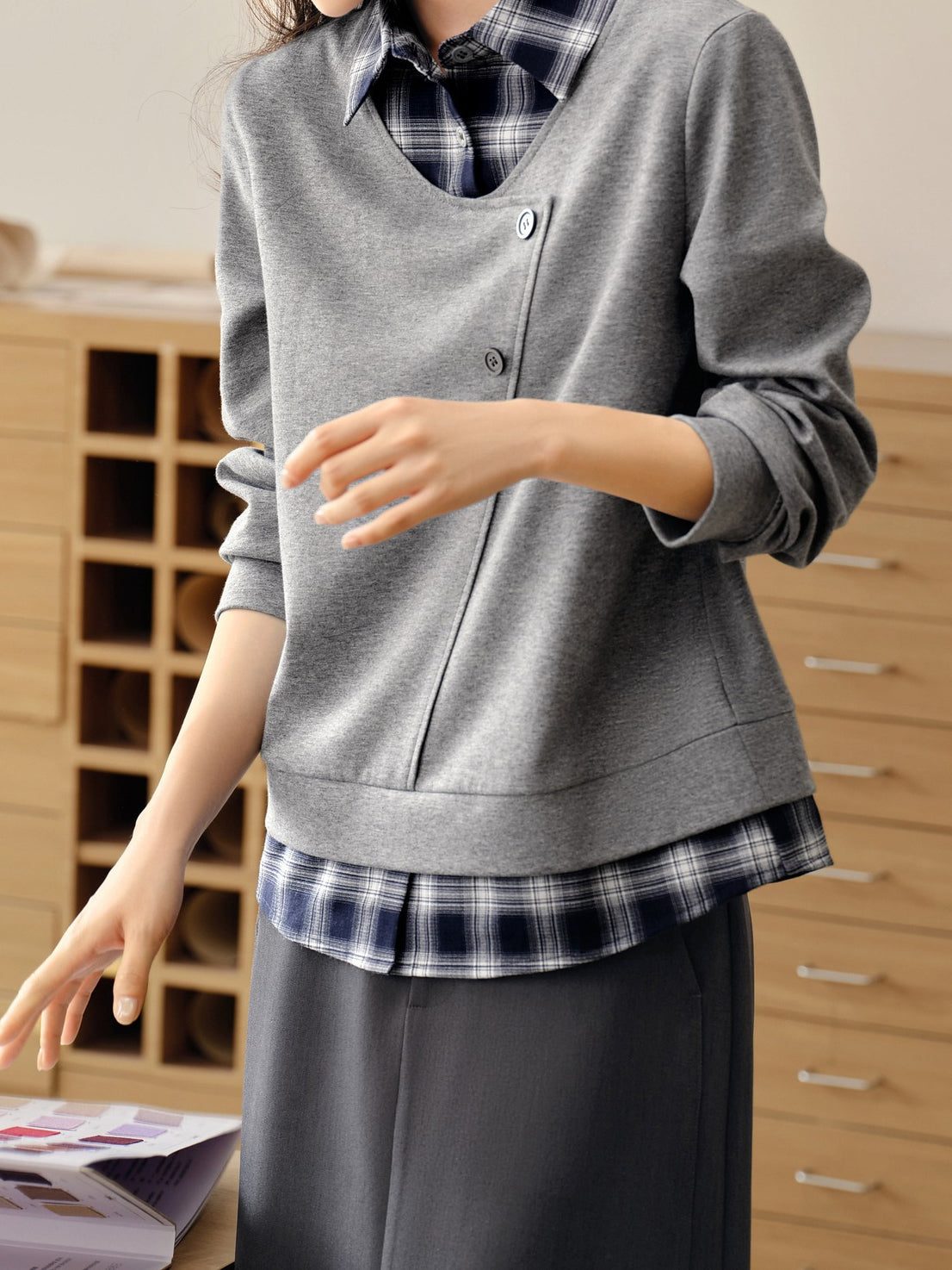 It has a layered design that looks like a checked shirt and sweatshirt layered on top of each other.