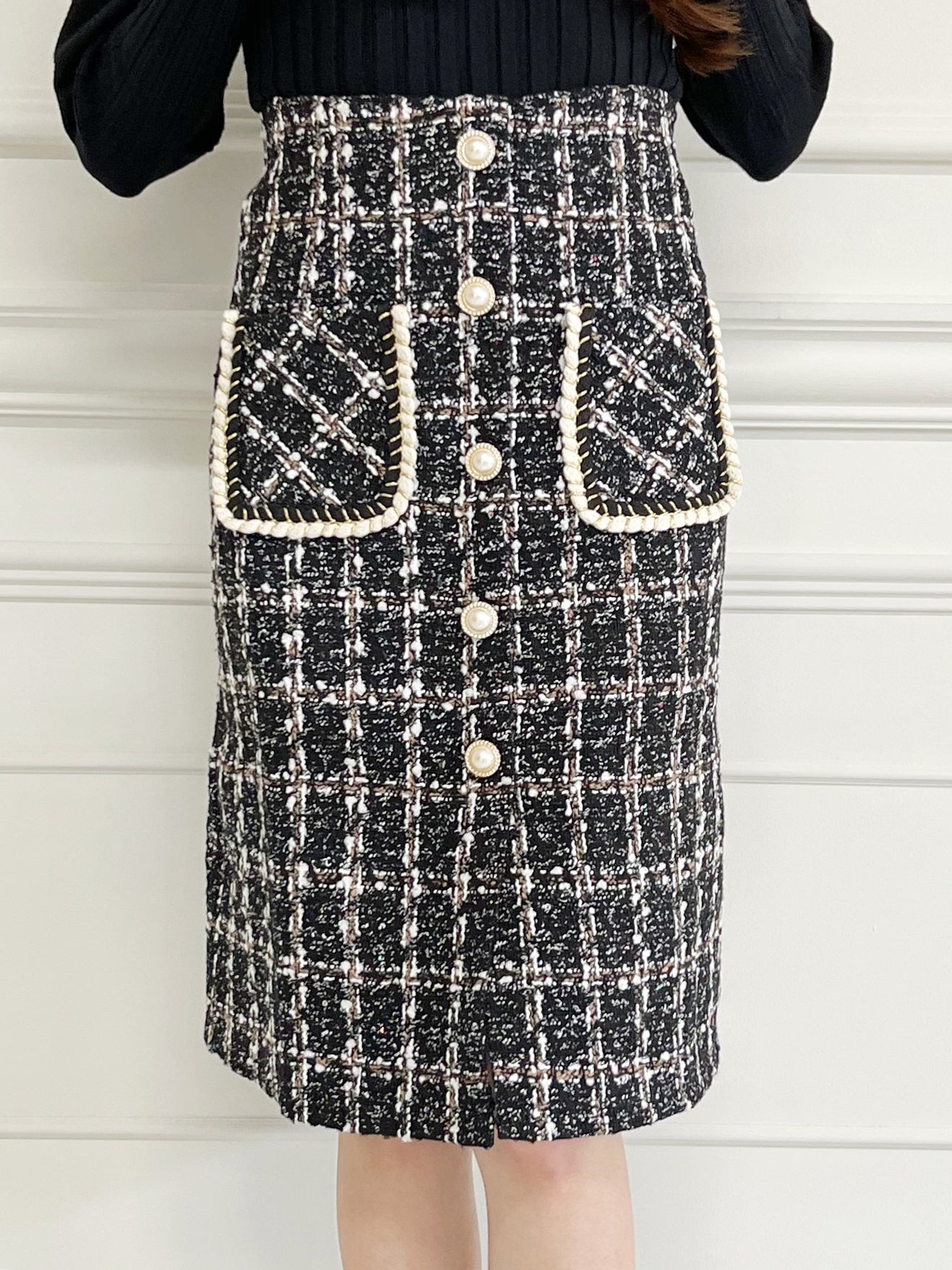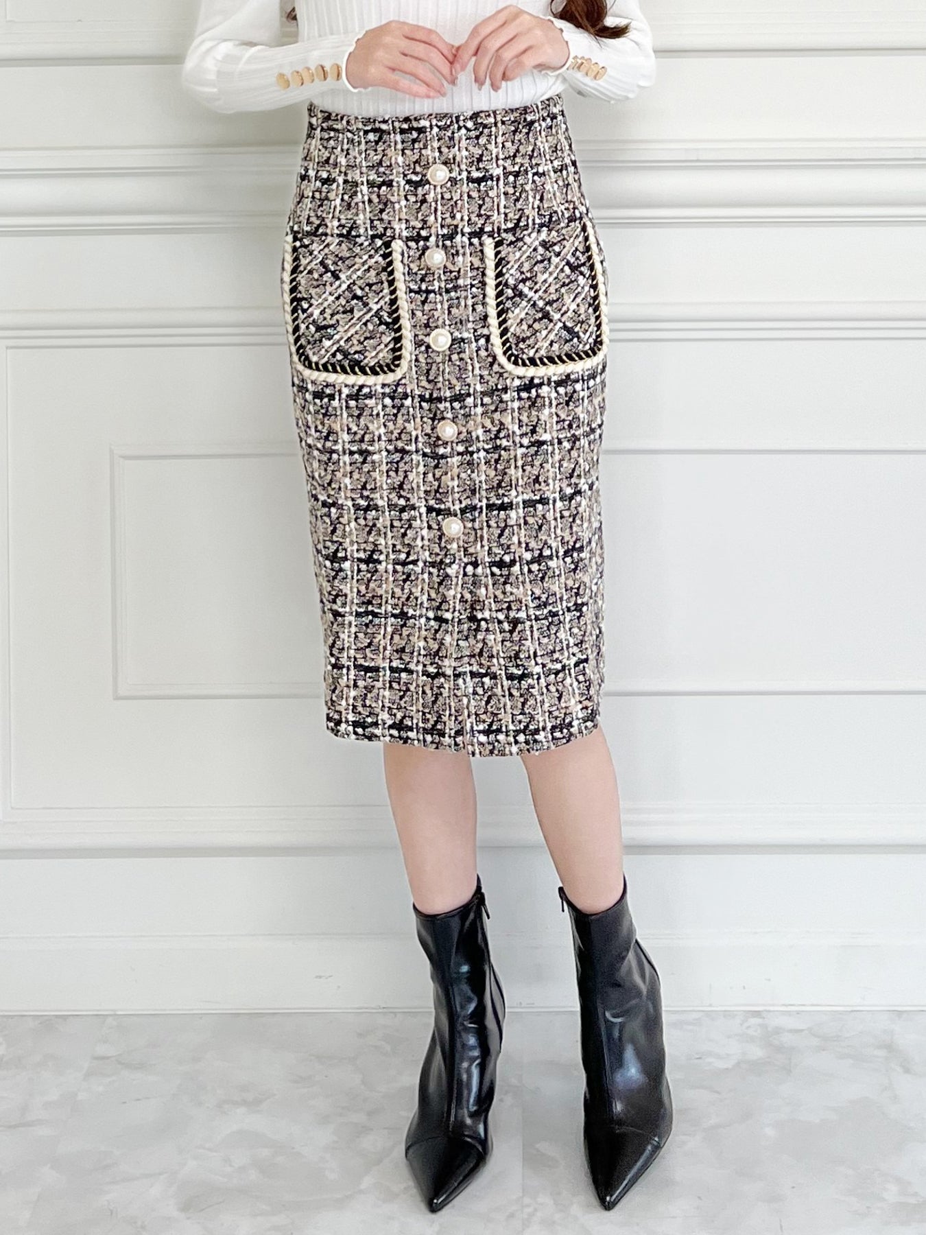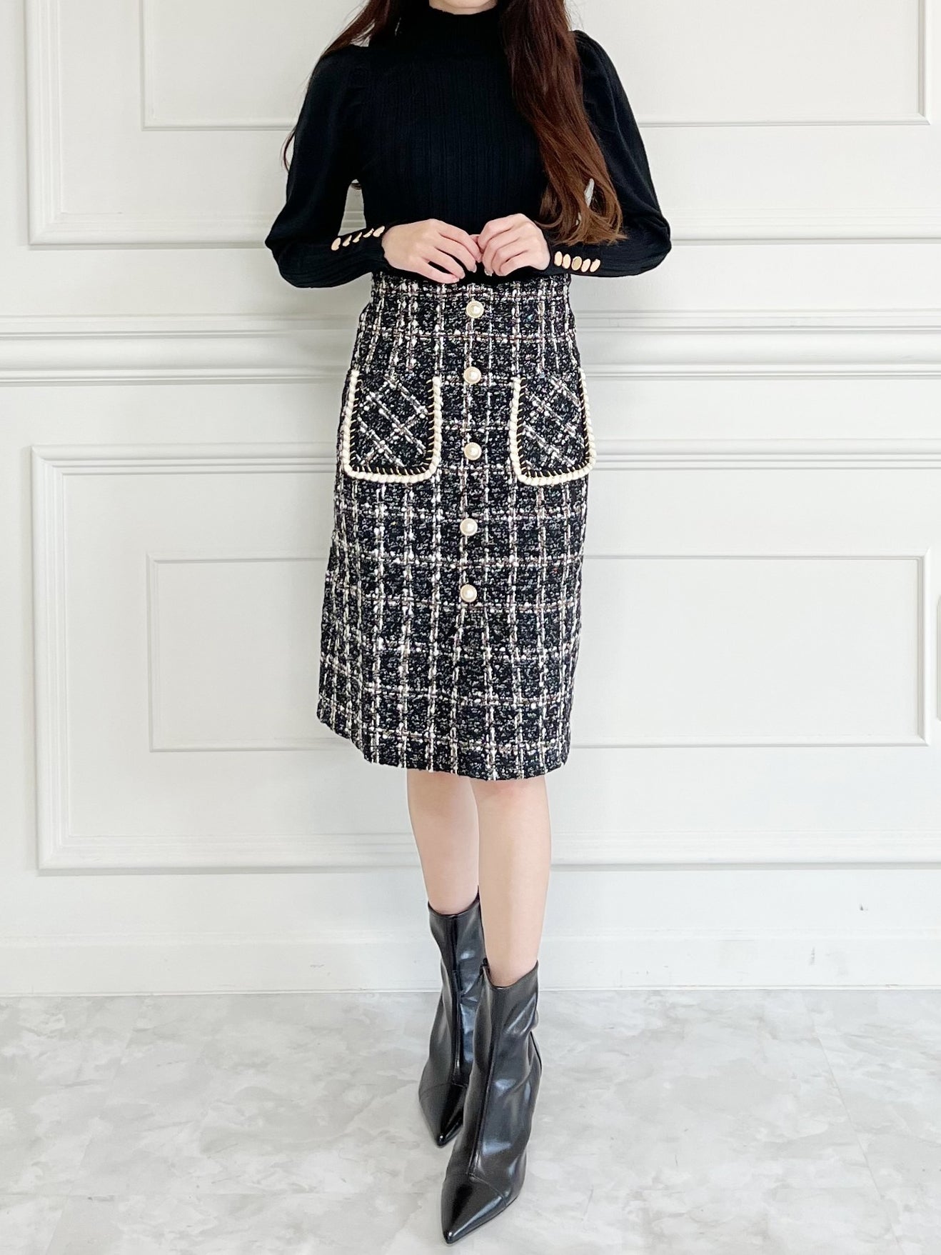 This front jewel button tweed check skirt is an elegant item that features a classic check pattern and tweed material. The jewel buttons on the front add a touch of glamour and create a feminine and elegant impression.