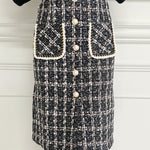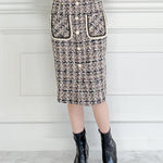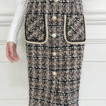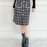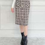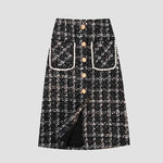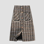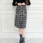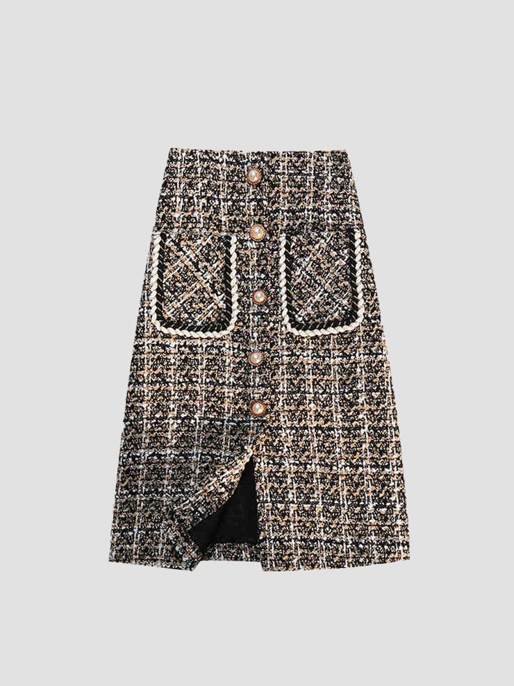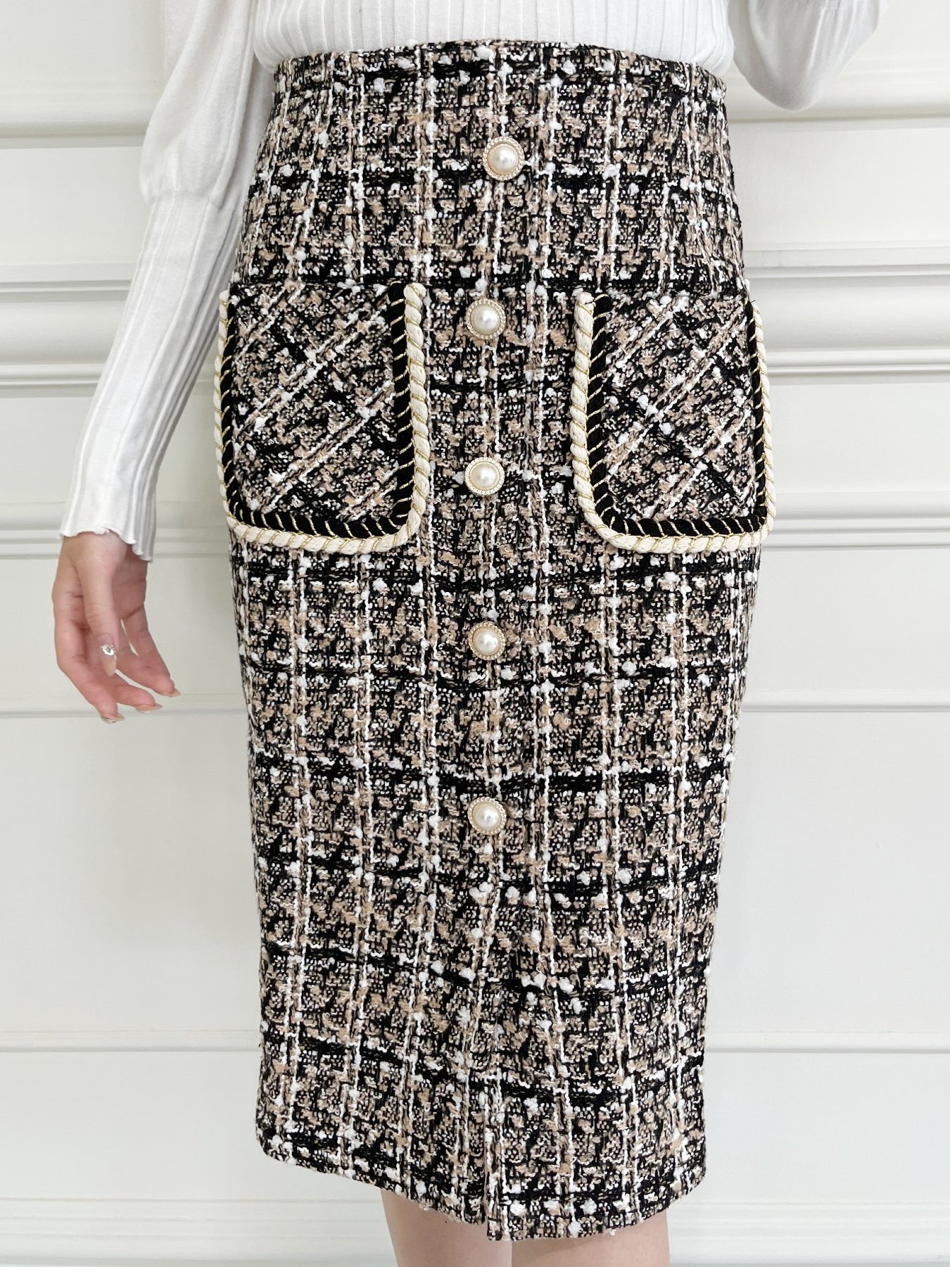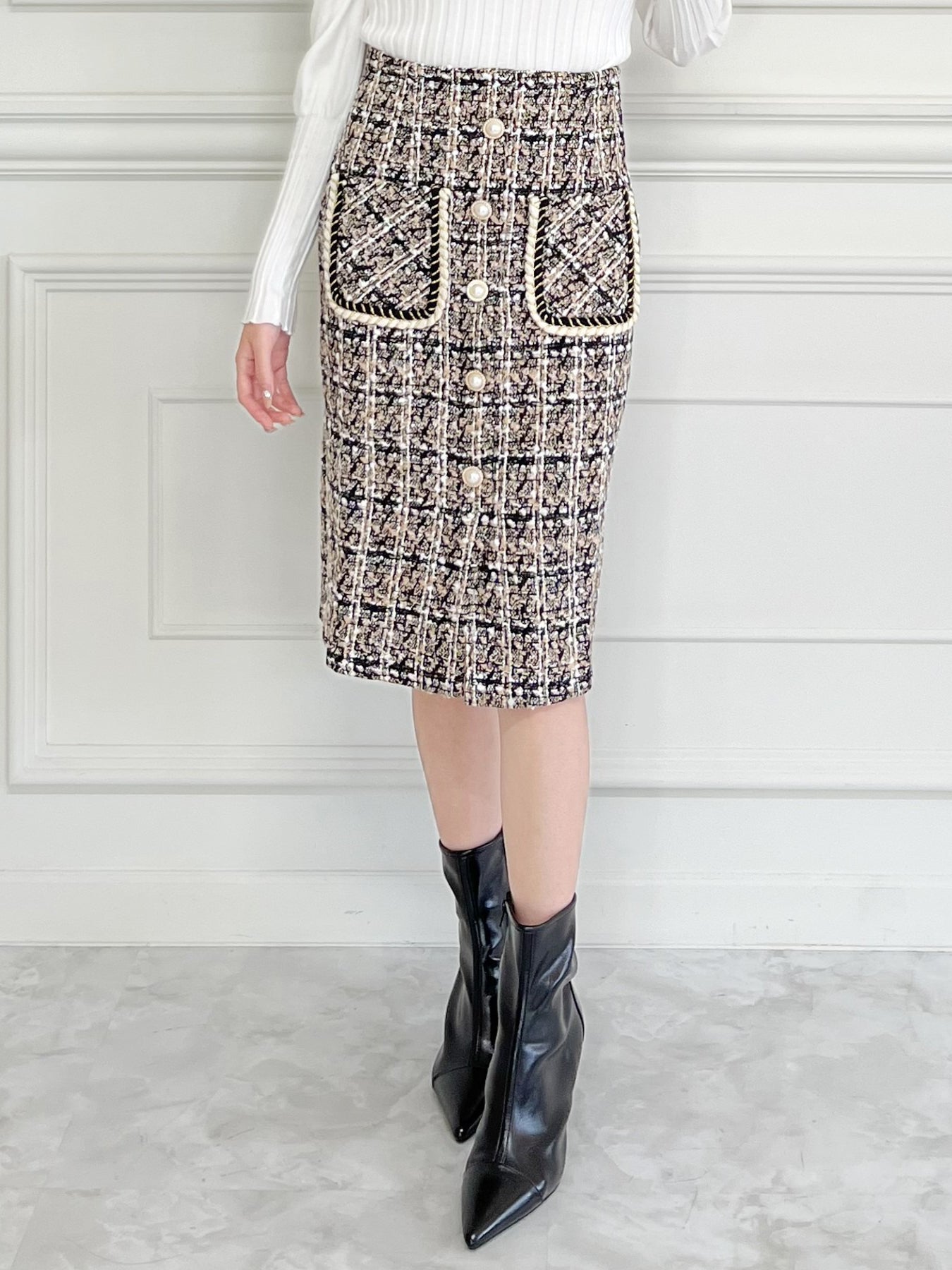 This front jewel button tweed check skirt is an elegant item that features a classic check pattern and tweed material. The jewel buttons on the front add a touch of glamour and create a feminine and elegant impression.