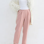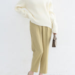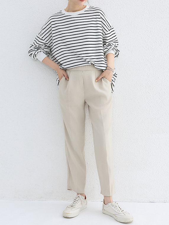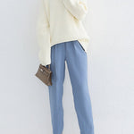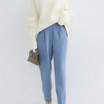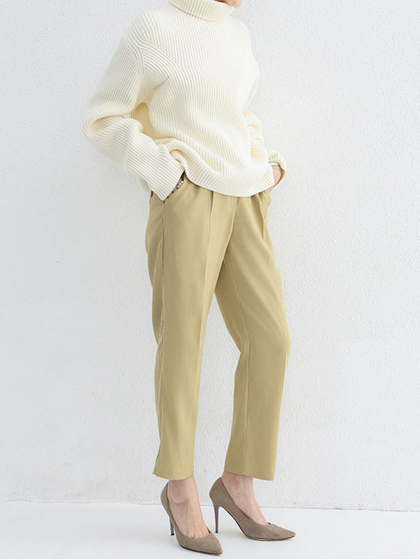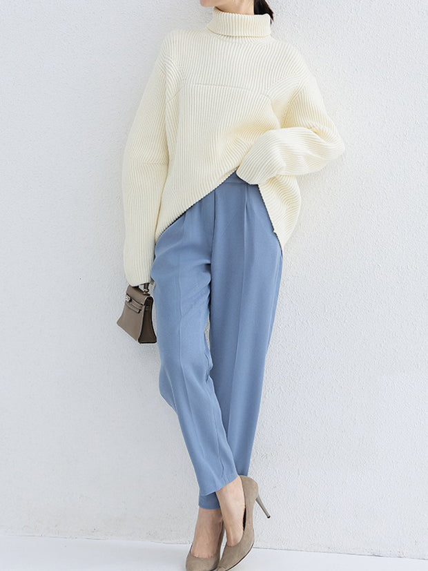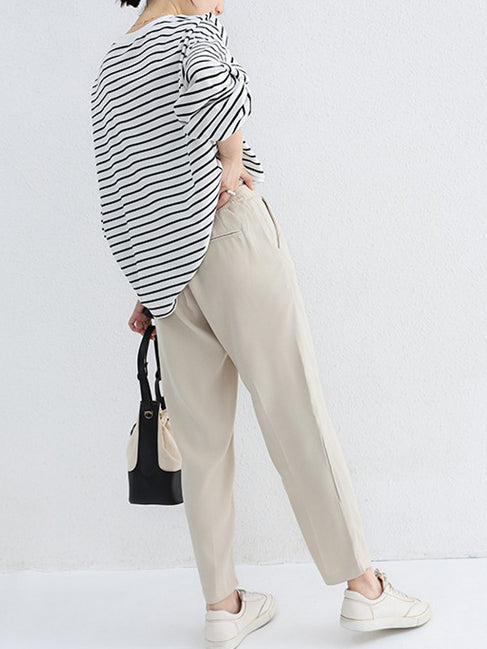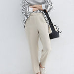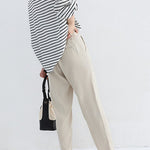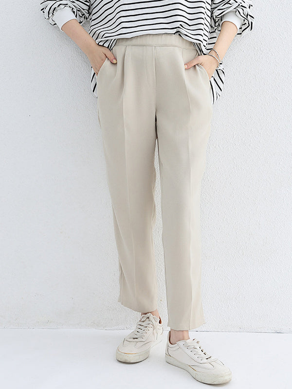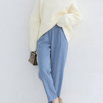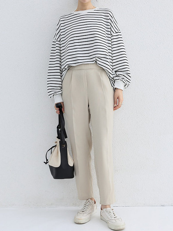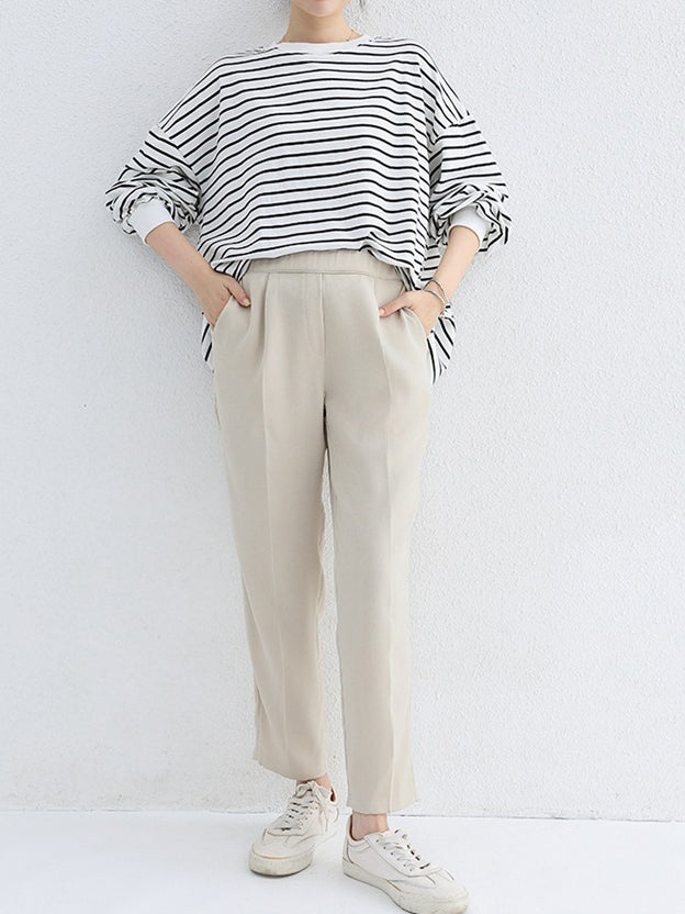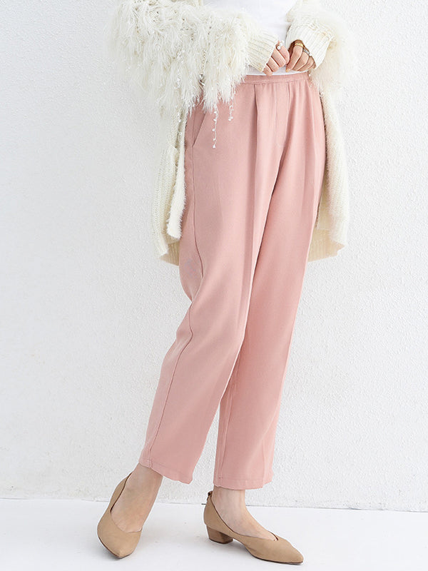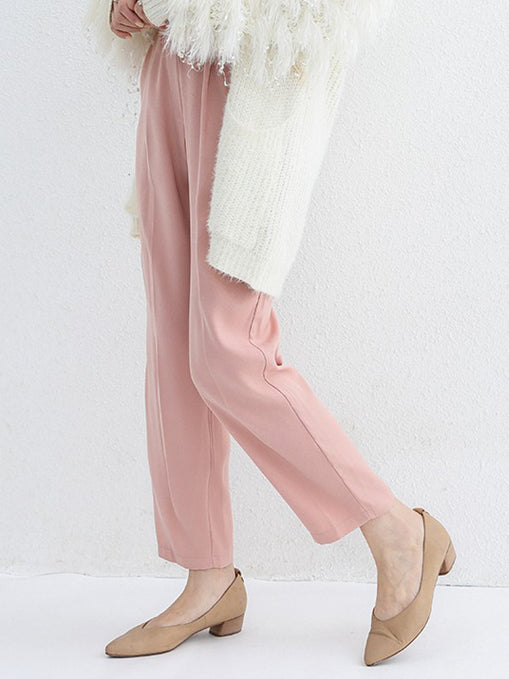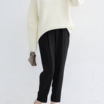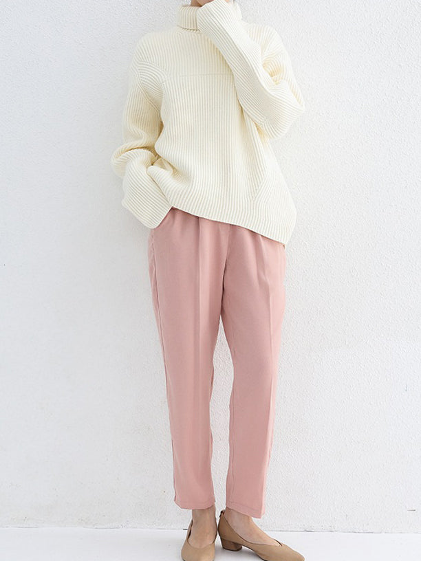 The design is neat, yet slightly loose, with a front tuck design that covers the waist and creates a beautiful leg silhouette.