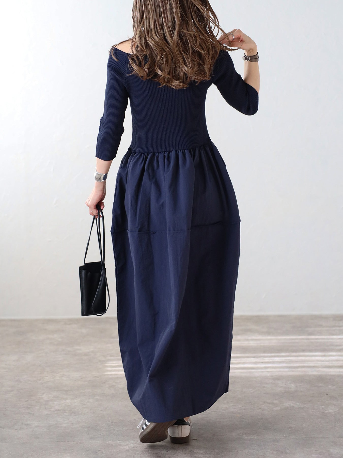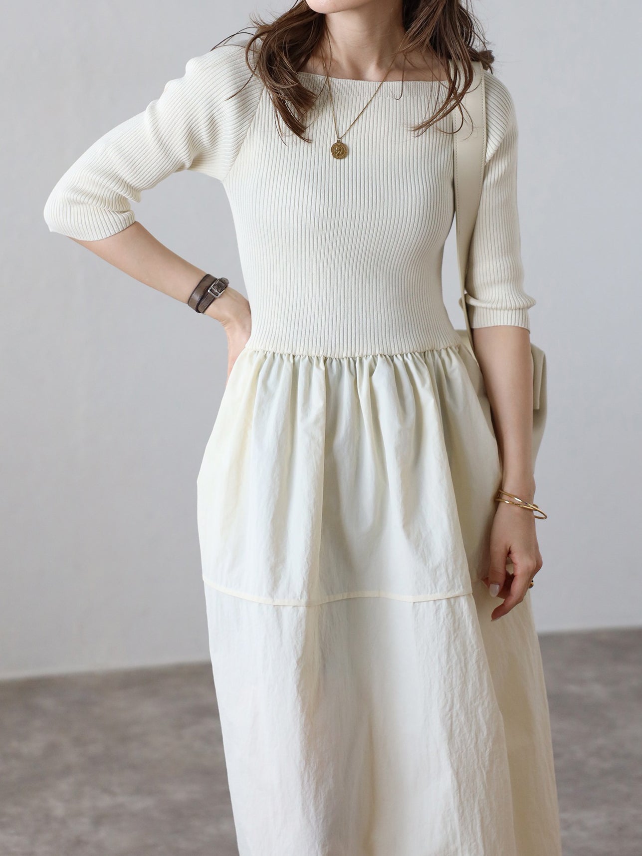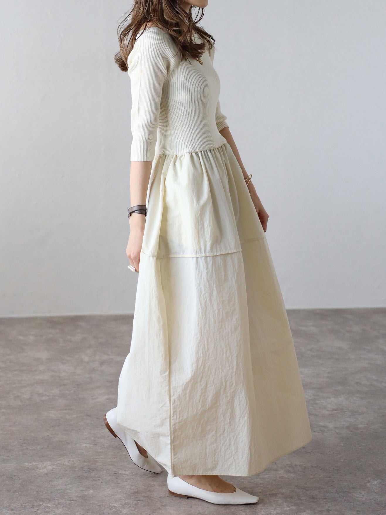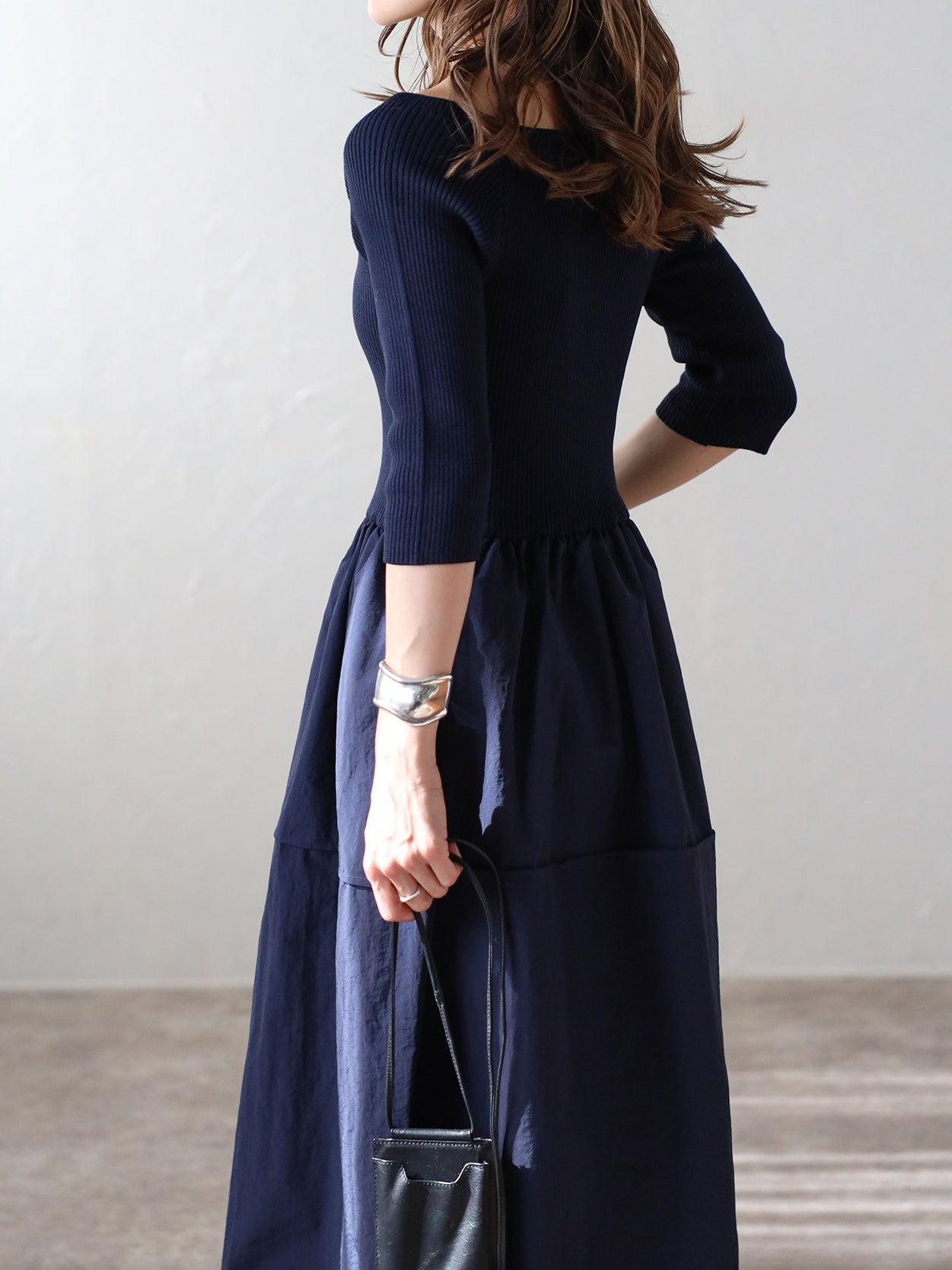 A three-quarter sleeve dress made from a combination of three-dimensional knit and nylon material.