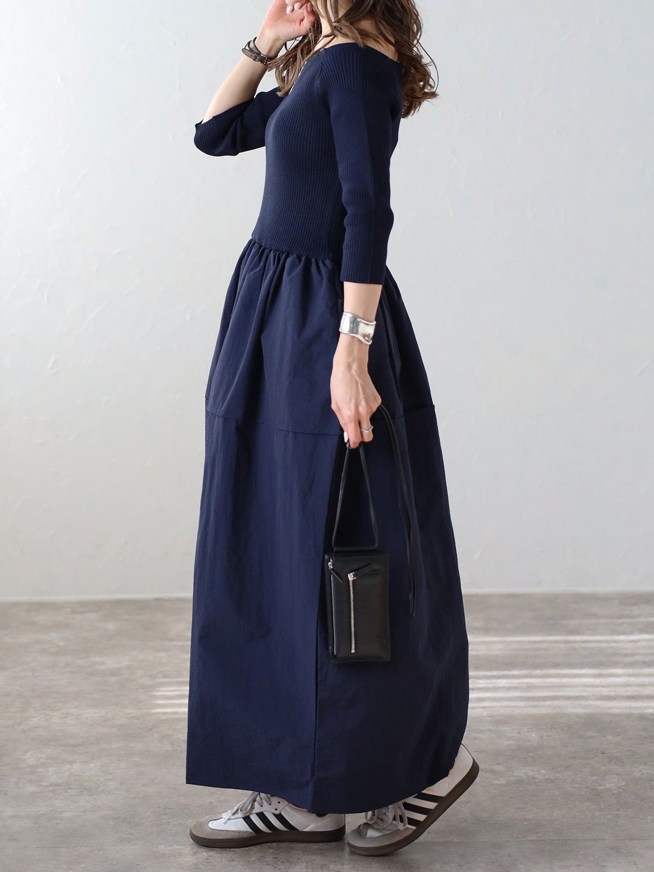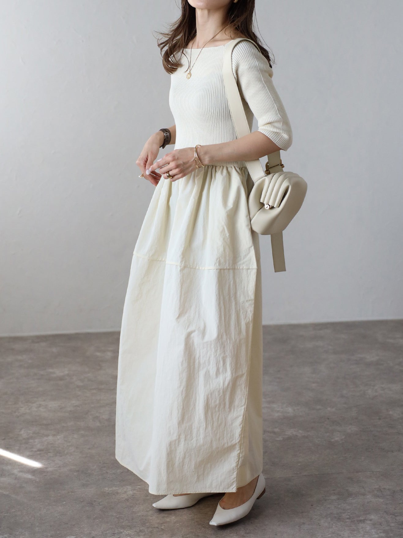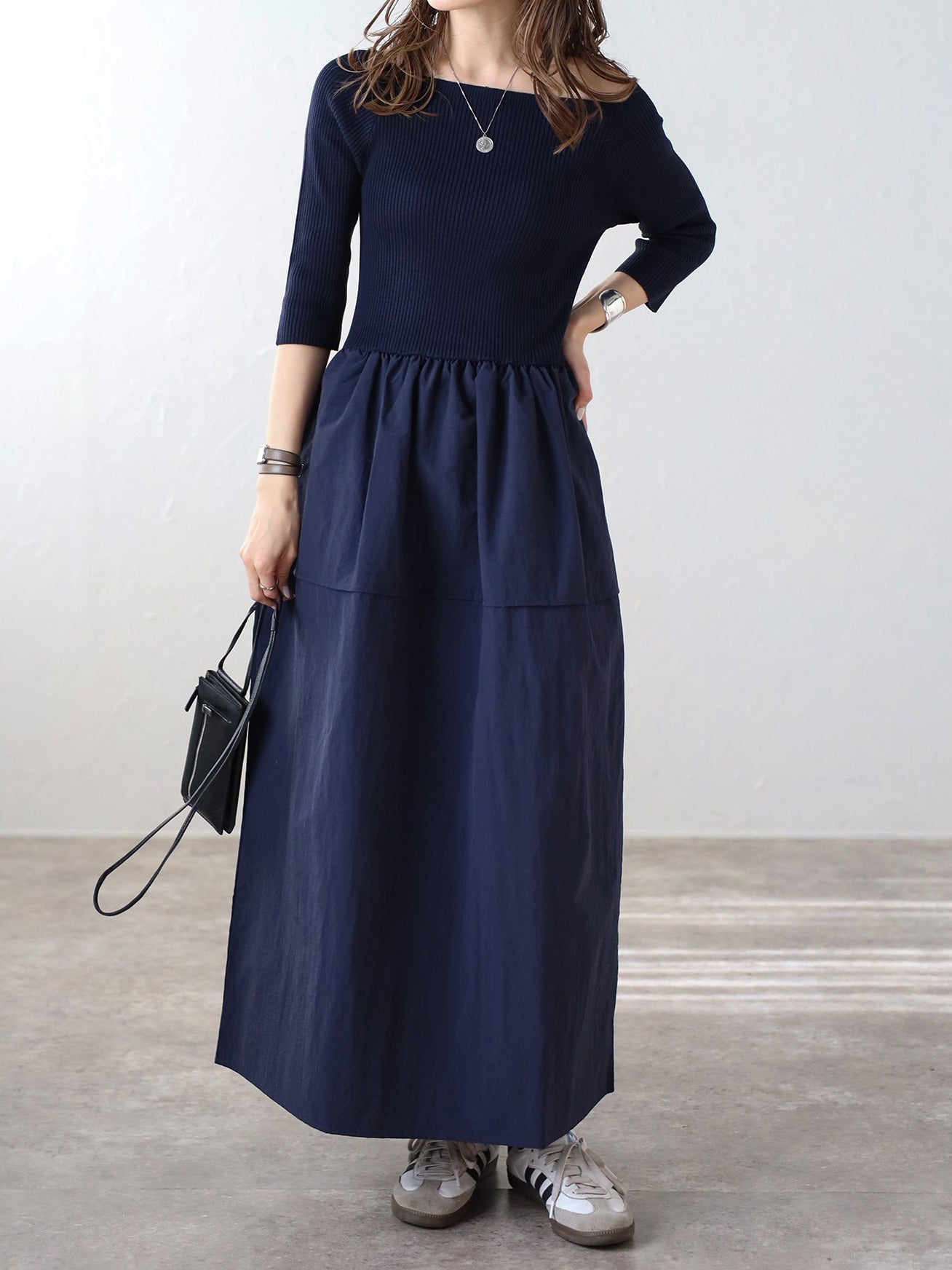 A three-quarter sleeve dress made from a combination of three-dimensional knit and nylon material.
